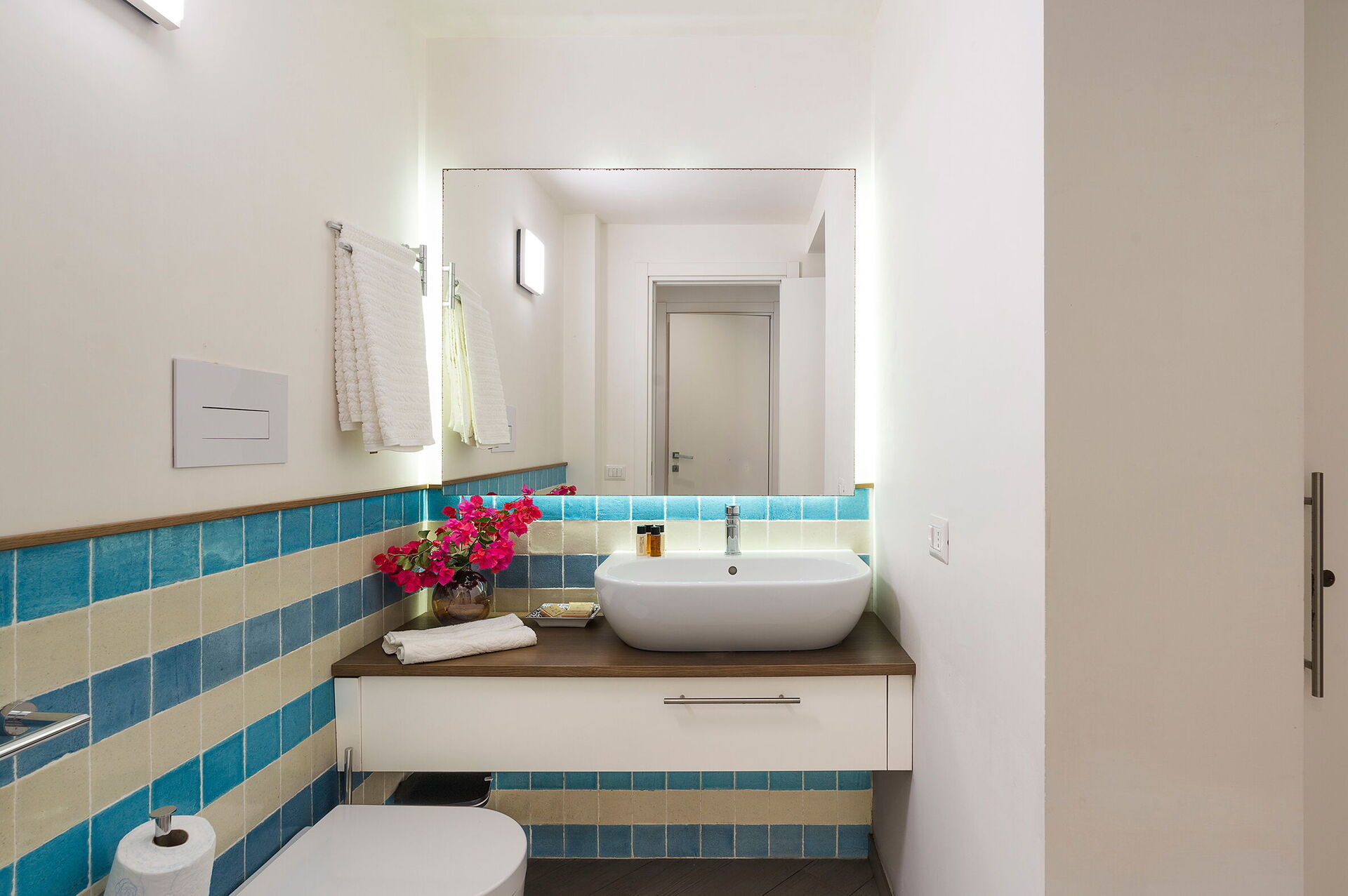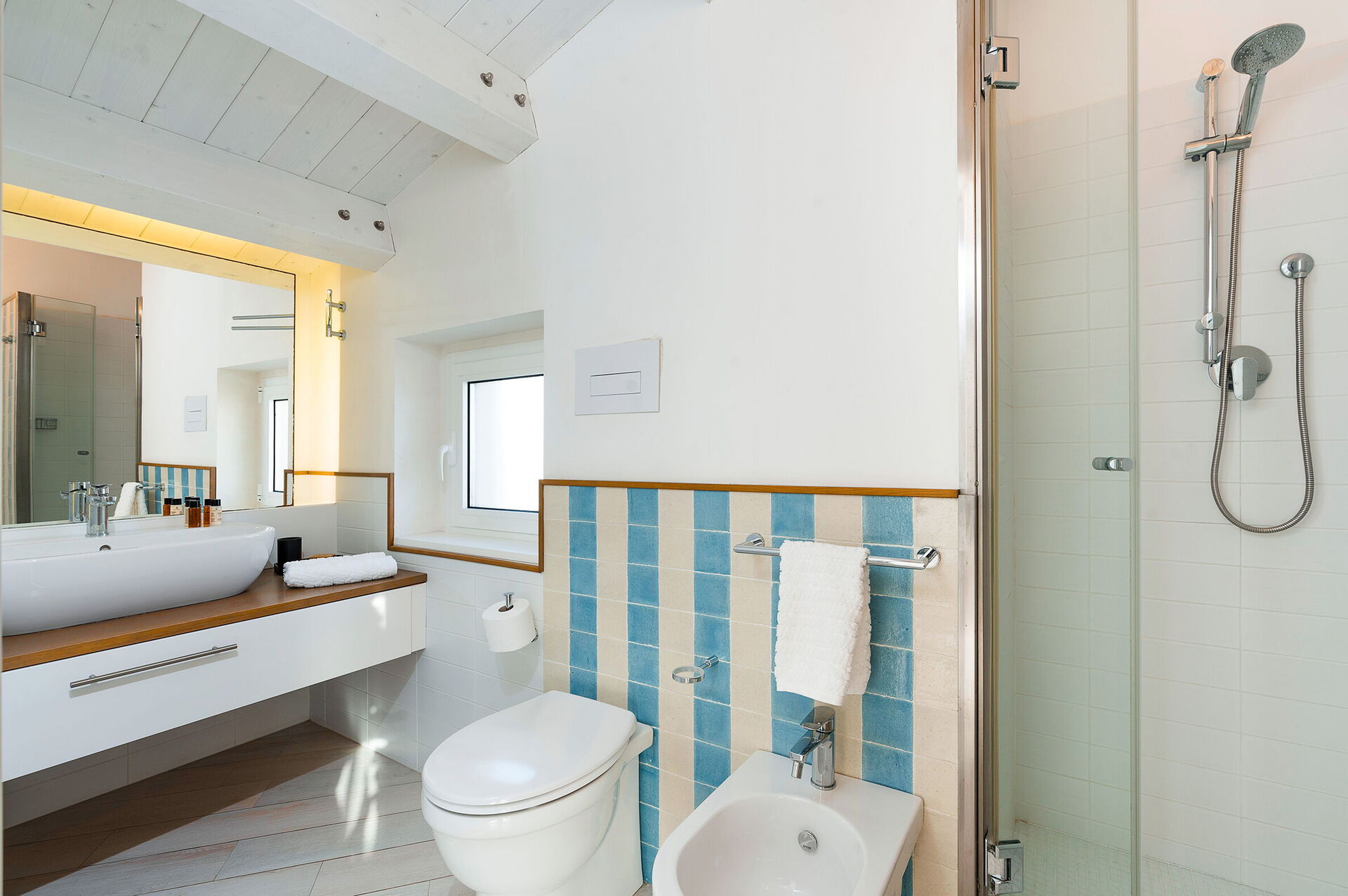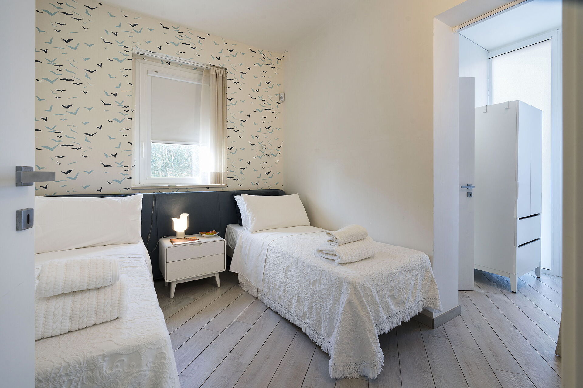 Ground floor: living room, kitchen (oven, freezer, dishwasher, coffe machine, microwave, toaster), double bedroom with private bathroom with shower, bedroom with 2 single beds with private bathroom with shower, laundry room, wellness area with sauna Jacuzzi and shower, terrace.