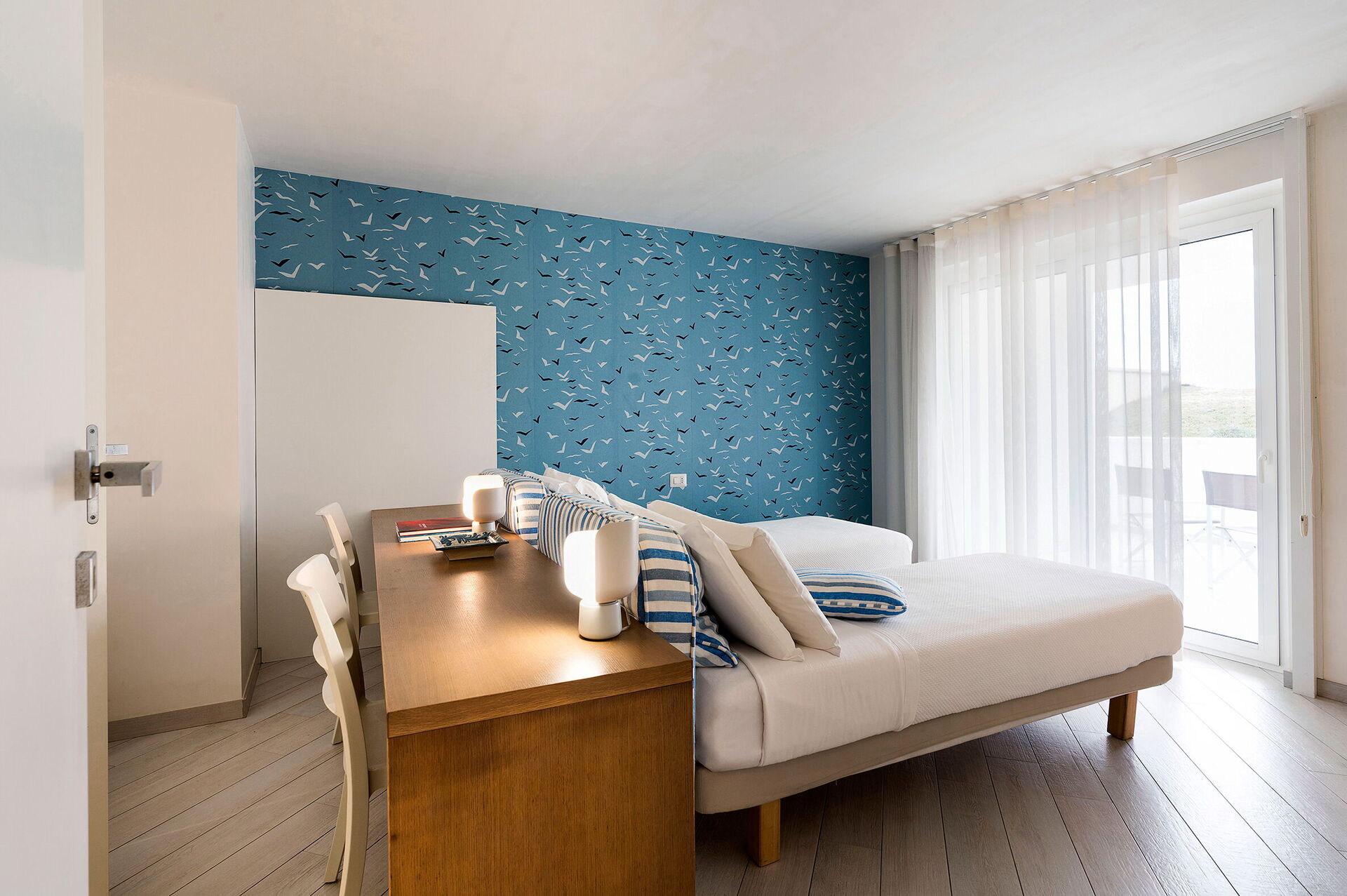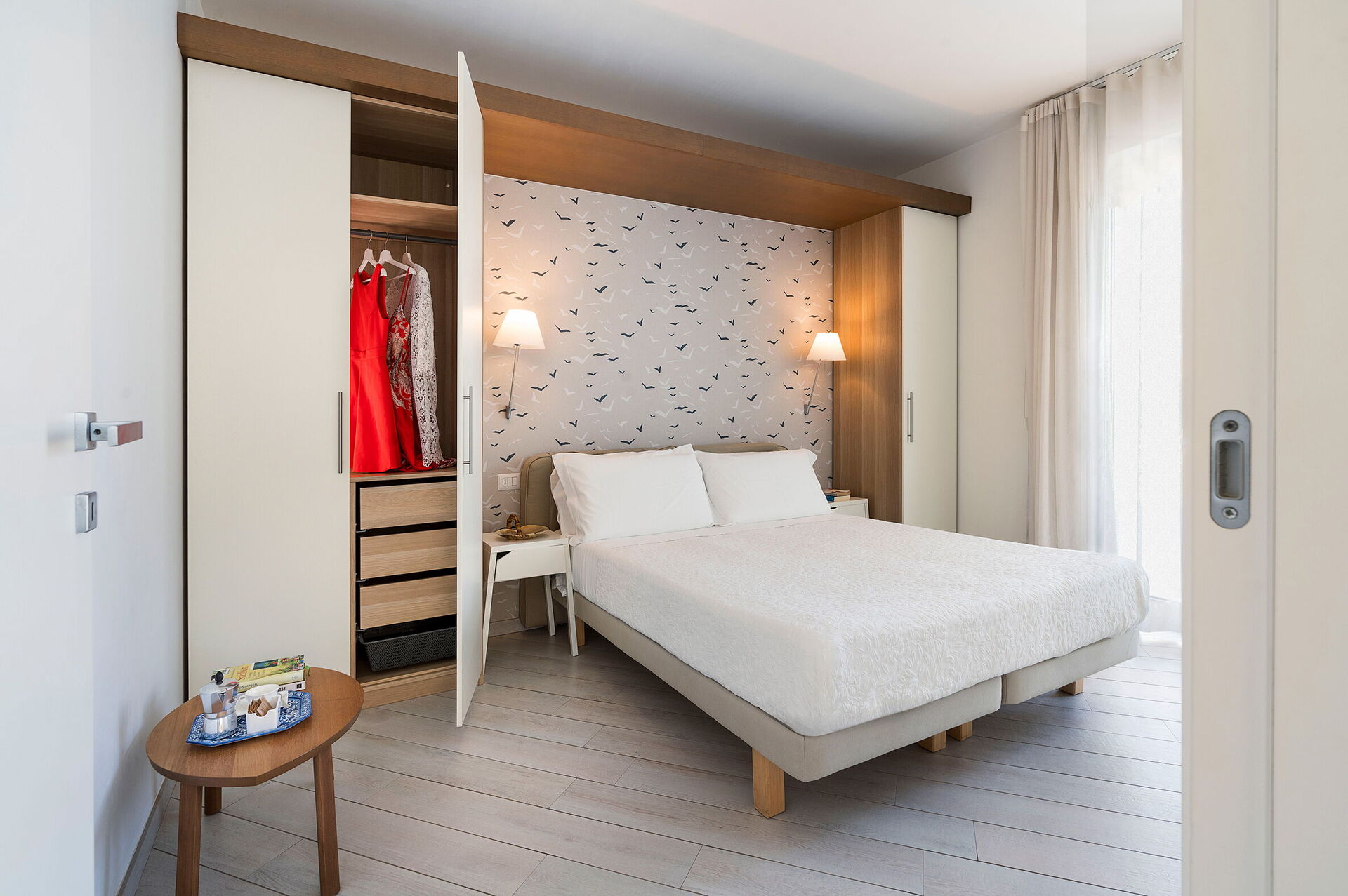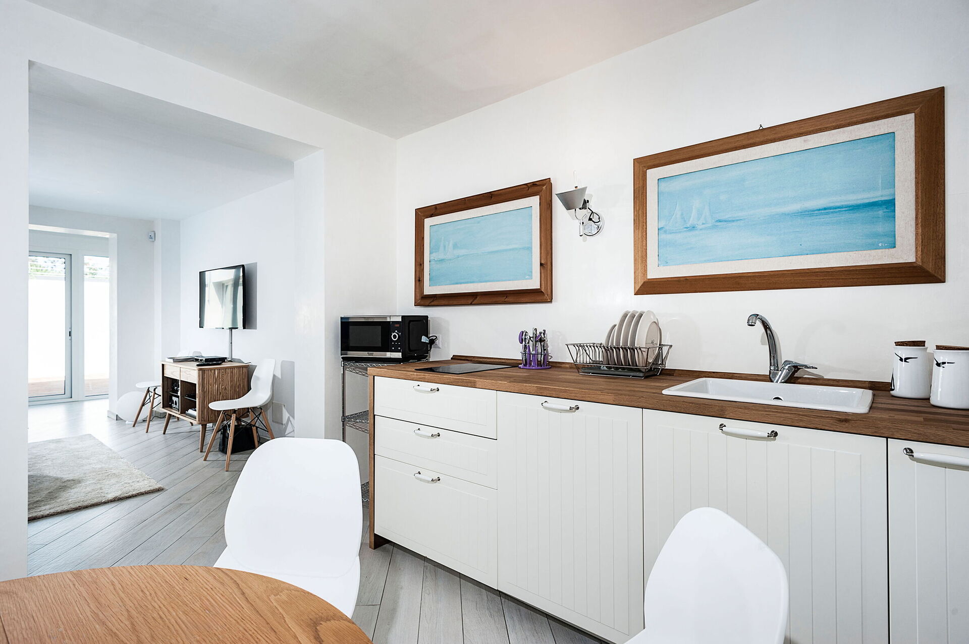 Ground floor: living room, kitchen (oven, freezer, dishwasher, coffe machine, microwave, toaster), double bedroom with private bathroom with shower, bedroom with 2 single beds with private bathroom with shower, laundry room, wellness area with sauna Jacuzzi and shower, terrace.