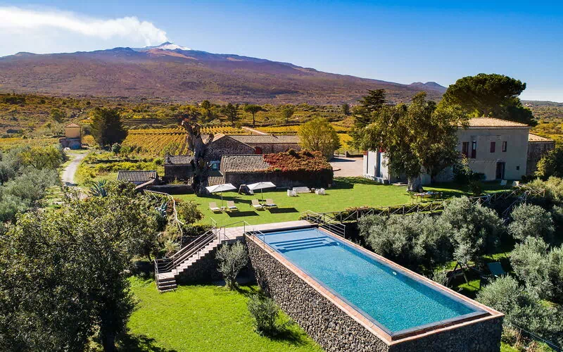 It is nestled in the countryside among the lush vineyards of the Etna wine route. It boasts sweeping views spanning the Alcantara River, Nebrodi Park and Mount Etna.