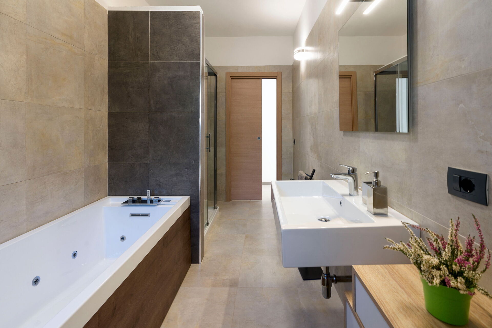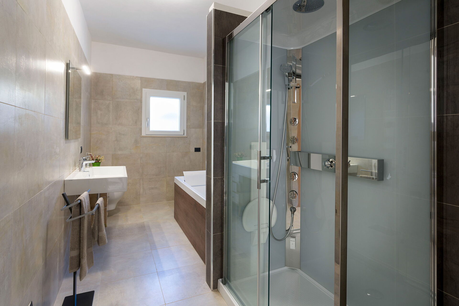 Ground floor: kitchen (cooktop, oven, freezer, refrigerator, dishwasher, microwave, toaster, espresso coffee maker, American coffee maker, tv and screen) with dining area with veranda access, living room with single sofa bed (air conditioning, screen), double bedroom (air conditioning, screen), private bathroom with whirlpool bathtub and multifunctional shower.