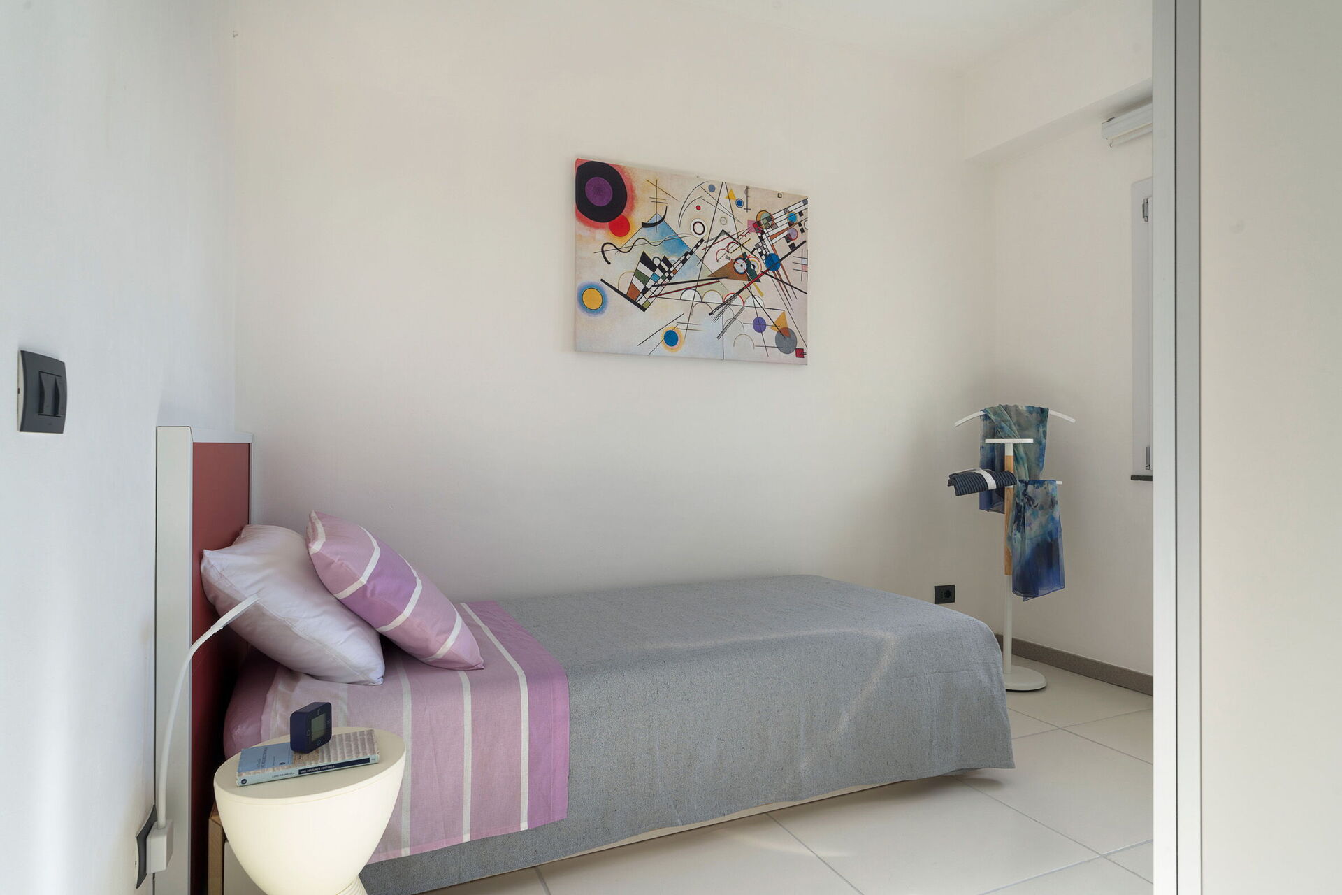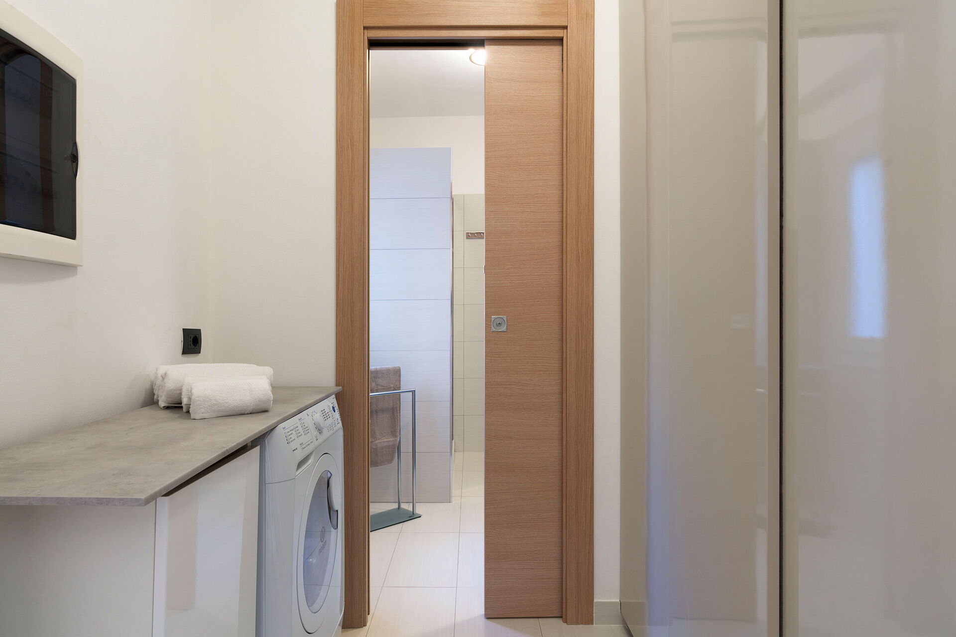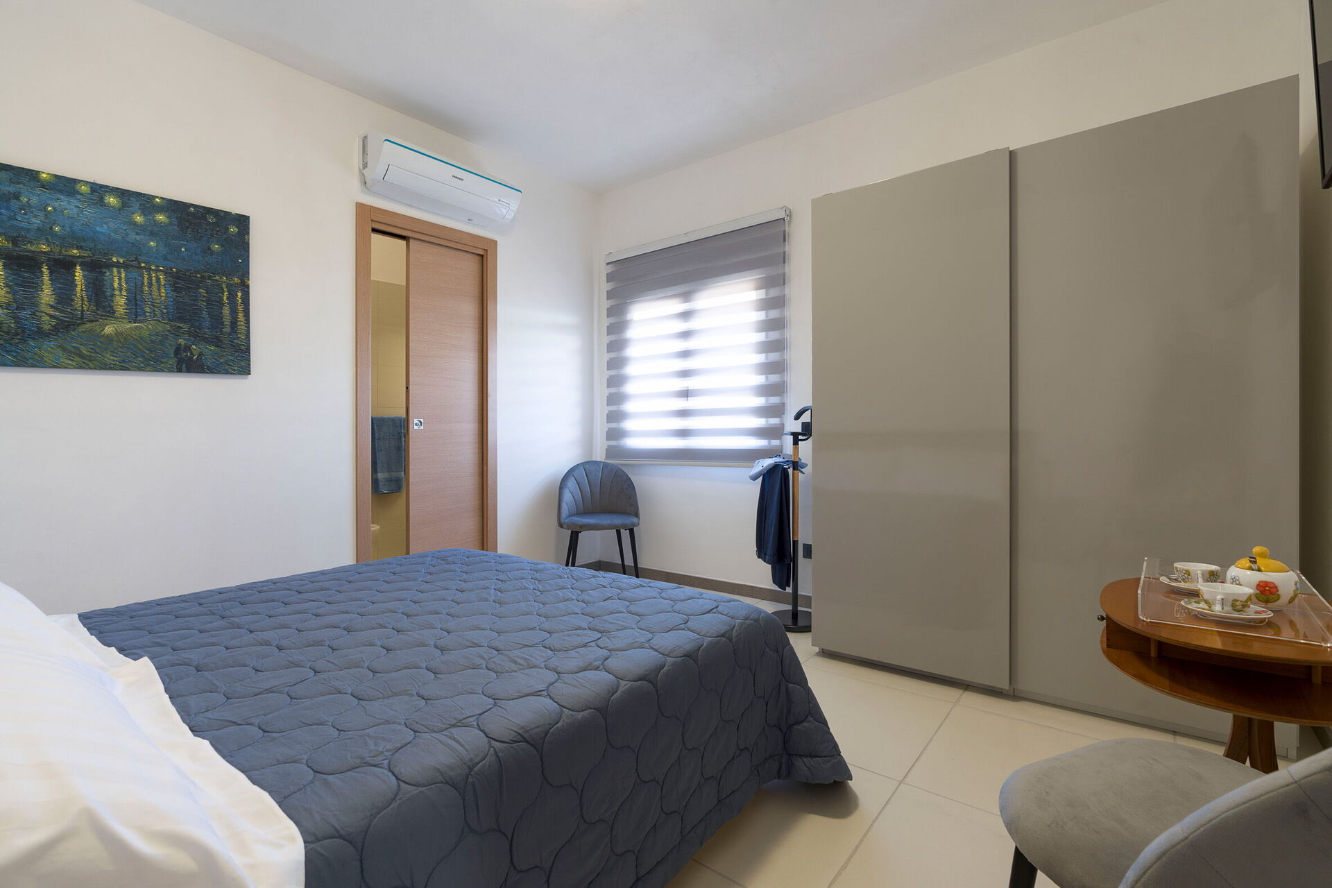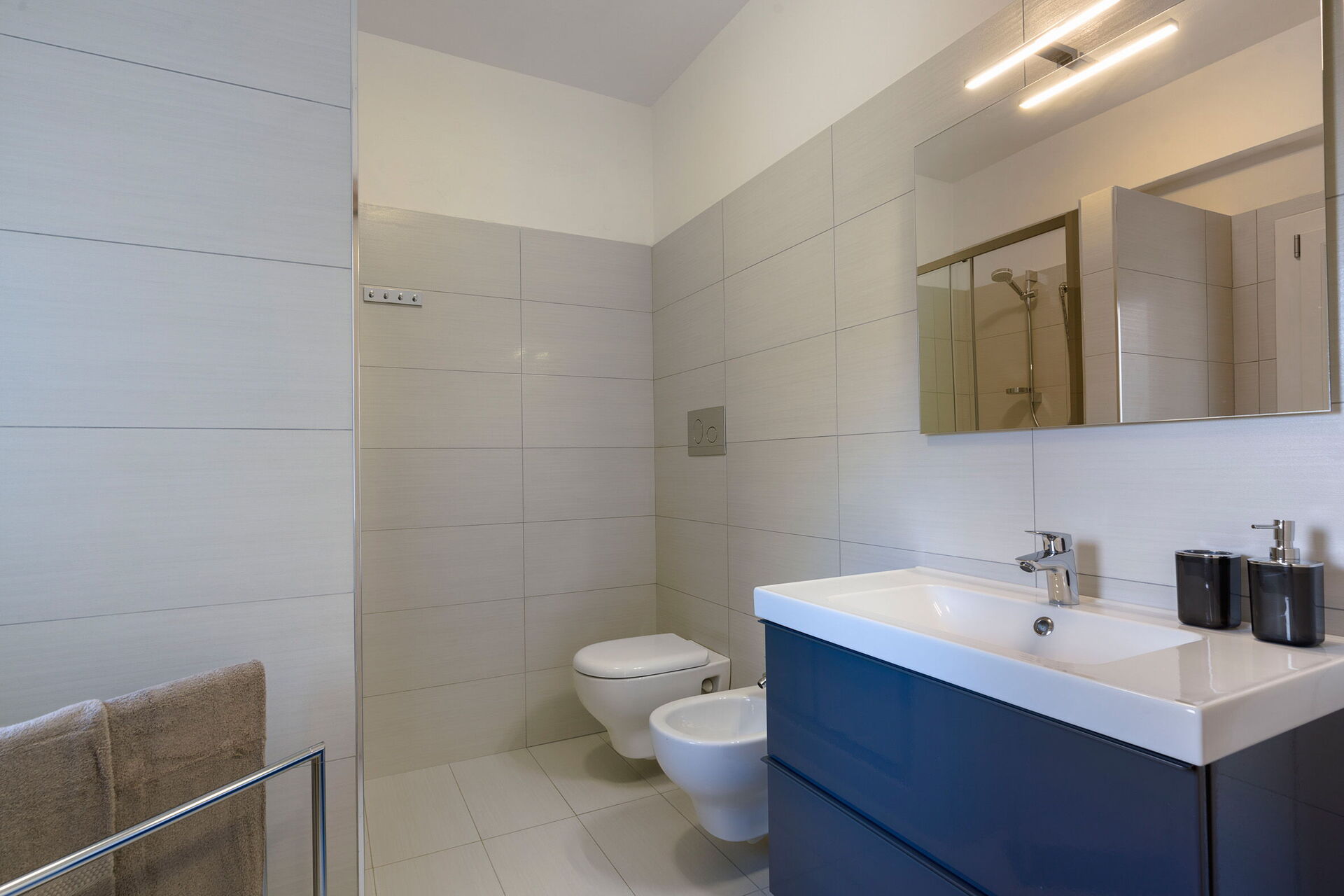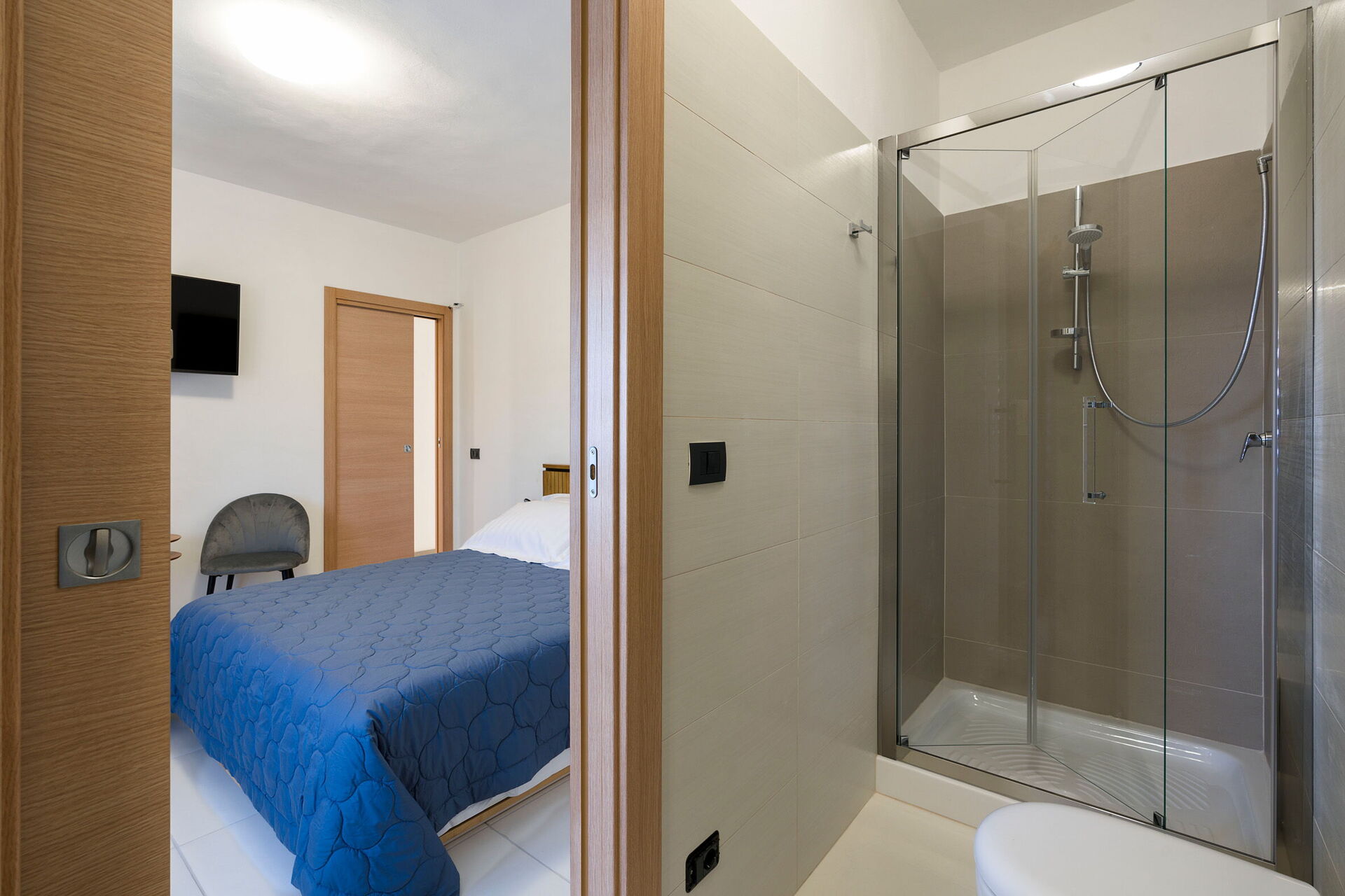First floor: (accessible only from the outside, and not connected inside to the rest of the villa): large living room (air conditioning, tv, screen) with dining area and access to the scenic terrace, kitchen (cooktop, oven, freezer, refrigerator, dishwasher, toaster, espresso coffee maker), double bedroom (air conditioning, screen) with private bathroom with shower, 2 bedrooms each with a single bed (air conditioning, screen), bathroom with shower, laundry room.