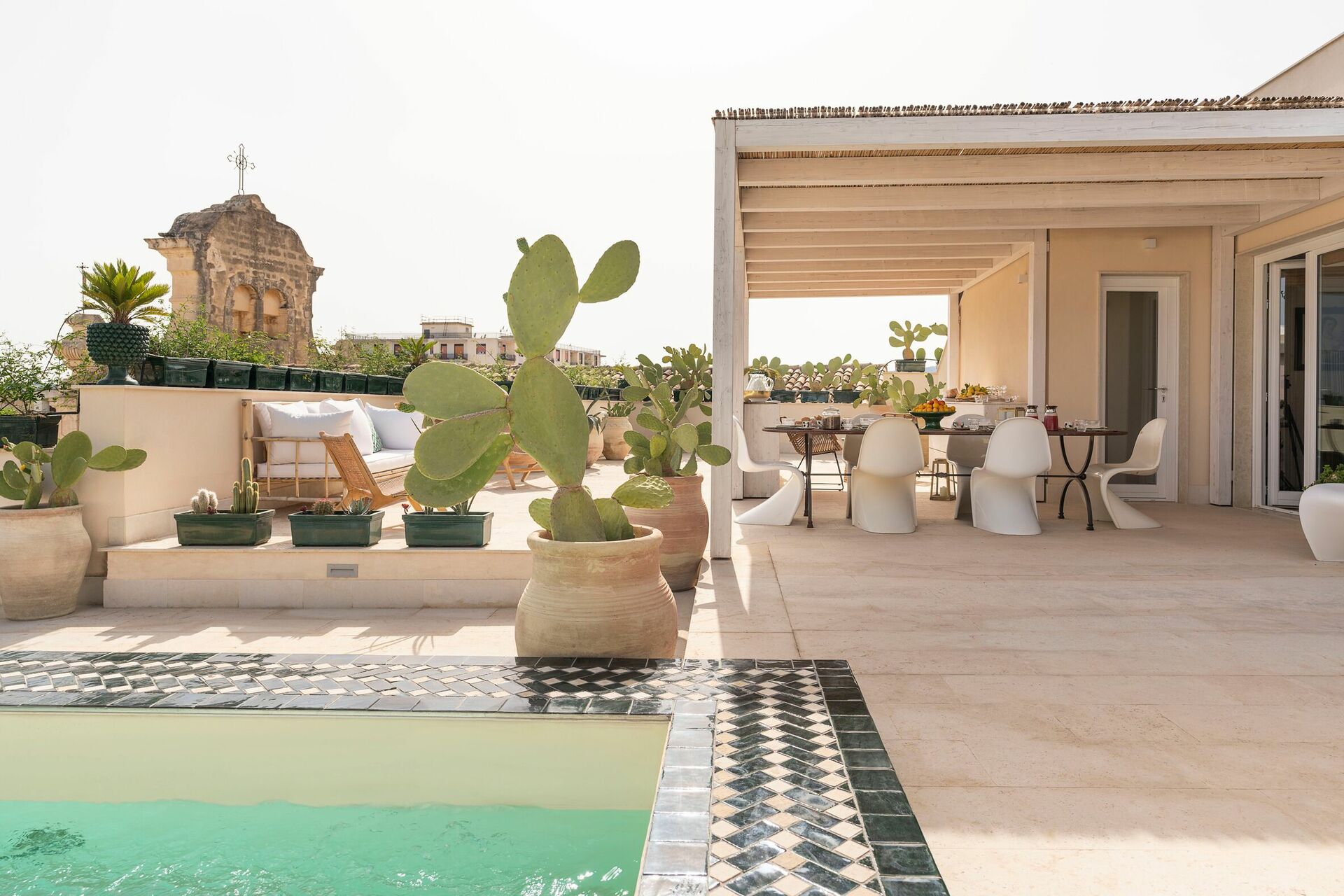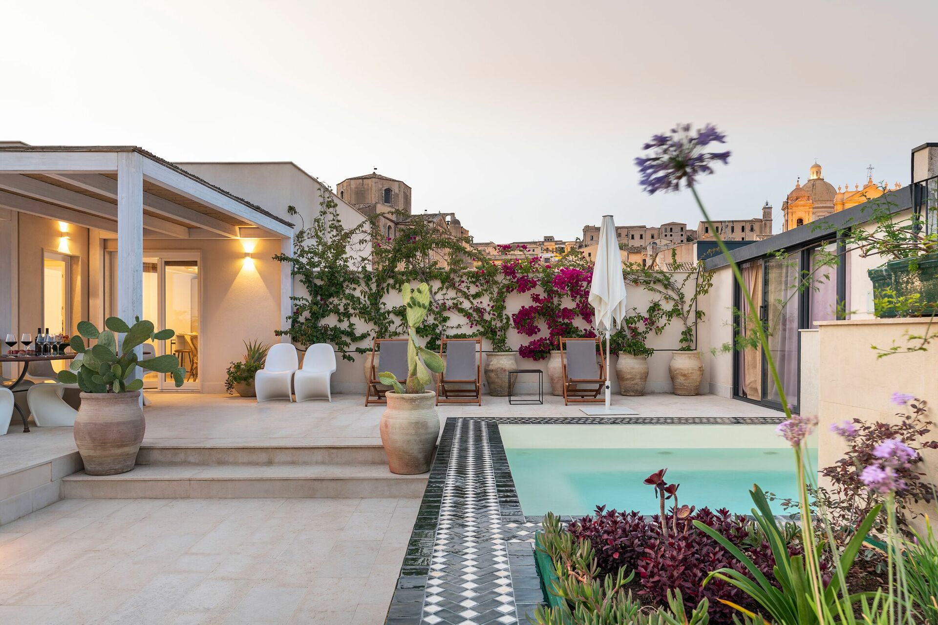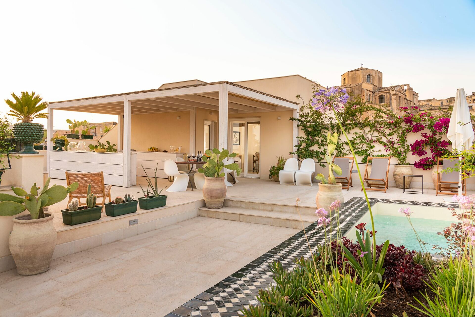 Located on the second and third floors of a prestigious elevator building, this exclusive vacation apartment rental in Sicily offers a large terrace with mini pool and a splendid view of the old city center rooftops.