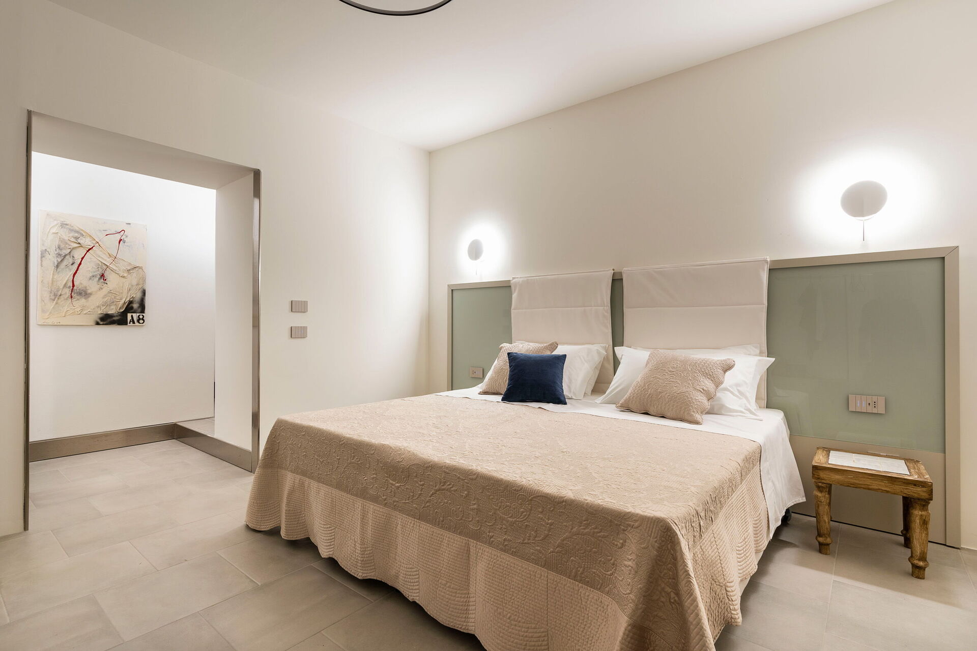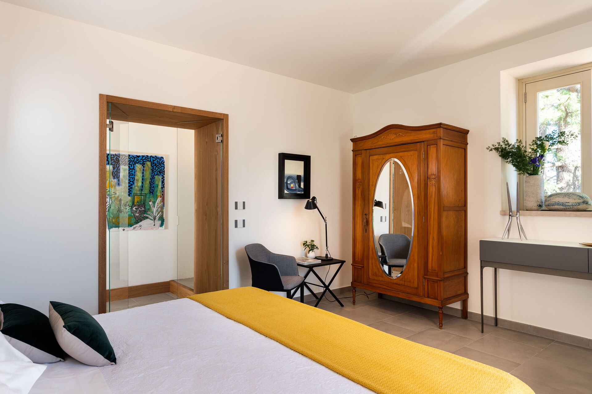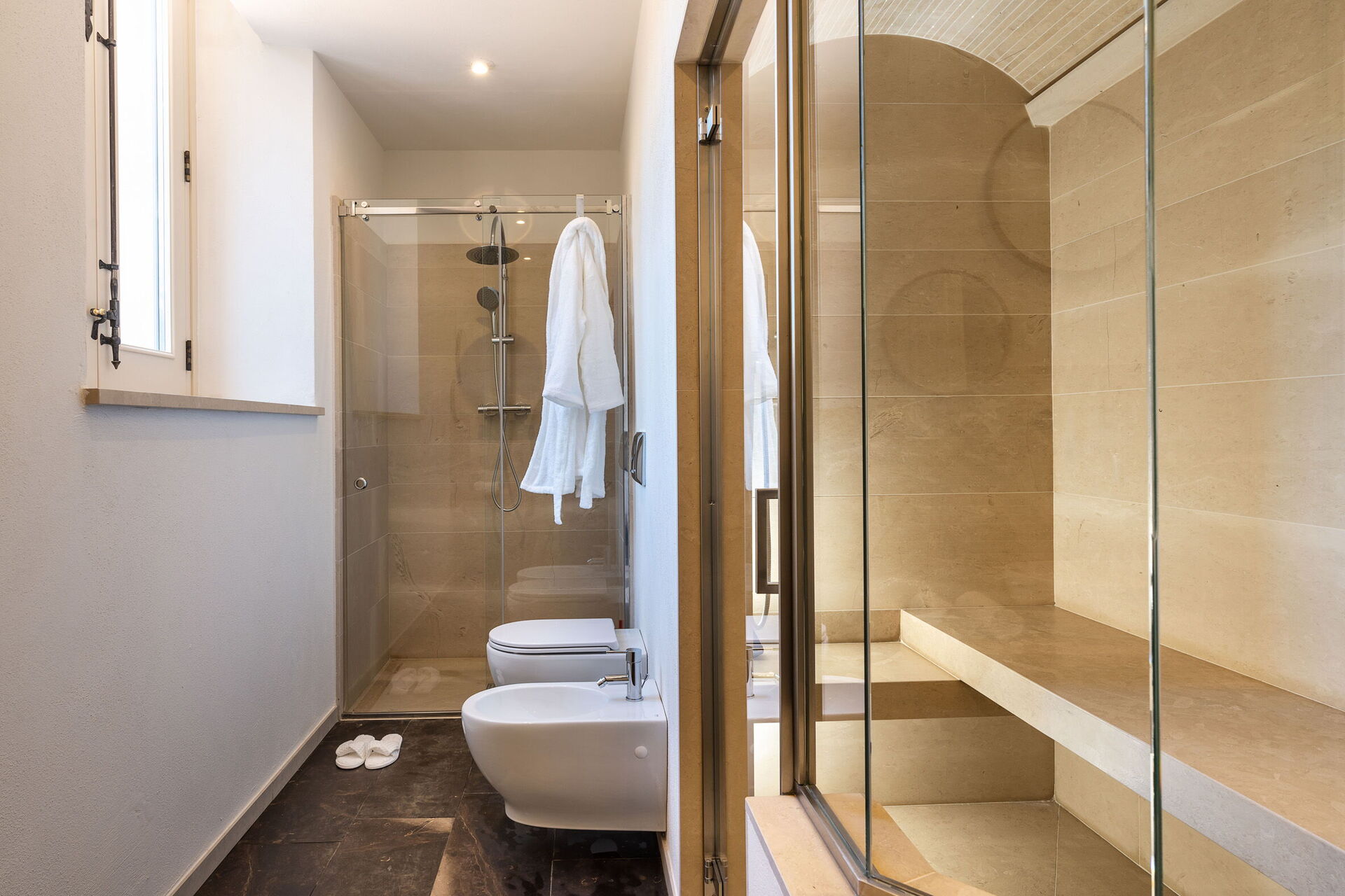 Ground floor (accessible only from the outside and not connected internally to the rest of the villa): 1 double bedroom (king-size bed, minibar) with living area with double sofa bed and private bathroom with shower, 1 double bedroom (king-size bed) with en suite bathroom with shower, 2 double bedrooms (convertible into twin-bedded rooms on request) with en suite bathroom with shower.