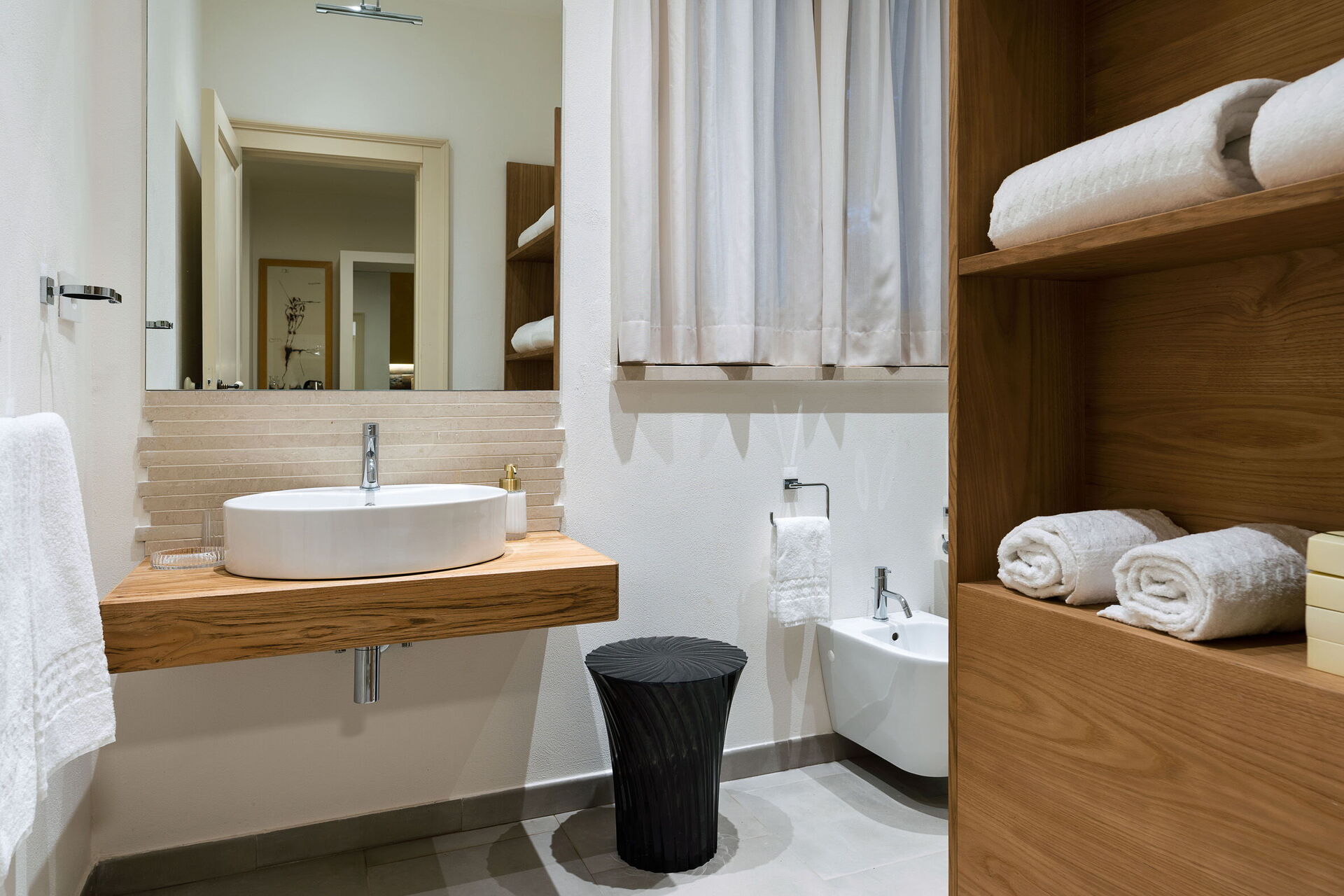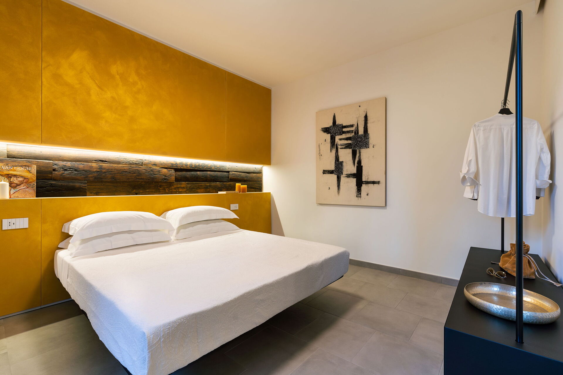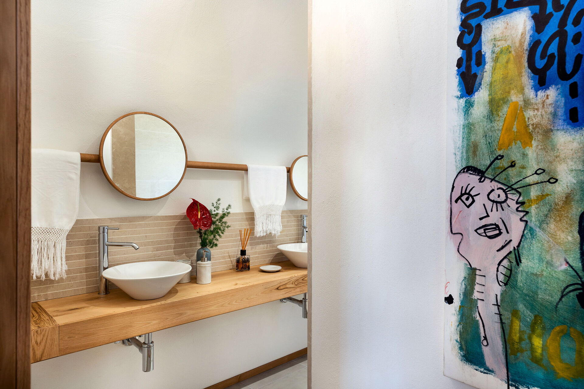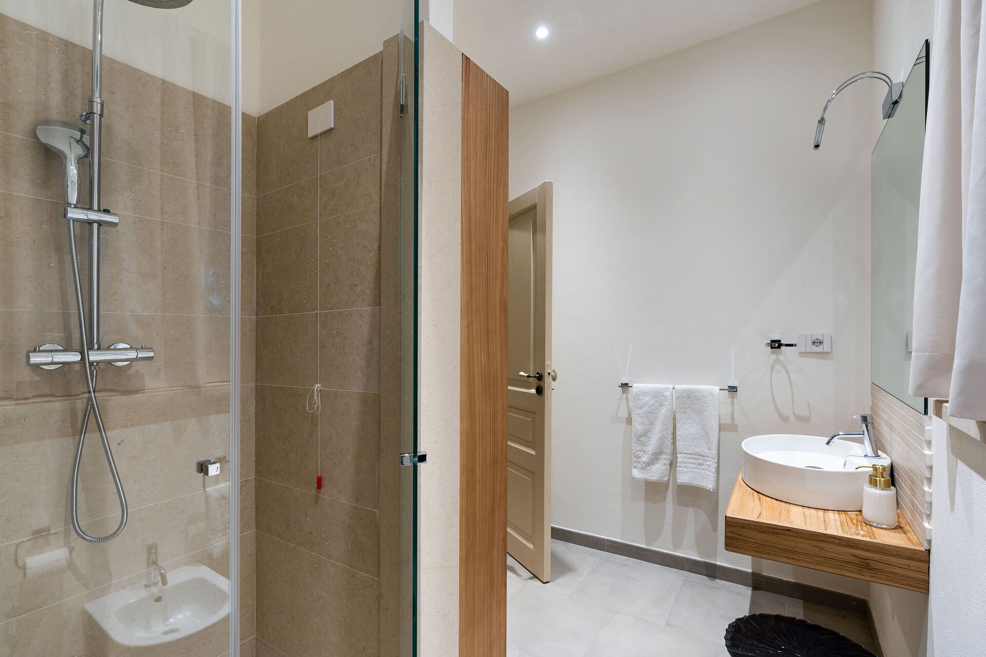 Ground floor (accessible only from the outside and not connected internally to the rest of the villa): 1 double bedroom (king-size bed, minibar) with living area with double sofa bed and private bathroom with shower, 1 double bedroom (king-size bed) with en suite bathroom with shower, 2 double bedrooms (convertible into twin-bedded rooms on request) with en suite bathroom with shower.