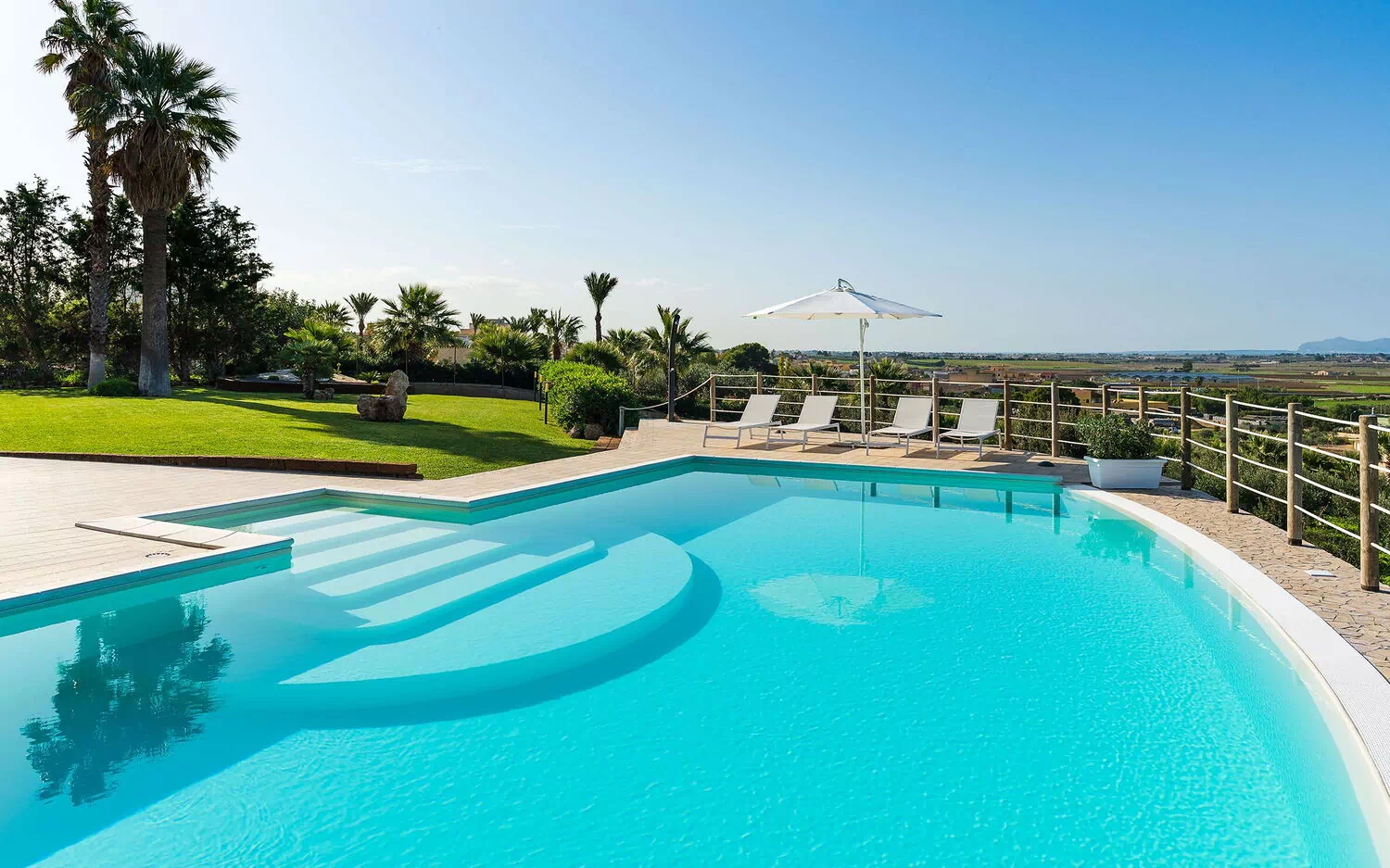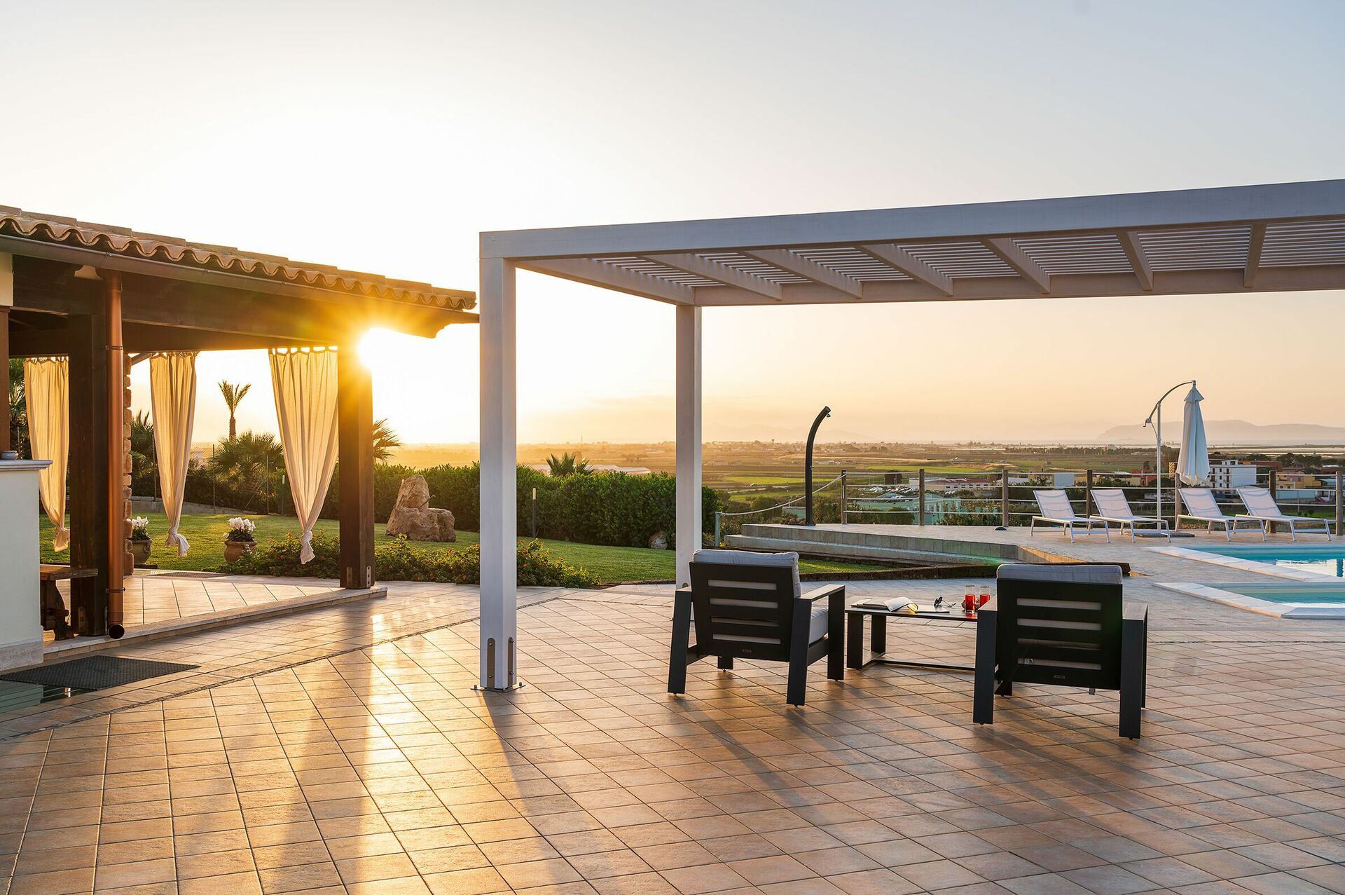 Surrounded by a meticulously landscaped garden and expansive, stylishly furnished terraces, this elegant retreat offers breathtaking views stretching from Mount Erice to the salt flats of Trapani and Paceco, and out to the shimmering Aegadian Islands.
