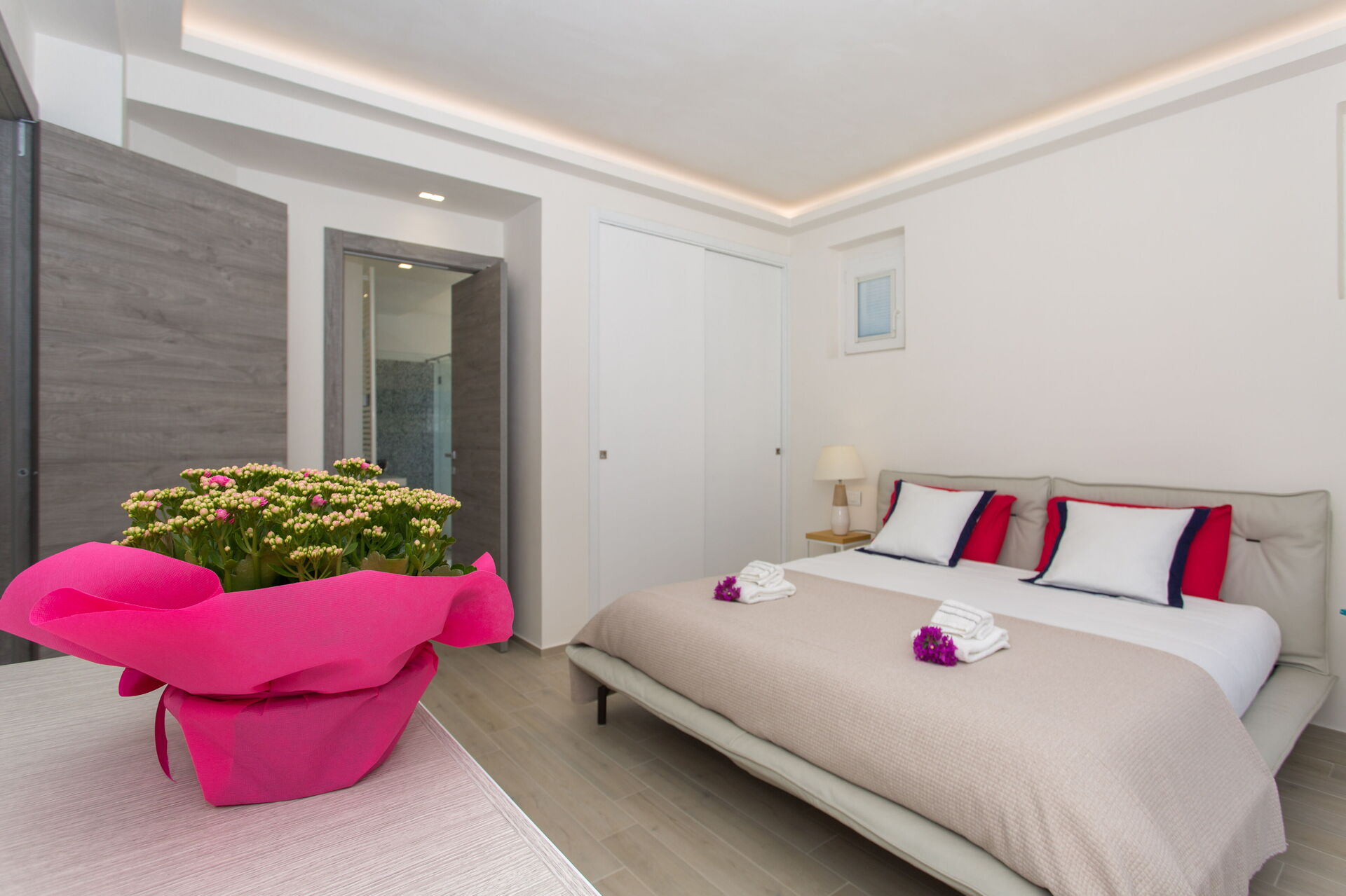 First floor: double bedroom with king size bed and private bathroom with shower, triple bedroom with double bed and single bed, bedroom with 2 small double beds, bedroom with small double bed, 1 bathroom with shower. Each of the 4 bedrooms has access to a private balcony, which can also be reached by an outdoor staircase on the pool side of the house.