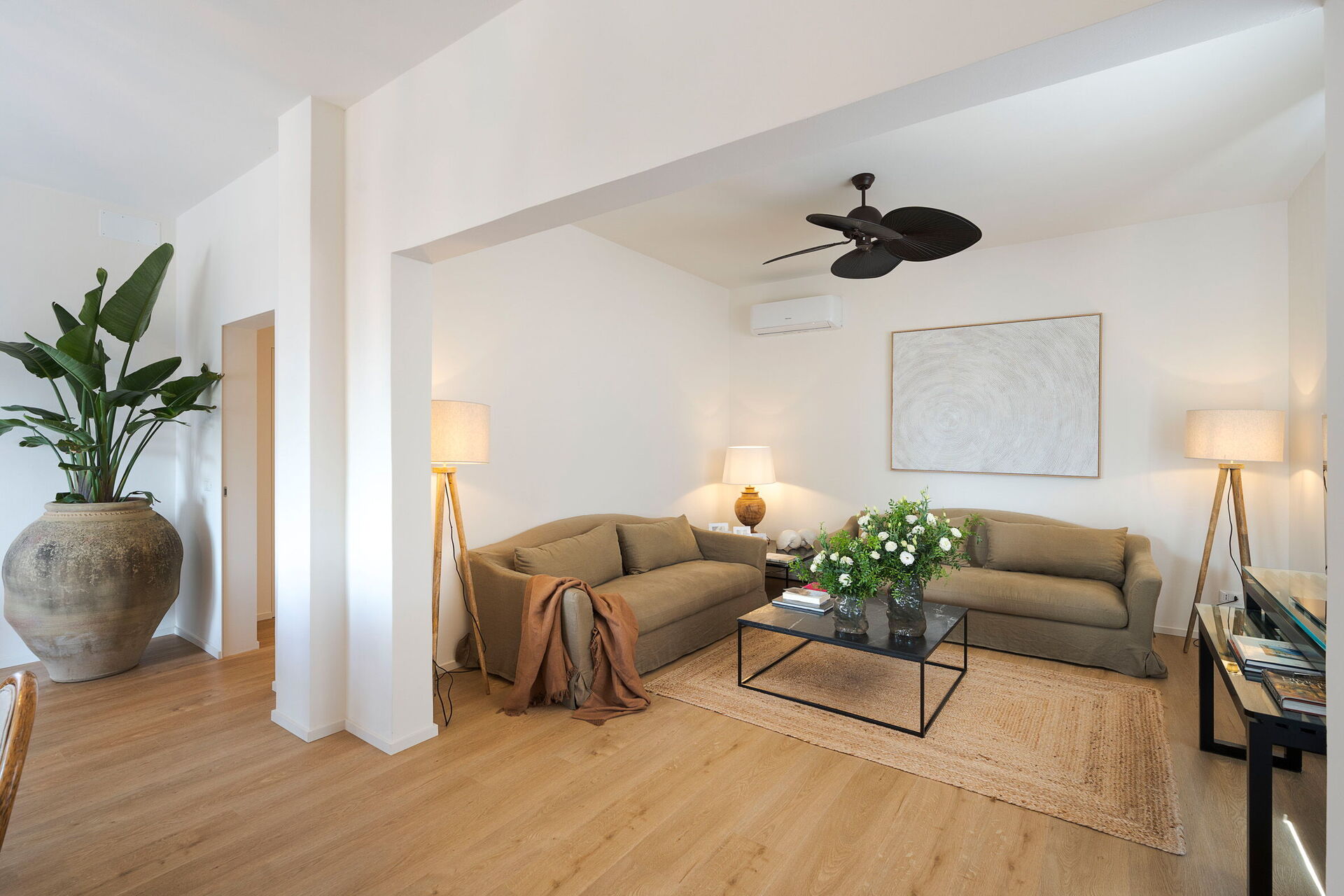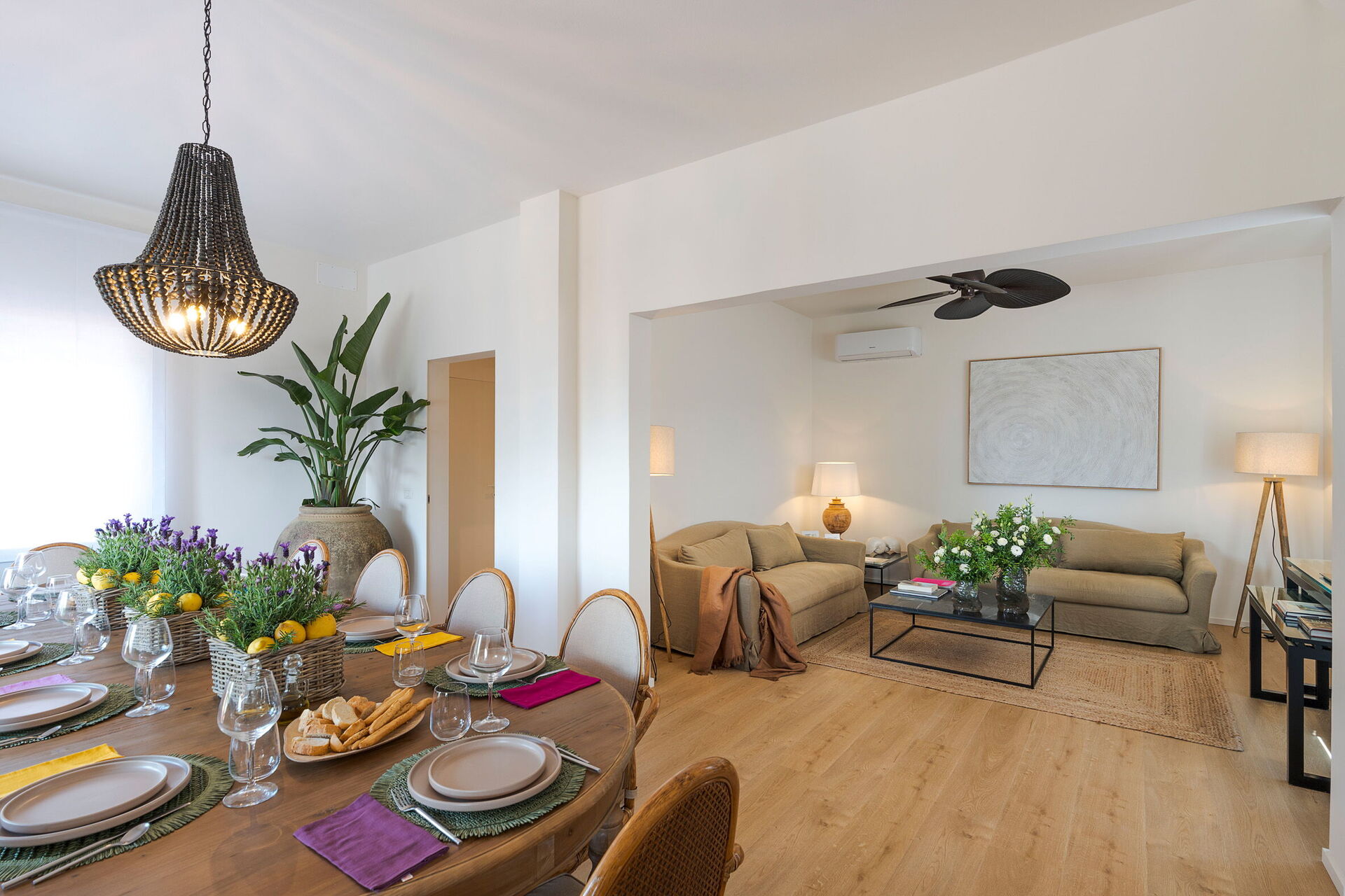 First floor: large living room (TV, air conditioning) with dining area, kitchen (hotplates, oven, freezer, dishwasher, coffee machine, microwave, fridge) double bedroom (air conditioning), bathroom with shower.