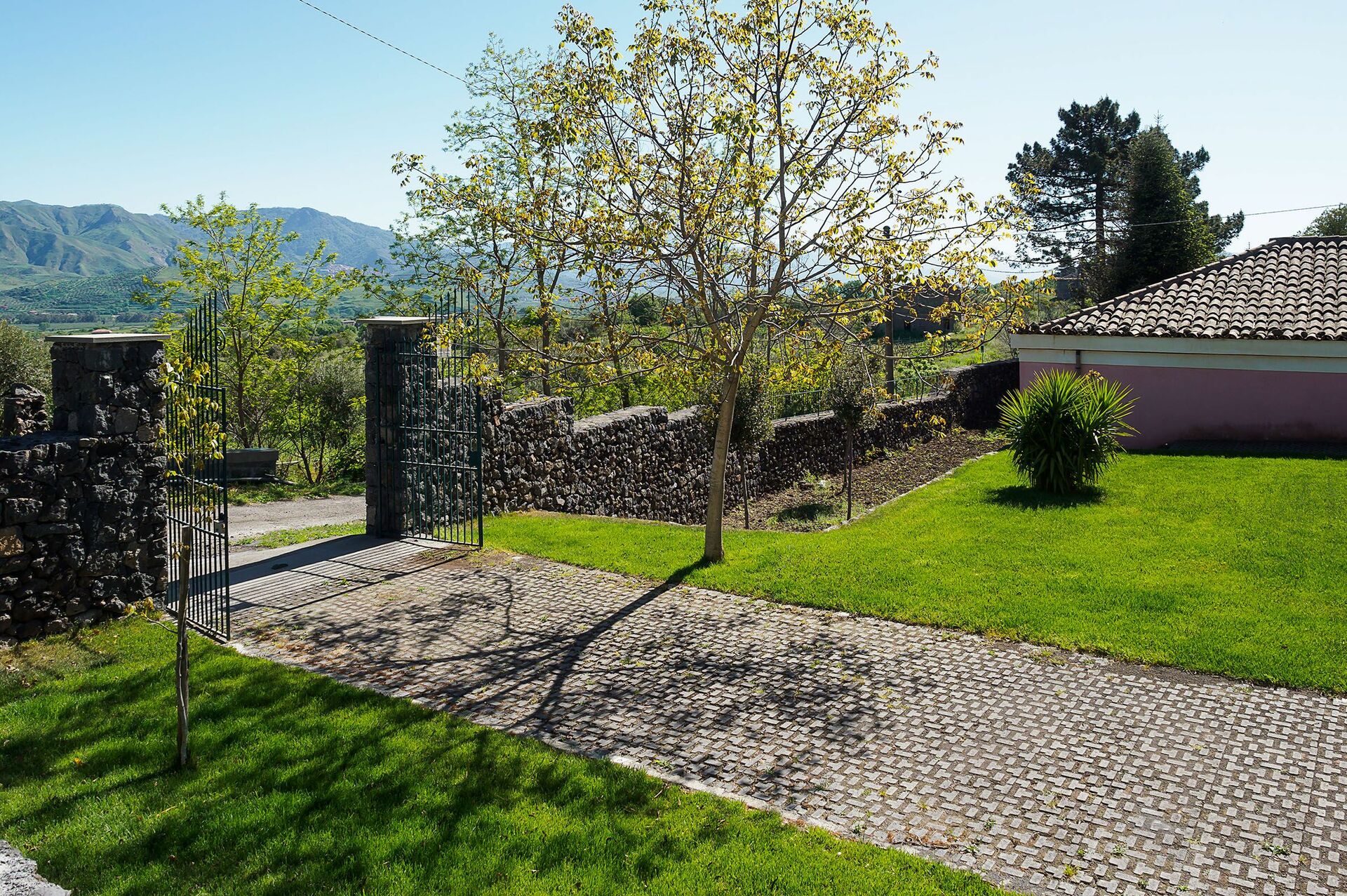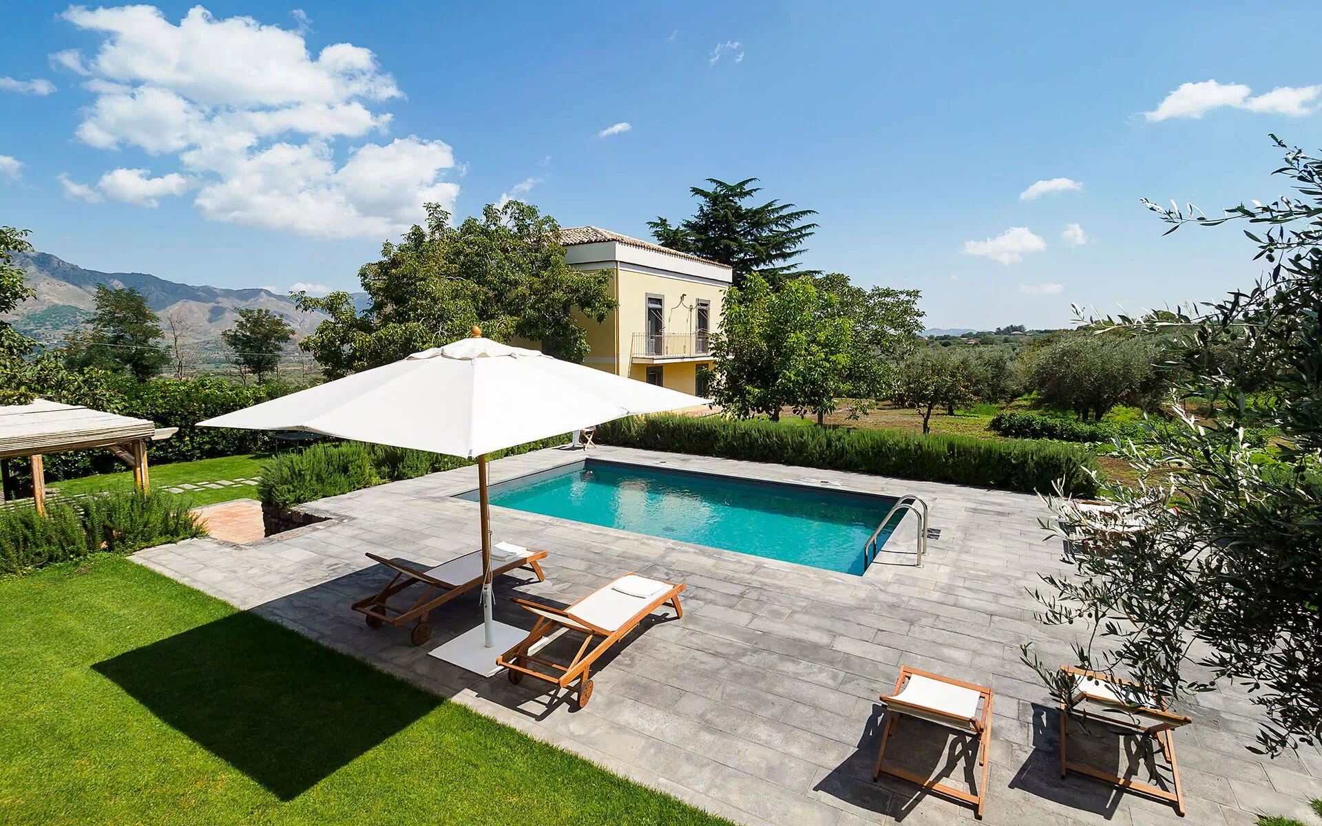 Nestled in the picturesque hills of Etna, the villa is surrounded by a lush, well-tended garden framed by characteristic dry stone walls. There are large terraces and a small heated pool with sun deck, lovely for rest and relaxation.