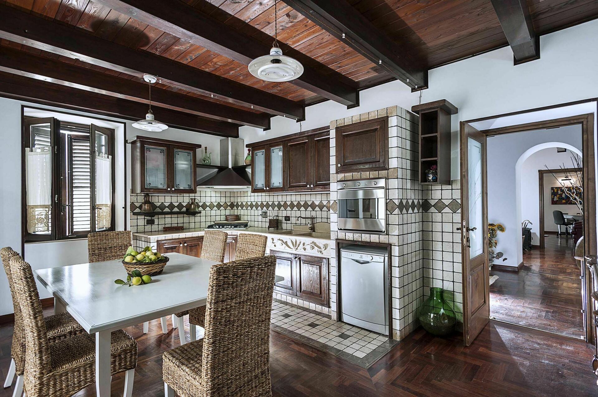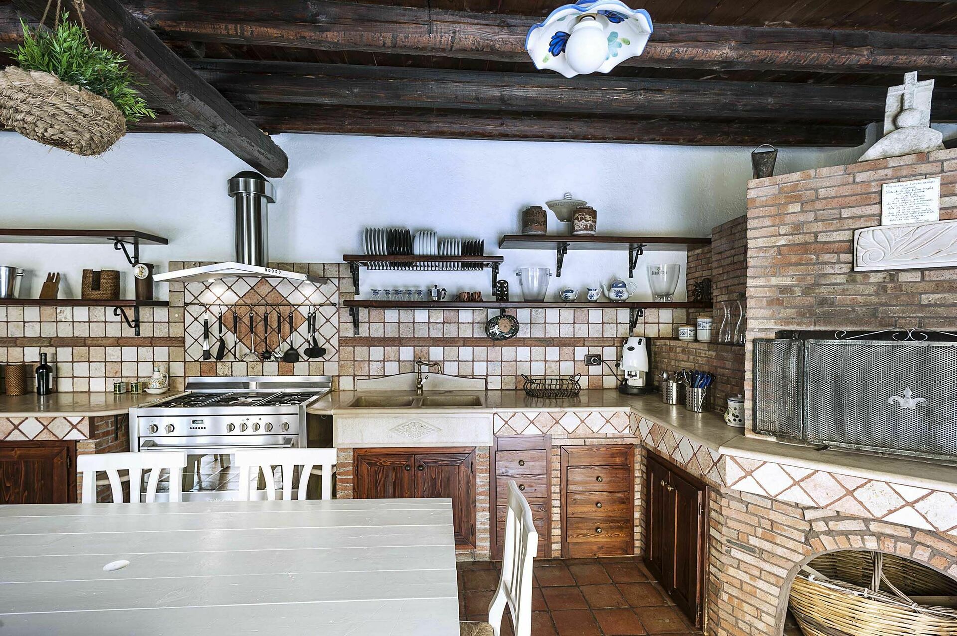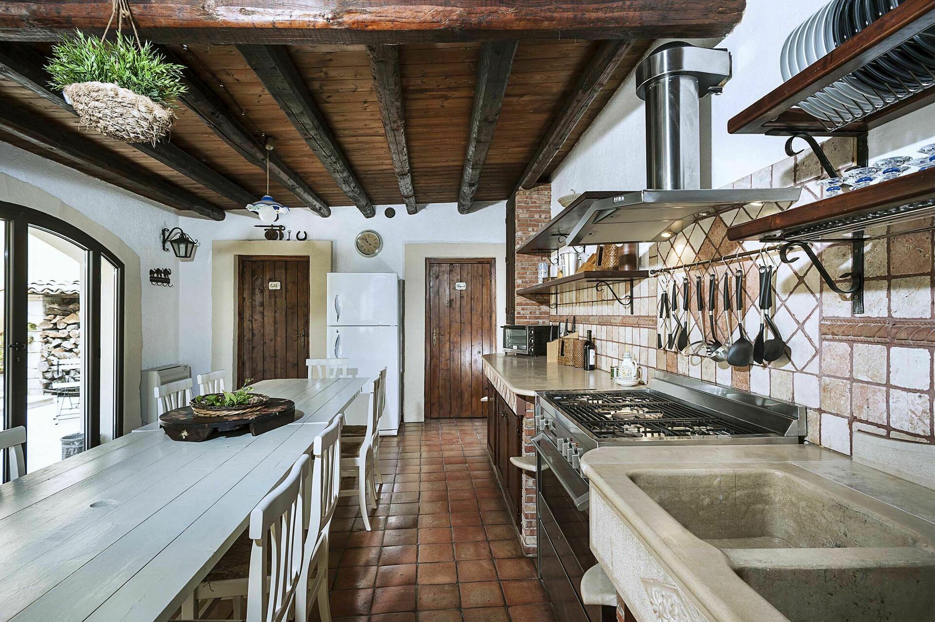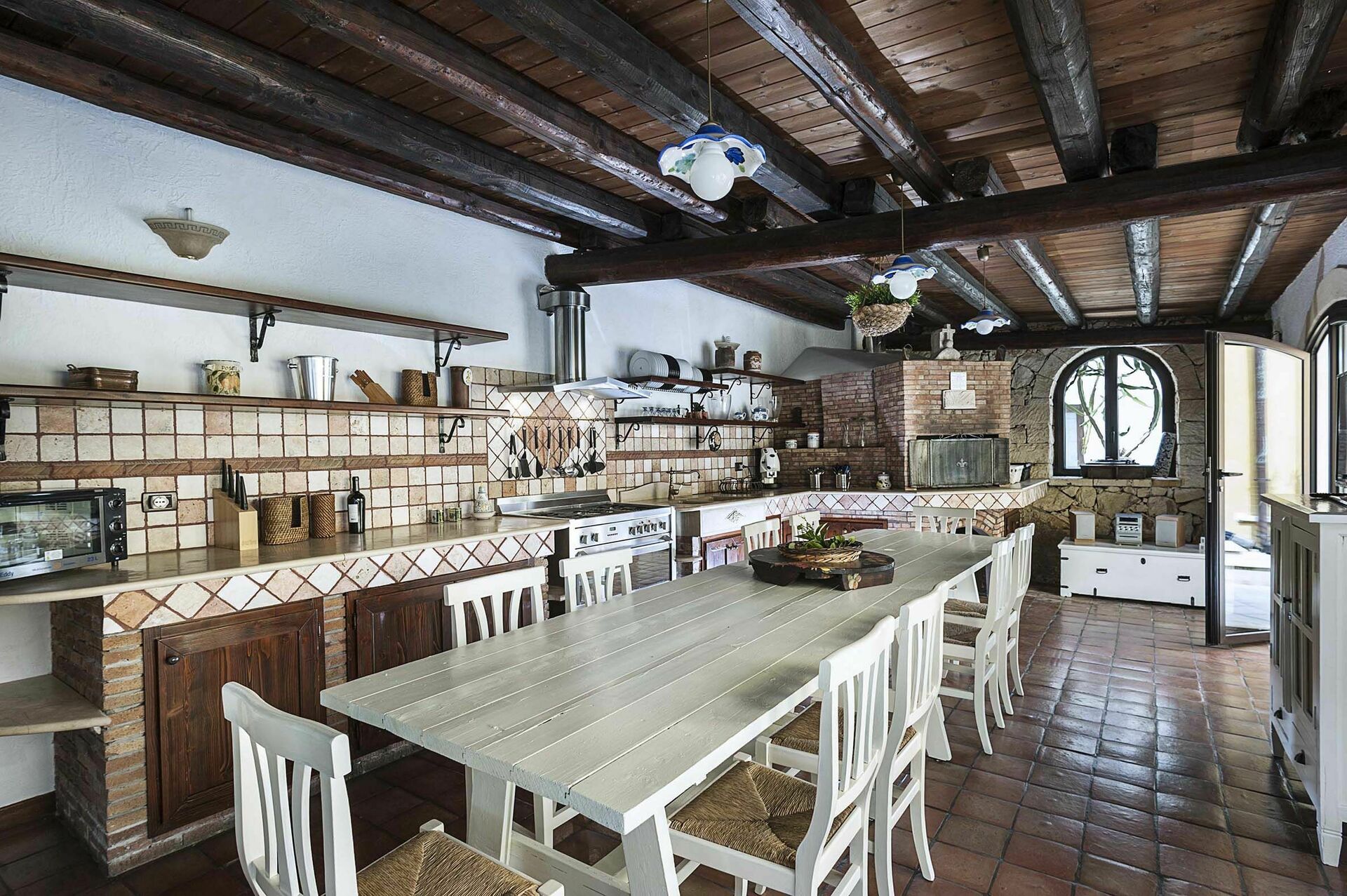 Inside this luxury vacation rental, there is a large room with a rustic kitchen with wood-fired oven and a laundry room with washing machine.