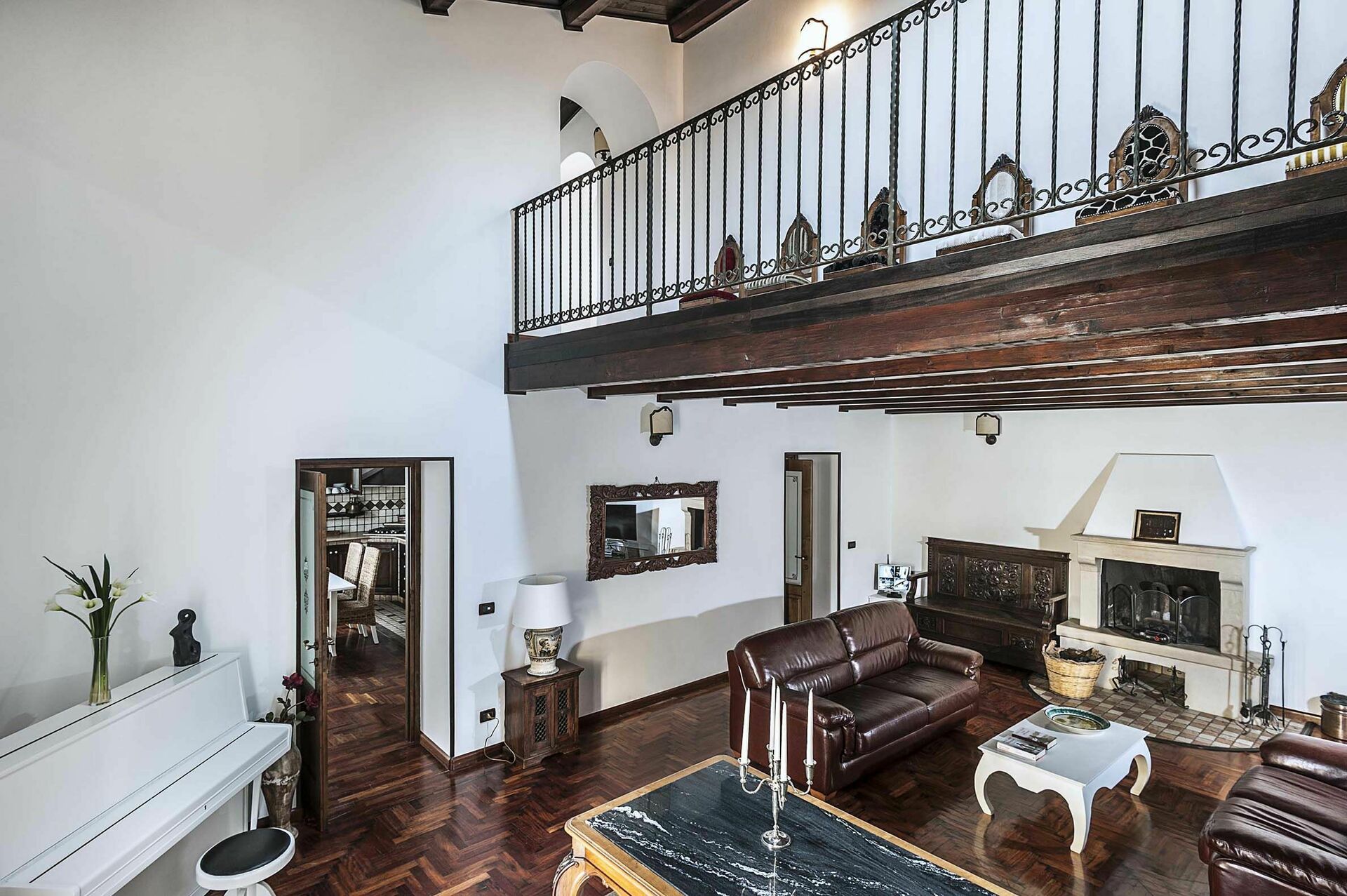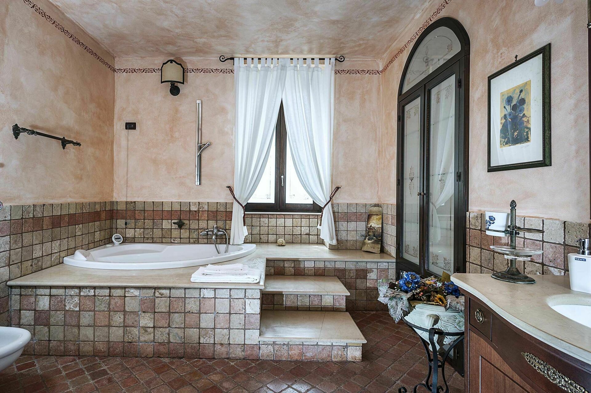In a separate building, accessible from the outside, ground floor: large room with kitchen and wood oven, laundry room, dressing room with bathroom with shower.