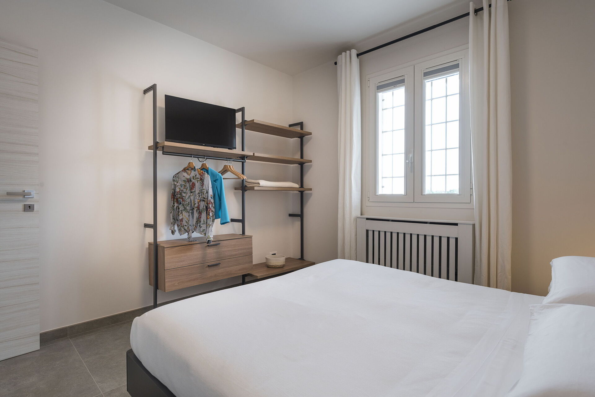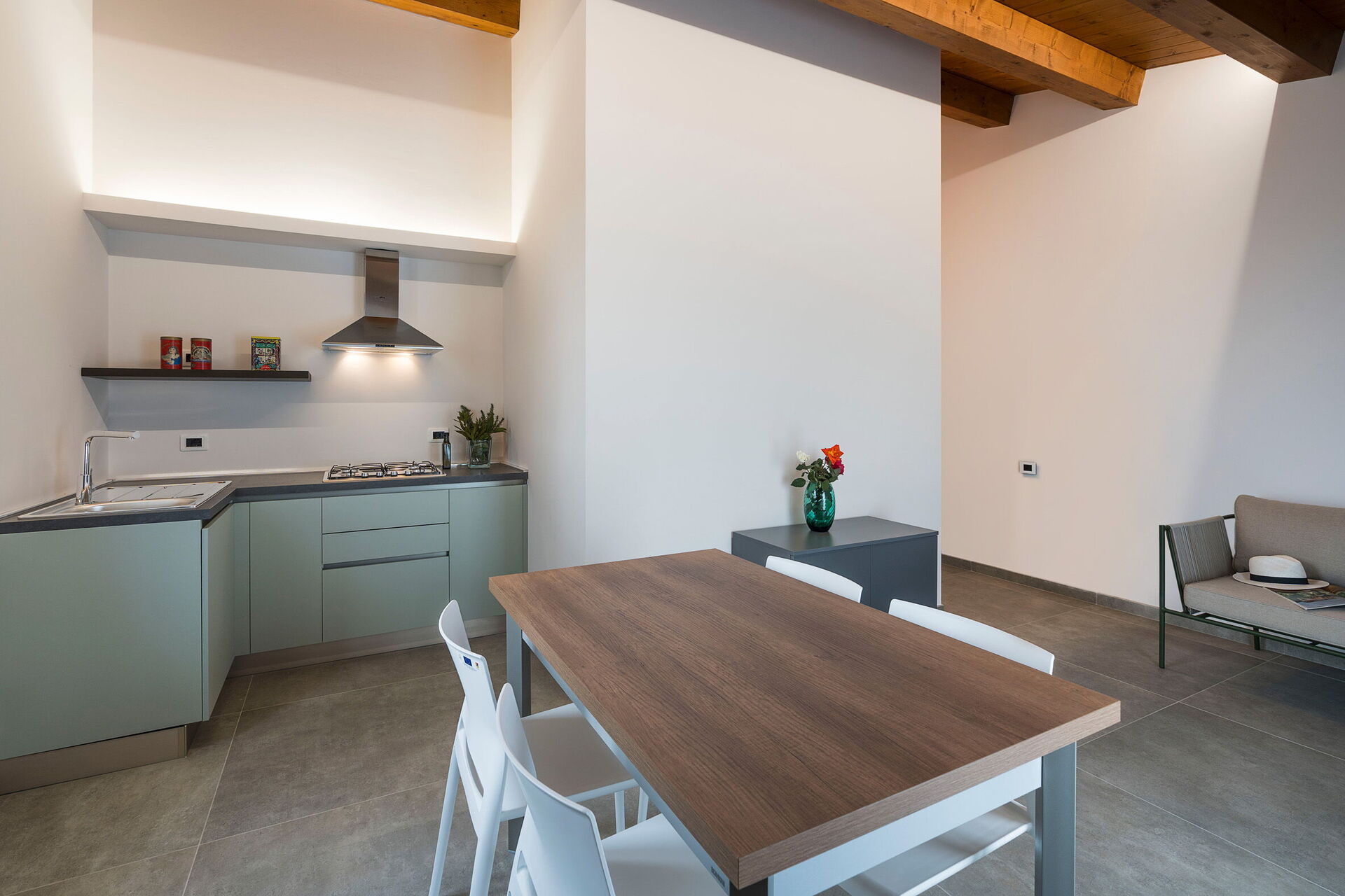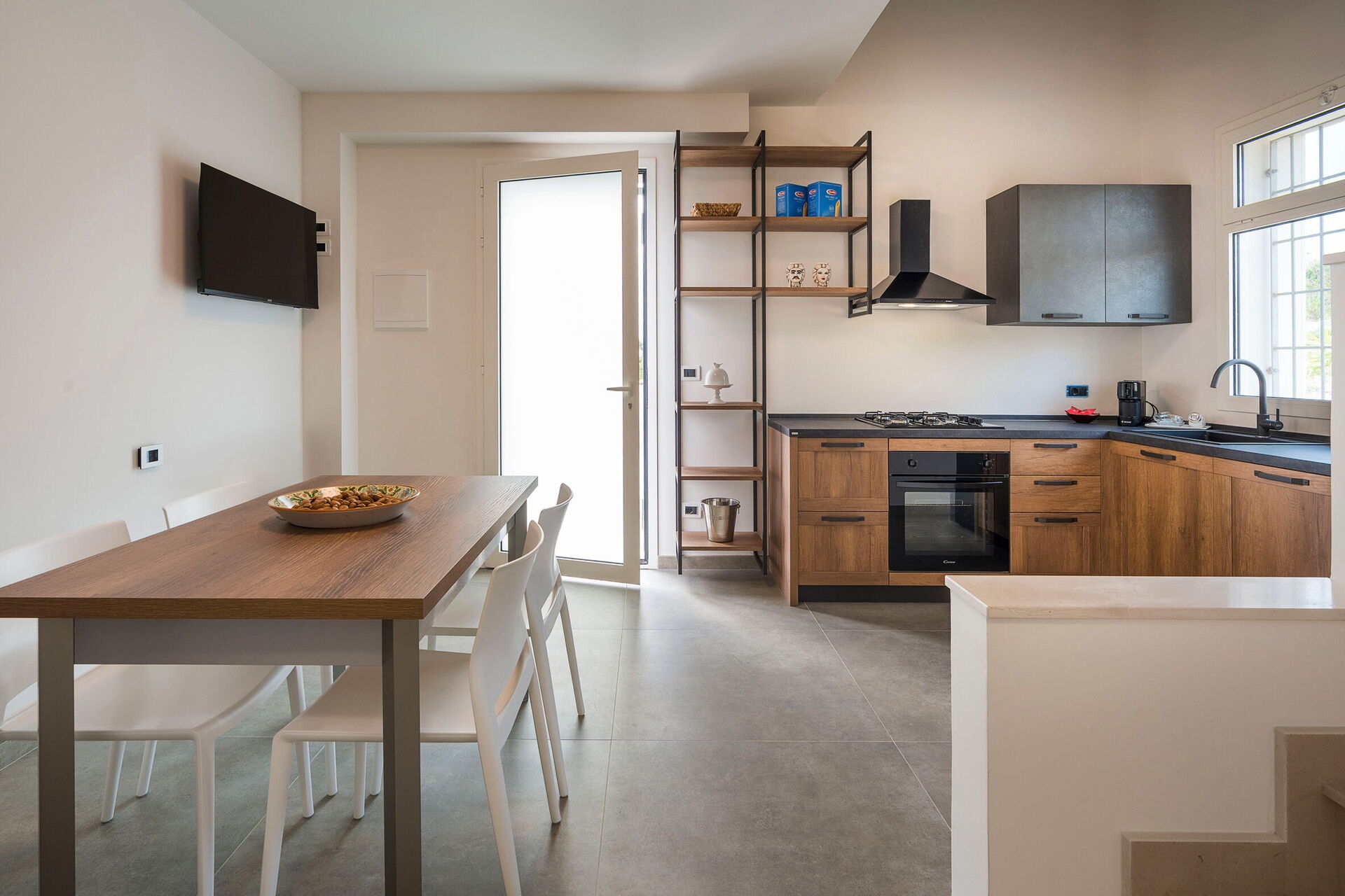 Ground floor: kitchen (cooktop, freezer, refrigerator, espresso coffee maker) with a dining area and veranda access, double bedroom (bed dimensions: 160 x 200 cm) with a private bathroom with shower, double bedroom (bed dimensions: 160/80 x 200 cm; can be converted into 2 single beds upon request), bathroom with shower.