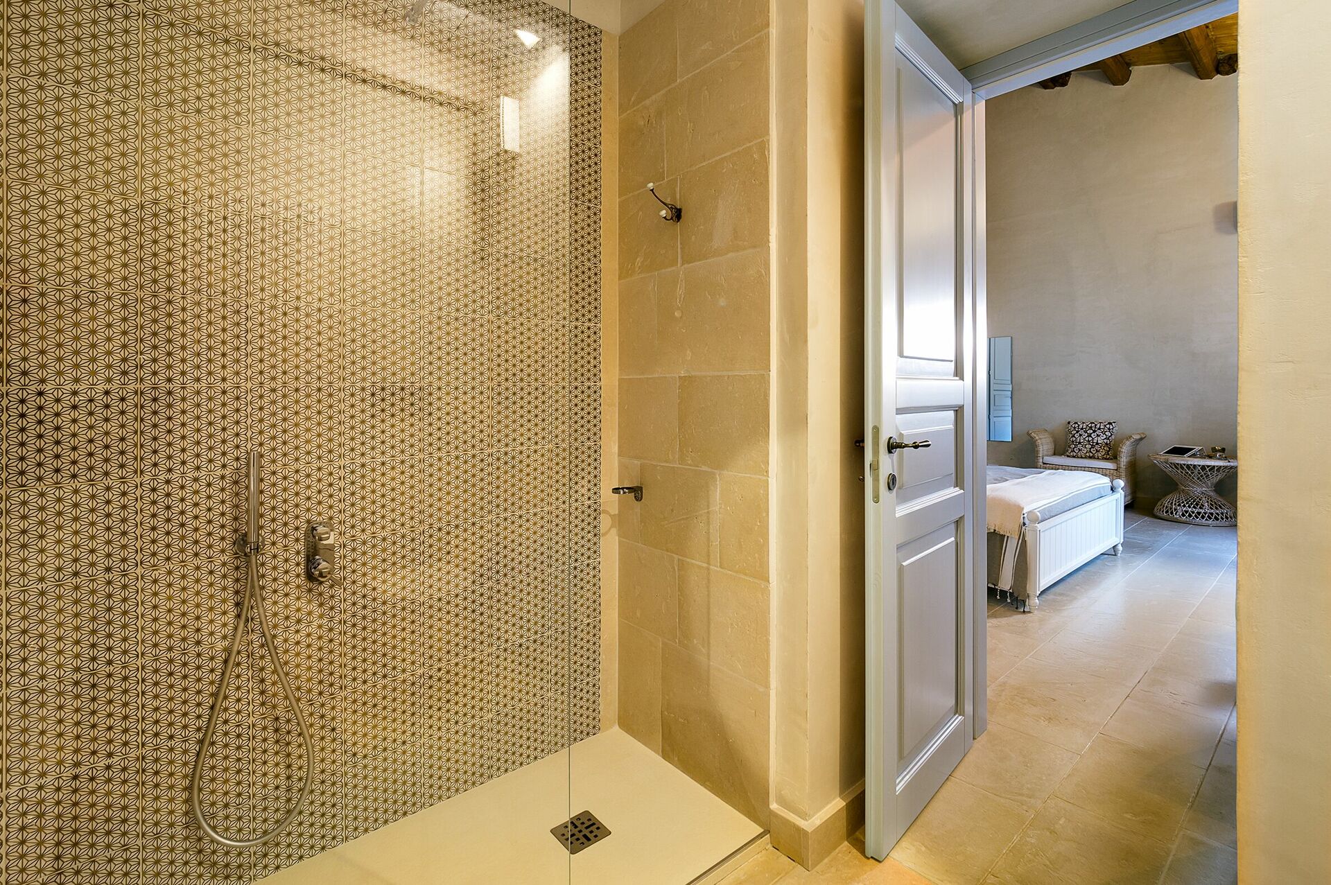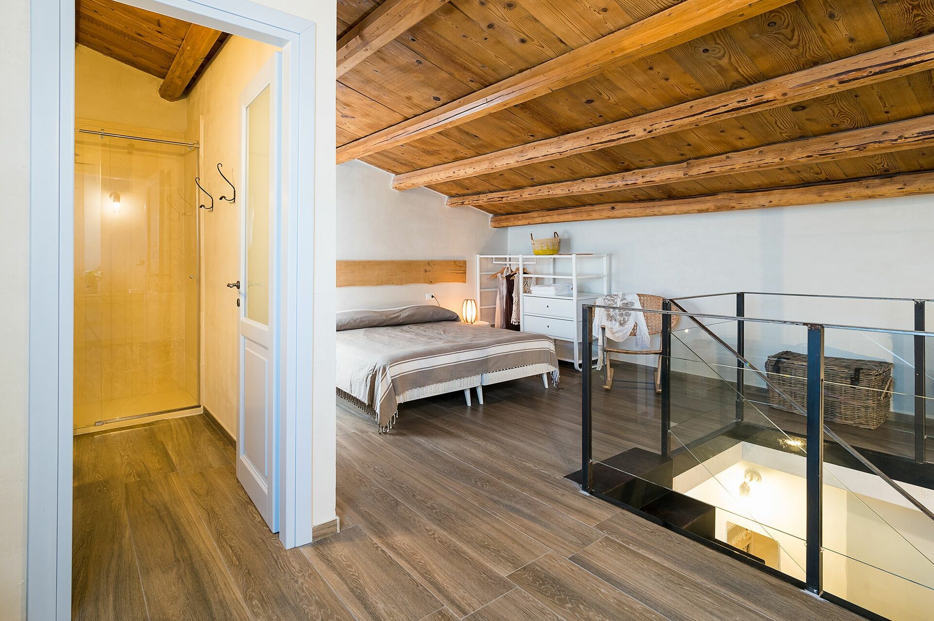 Ground floor: living room with fireplace, dining area and kitchen; 1 WC; 2 double bedrooms, each with bathroom with shower; 1 double bedroom with access to a loft with 2 single beds and bathroom with shower; 2 double bedrooms accessible from the outside only, each with private bathroom with shower.