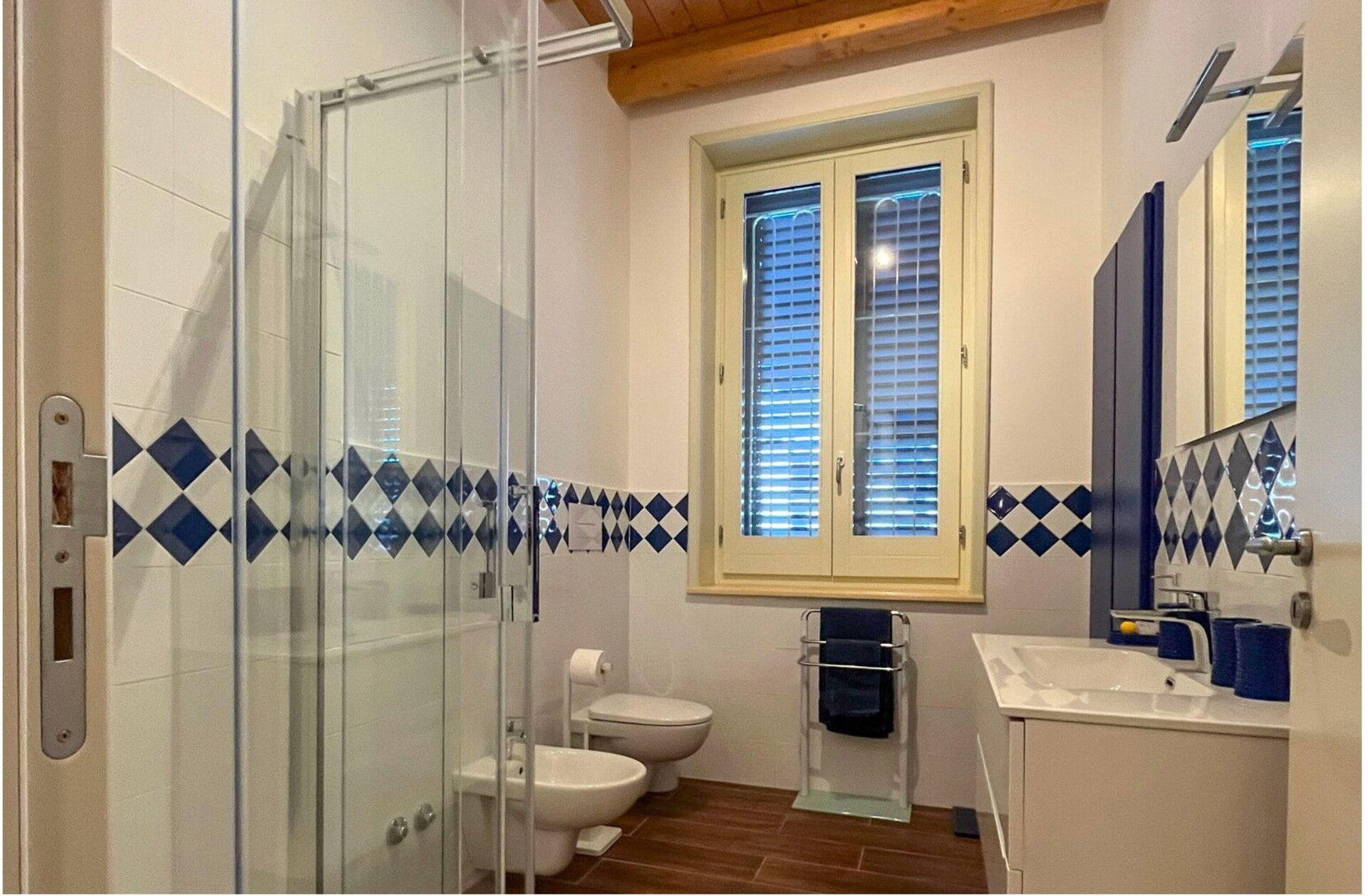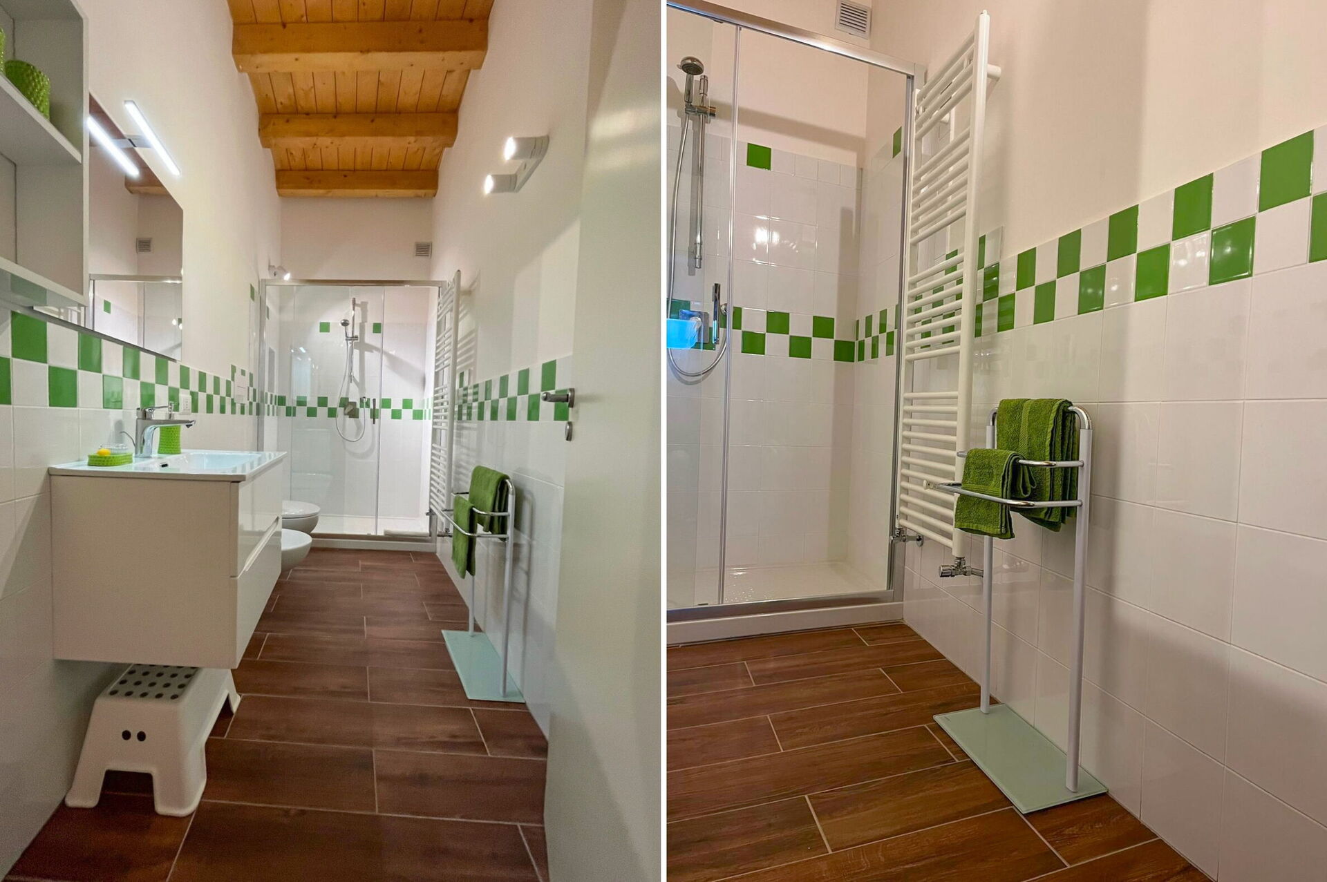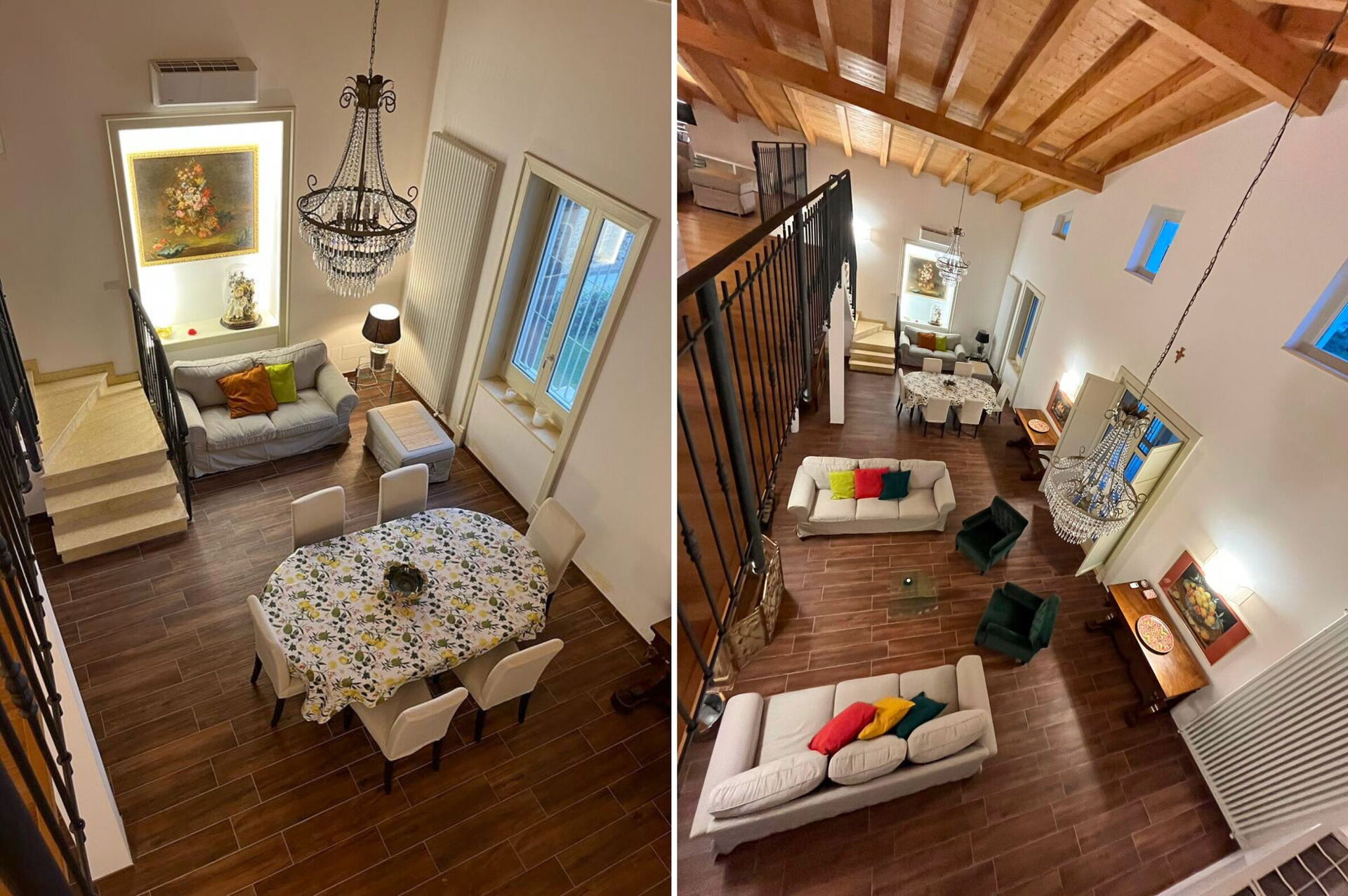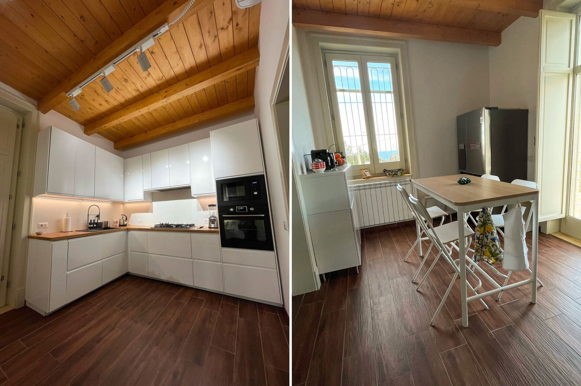 Ground floor: living room with fireplace and dining area, kitchen (oven, freezer, refrigerator, dishwasher, hob, microwave, toaster, American coffee machine, espresso coffee machine) with dining area, second small kitchen (oven, refrigerator, dishwasher, hob, American coffee machine) 2 double bedrooms, room with double sofa bed (TV), 3 bathrooms each with shower.