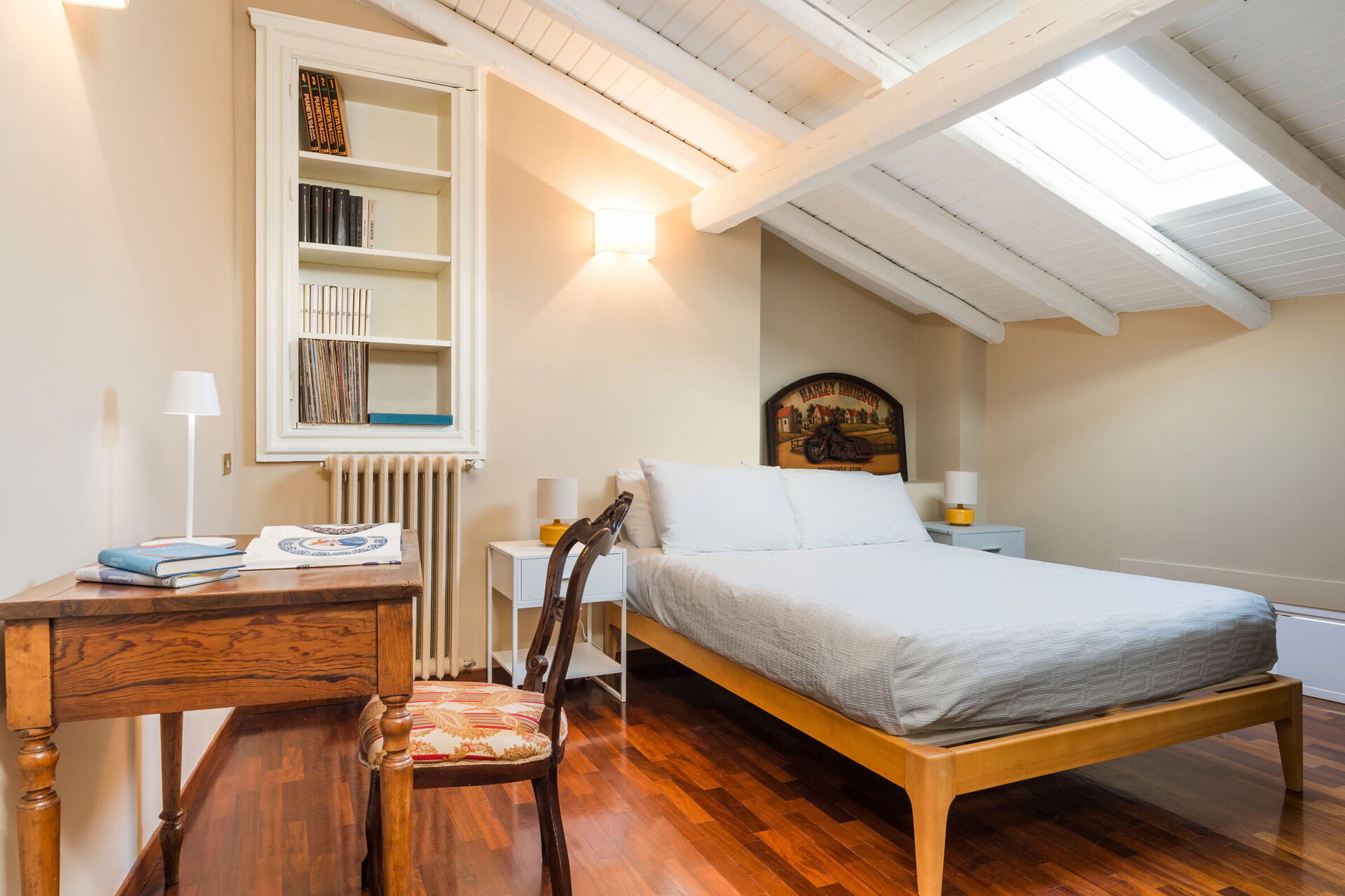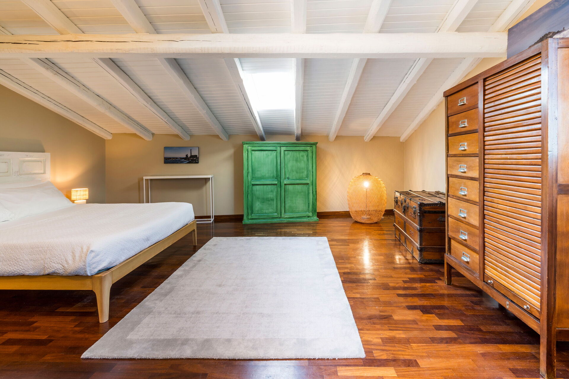 First floor (in the attic): double bedroom (air conditioning, bed dimensions: 160 x 200 cm), bathroom with shower, bedroom with small double bed (air conditioning).