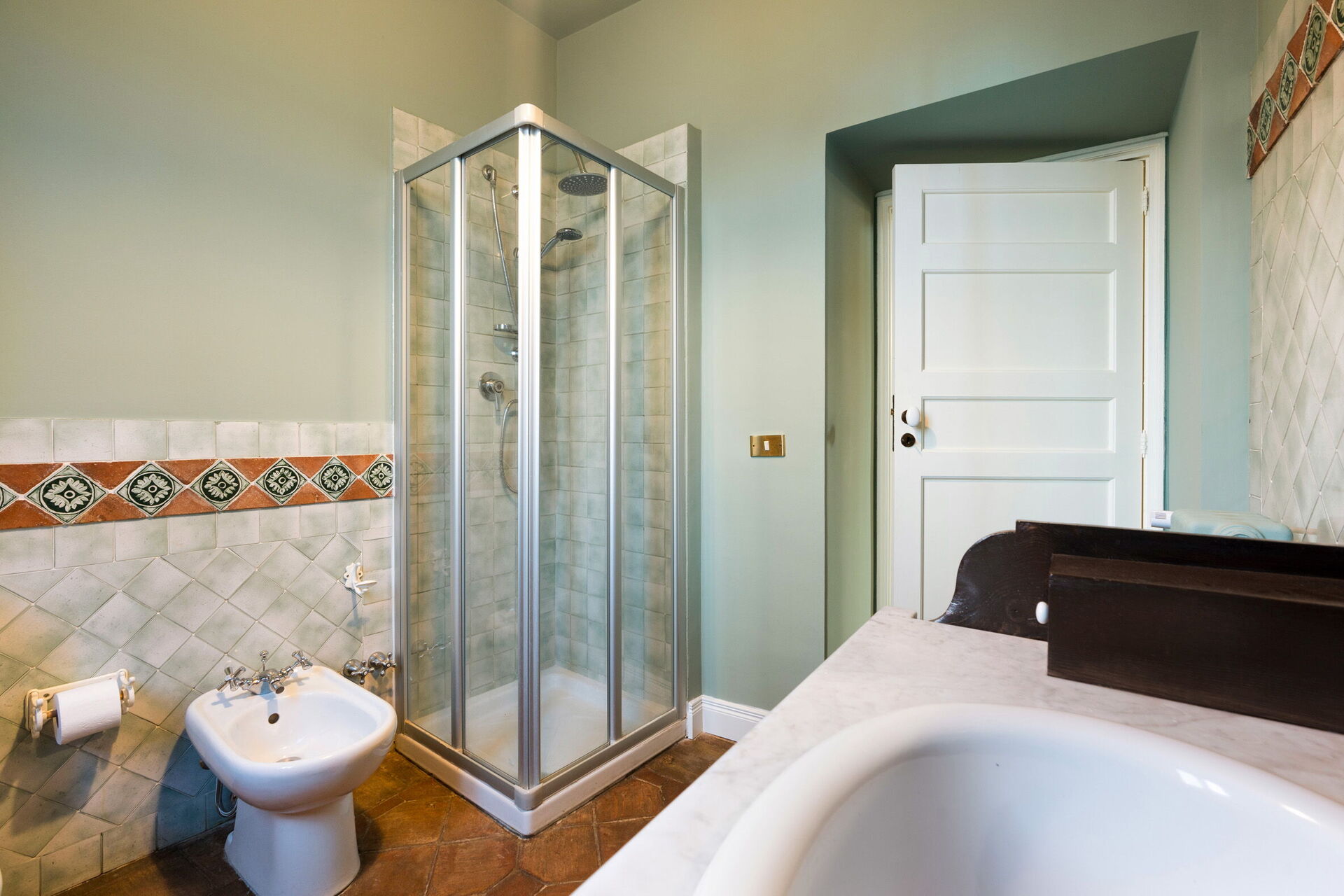 Ground floor: entrance, large living area with ornamental fireplace (TV), dining room, kitchen (cooktop, oven, refrigerator, freezer, dishwasher, microwave, toaster, espresso coffee maker, American coffee maker), wc, laundry room, double bedroom (bed dimensions: 180 x 200 cm) with private bathroom with shower; double bedroom (bed dimensions: 160 x 200 cm) with private bathroom with shower, bathroom with shower.