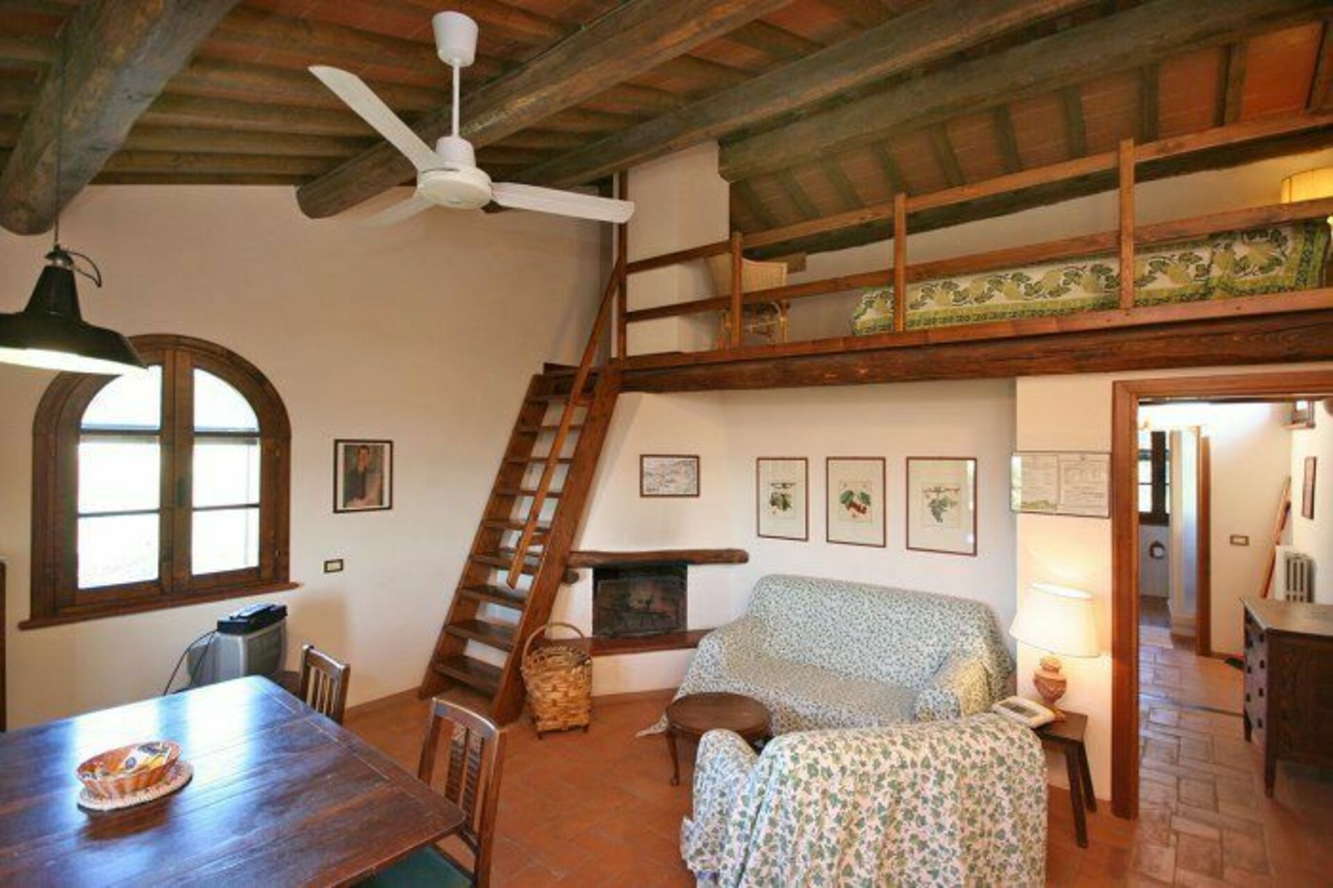 2nd floor: living-room (satellite TV) with fireplace, dining area and kitchen corner (oven, freezer, orange squeezer), open gallery with double bed, double bedroom, bathroom with shower, storeroom.