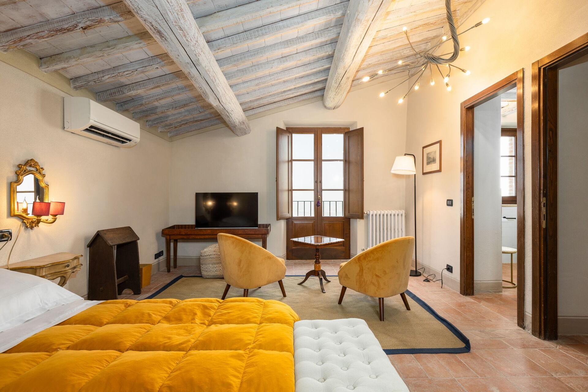 This charming villa for rent in Val d'Orcia has 3 bedrooms and can accommodate groups of 6 people. Inside, the beautiful farmhouse for rent has every comfort and has been furnished following the typical rustic style of country houses of this area in Tuscany. Its bright interiors will make our guests enjoy an authentic vacation in the Tuscan countryside at any time of the year.