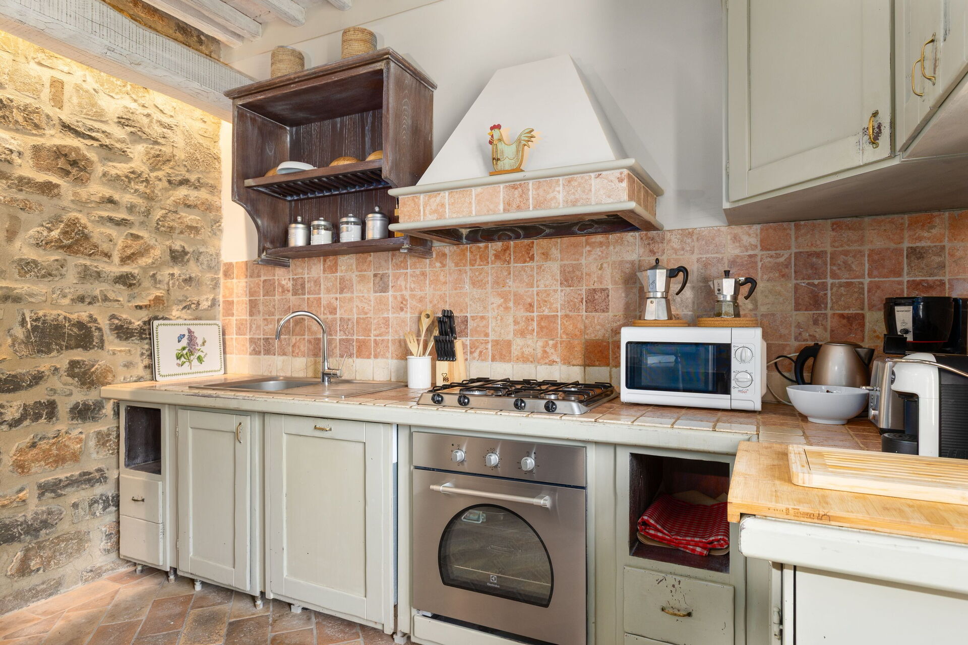 Ground Floor: entrance to living room with working fireplace and LCD satellite TV, dining room with access to the outside on a small covered terrace equipped with table and chairs for outdoor dining, bathroom with shower, kitchen (stove with 4 burners, electric oven, microwave oven, American coffee maker, toaster, kettle machina for espresso coffee.