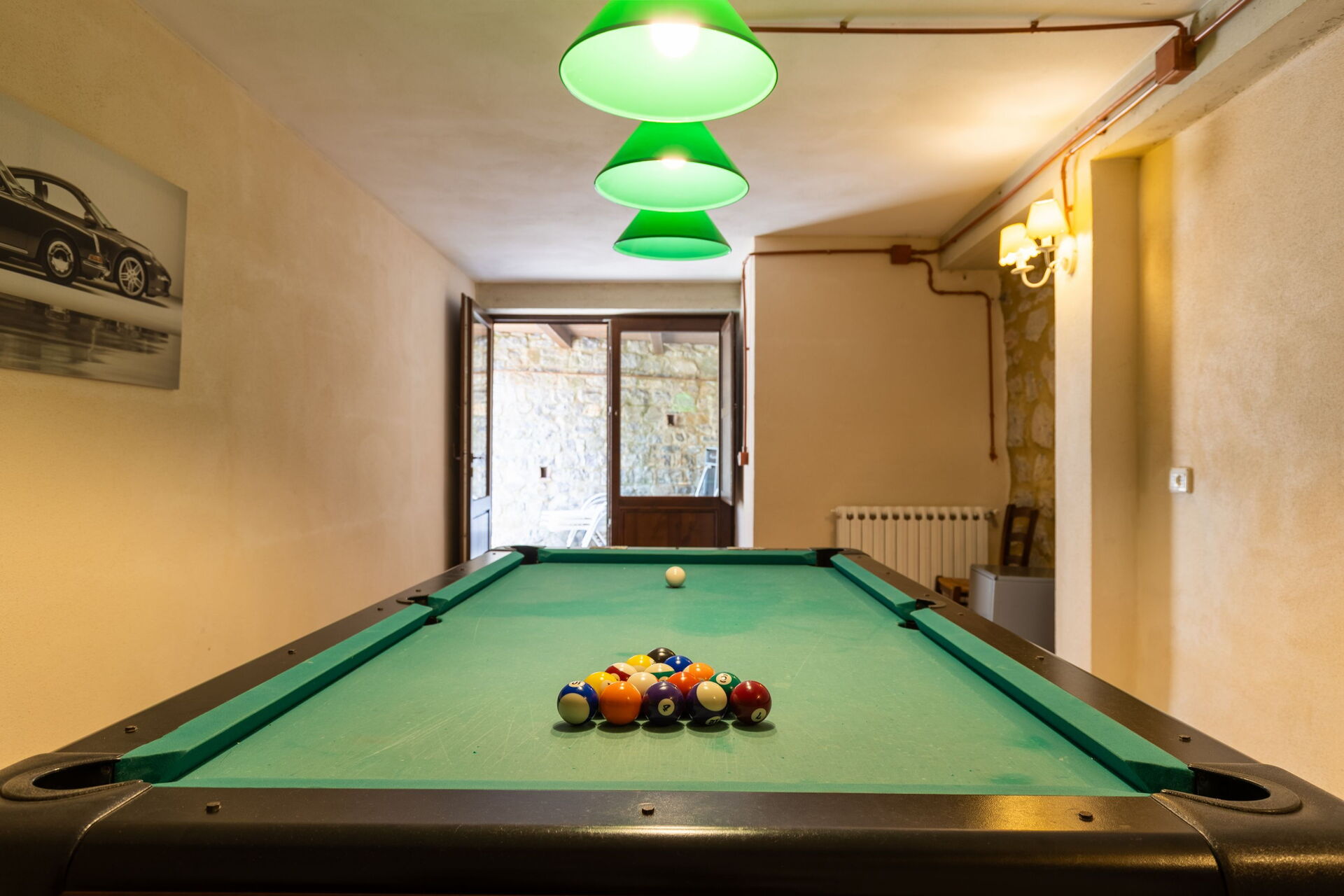 With access from the outside you reach a room with pool table and access to a laundry room with washing machine, drying rack, ironing board and iron.