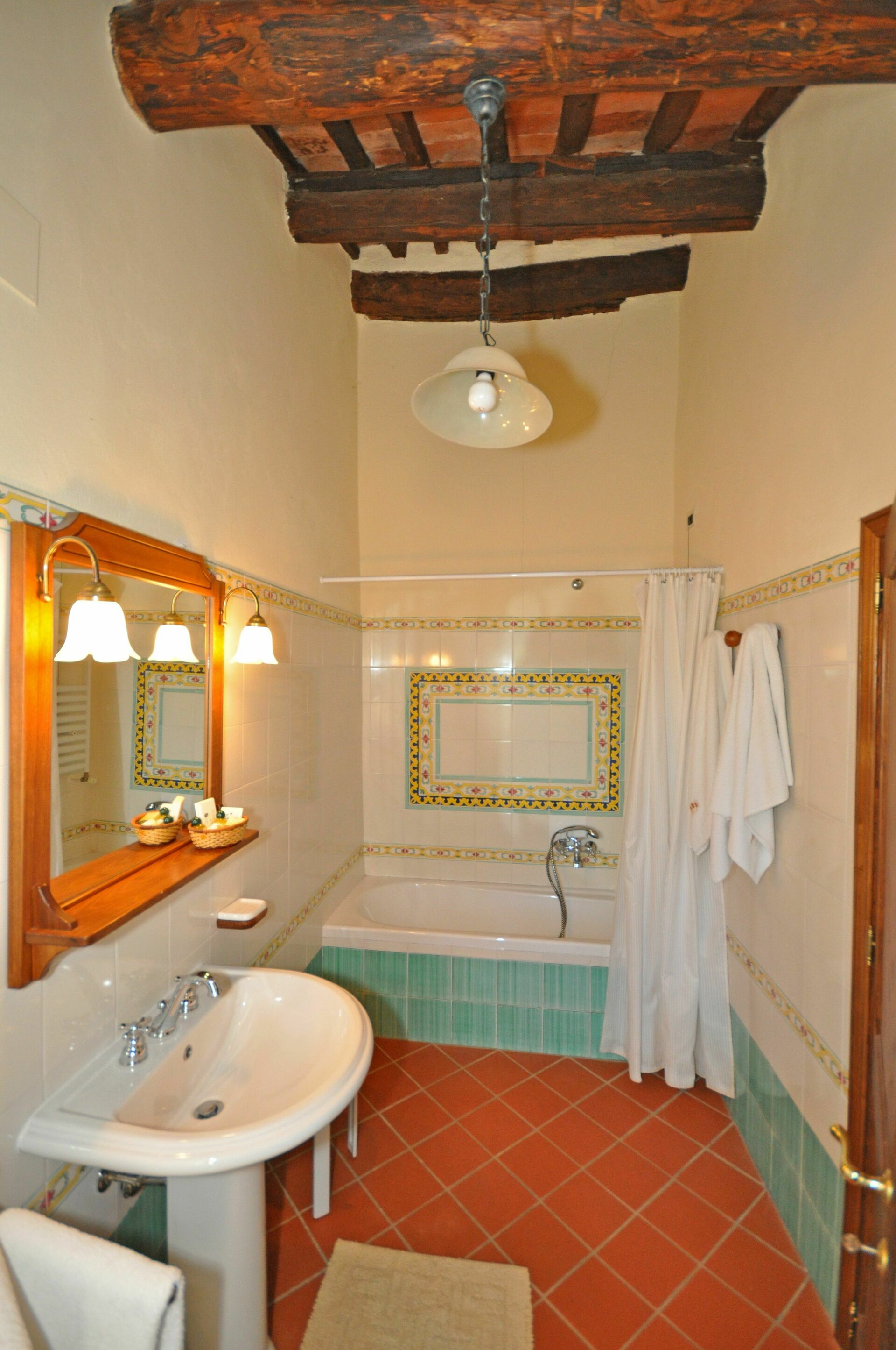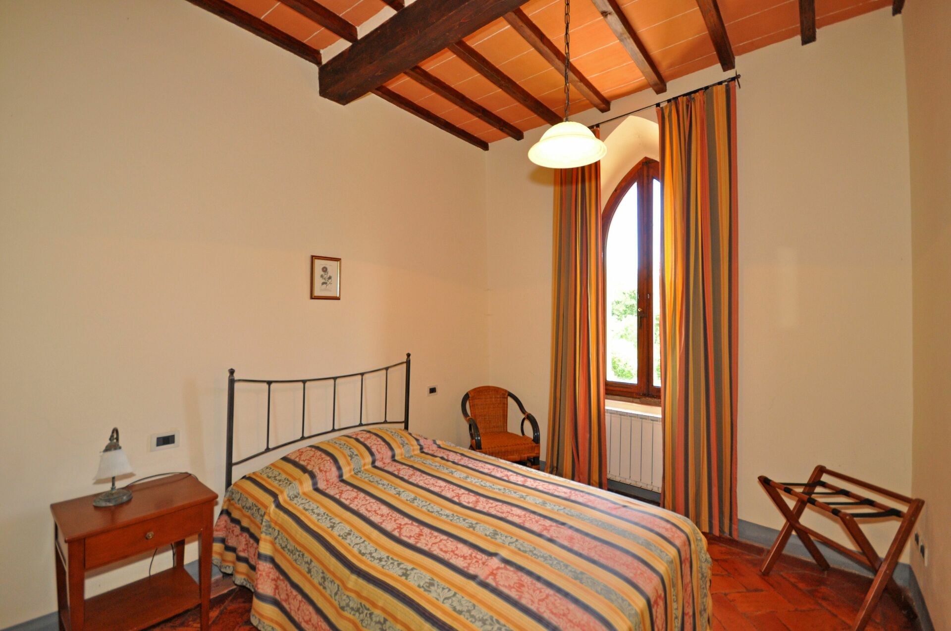1st floor (small, nice access door – access via a personal furnished outdoor area): living-room with fireplace, dining area (satellite TV) and kitchen corner (2 electric plates), bathroom with bathtub (hairdryer), bedroom with a single bed.
