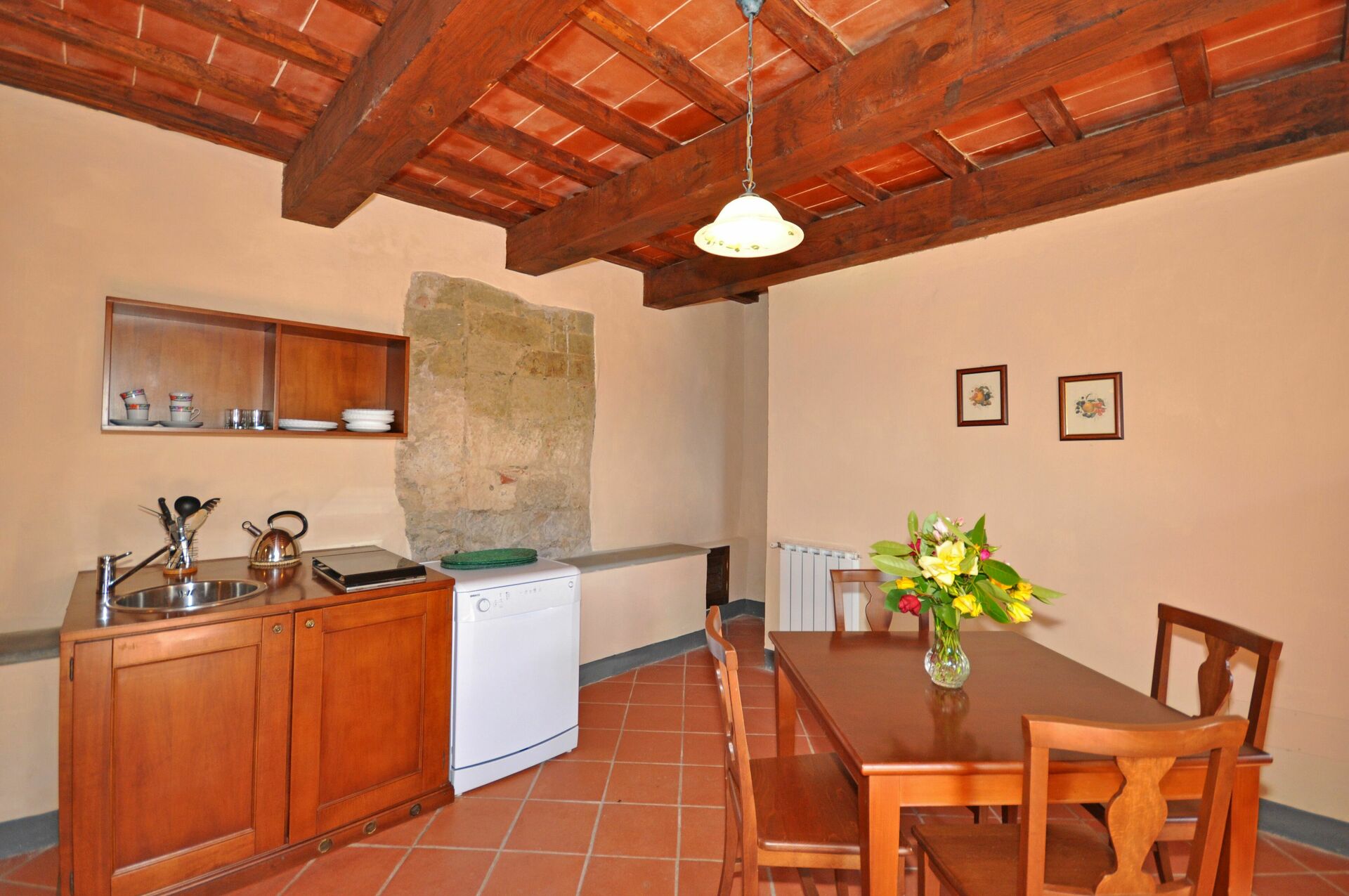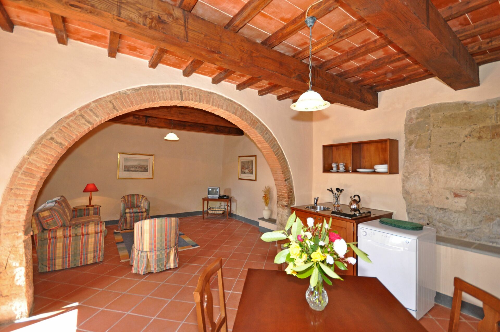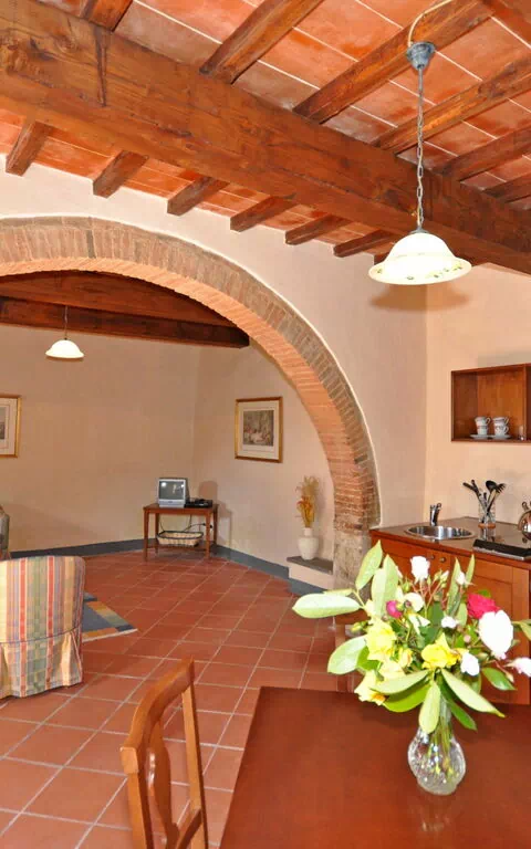 Ground floor: living-room (satellite TV), kitchen corner (dishwasher, 4 electric plates), dining area and access on to the outside with a personal furnished area.