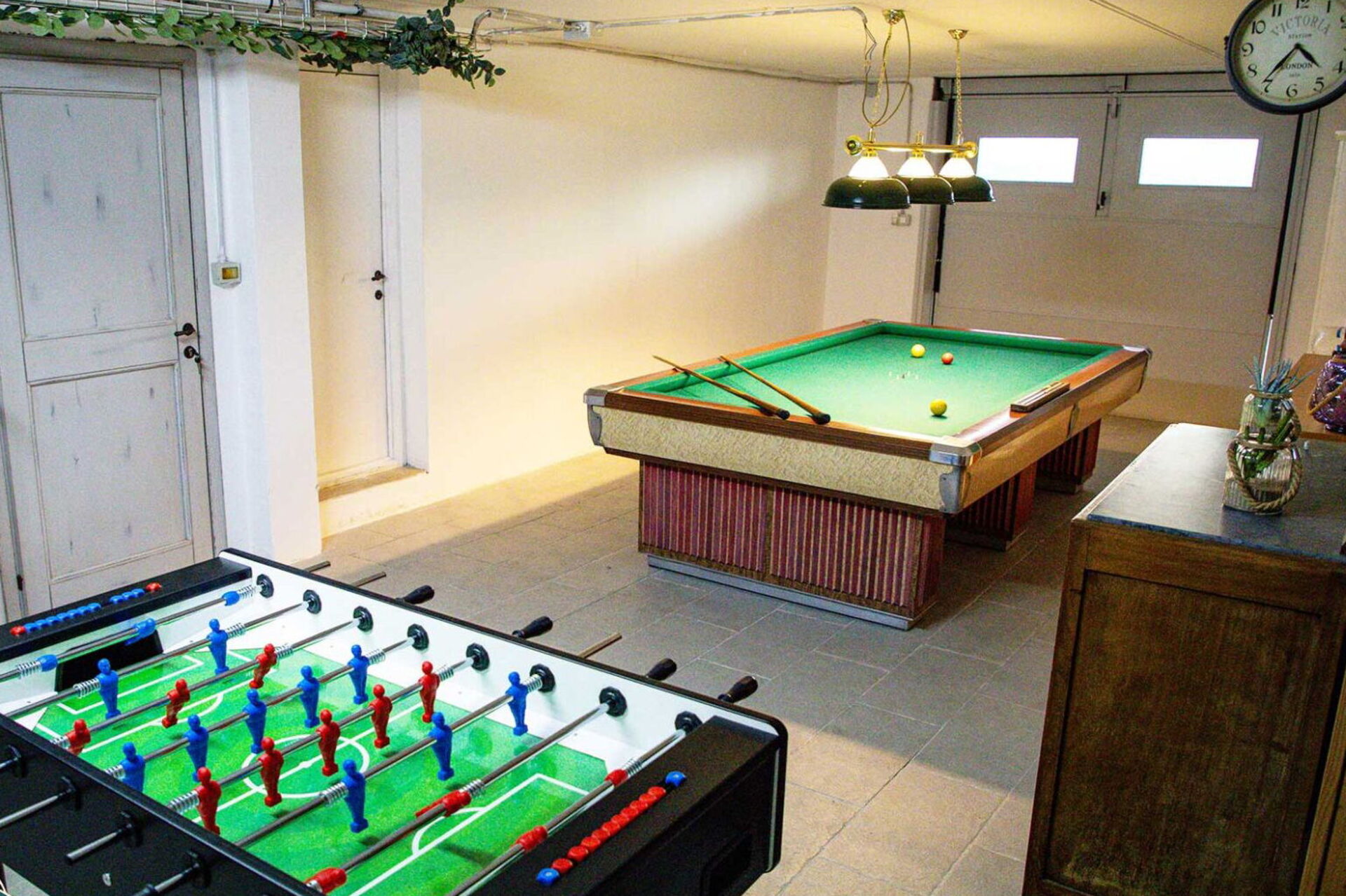 Lower floor (accessible from the living area via an internal staircase): room with pool table, football table, sofa, small library and board games; laundry room with washing machine, dryer, clothes rack and iron.