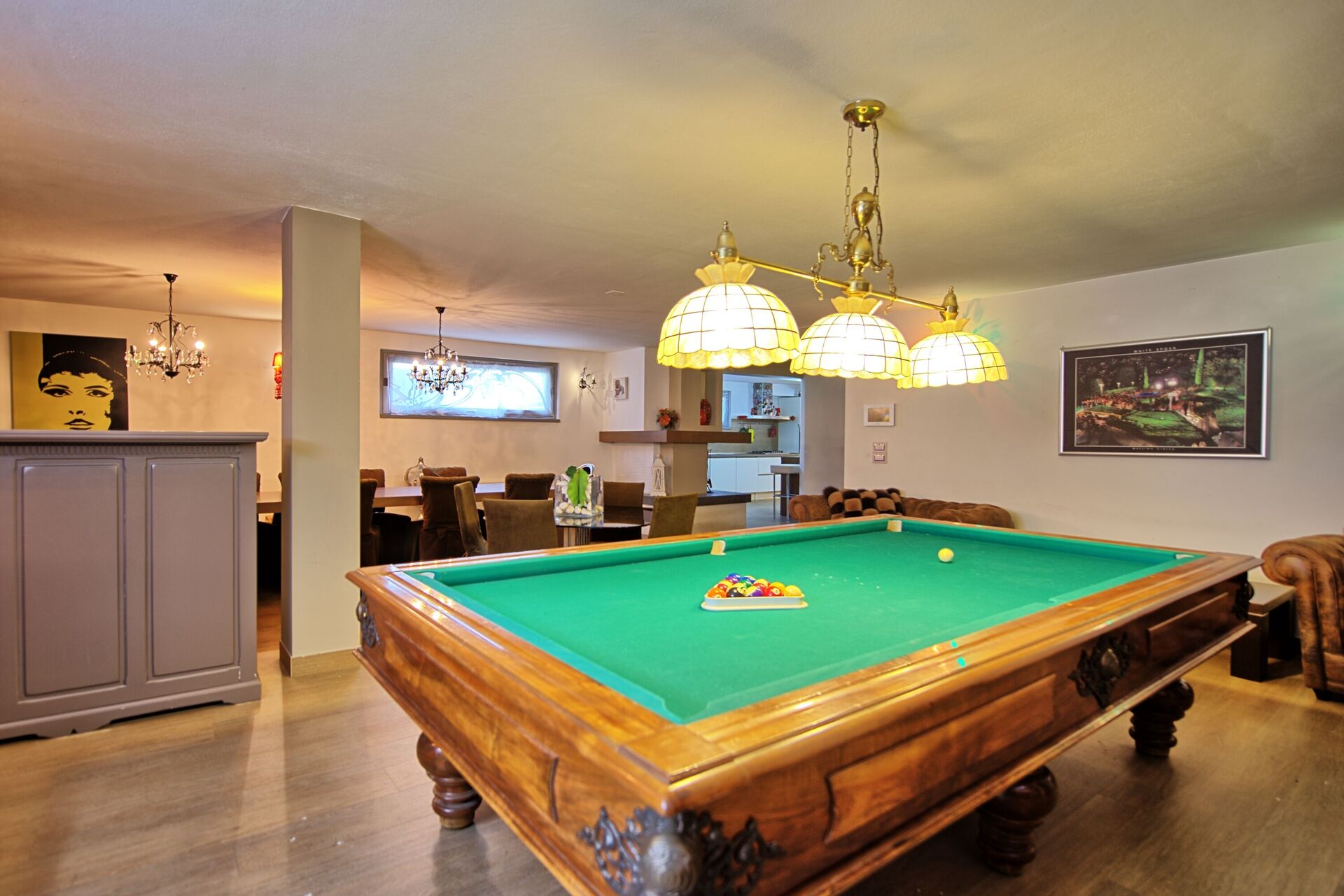 Lower ground floor (accessible from both the inside and outside): large common room with pool table and large dining table; kitchen (oven, freezer, espresso machine, dishwasher, small wine cellar, wood burning pizza oven); bathroom with washing machine; access to the outdoors, where there is another bathroom with shower.