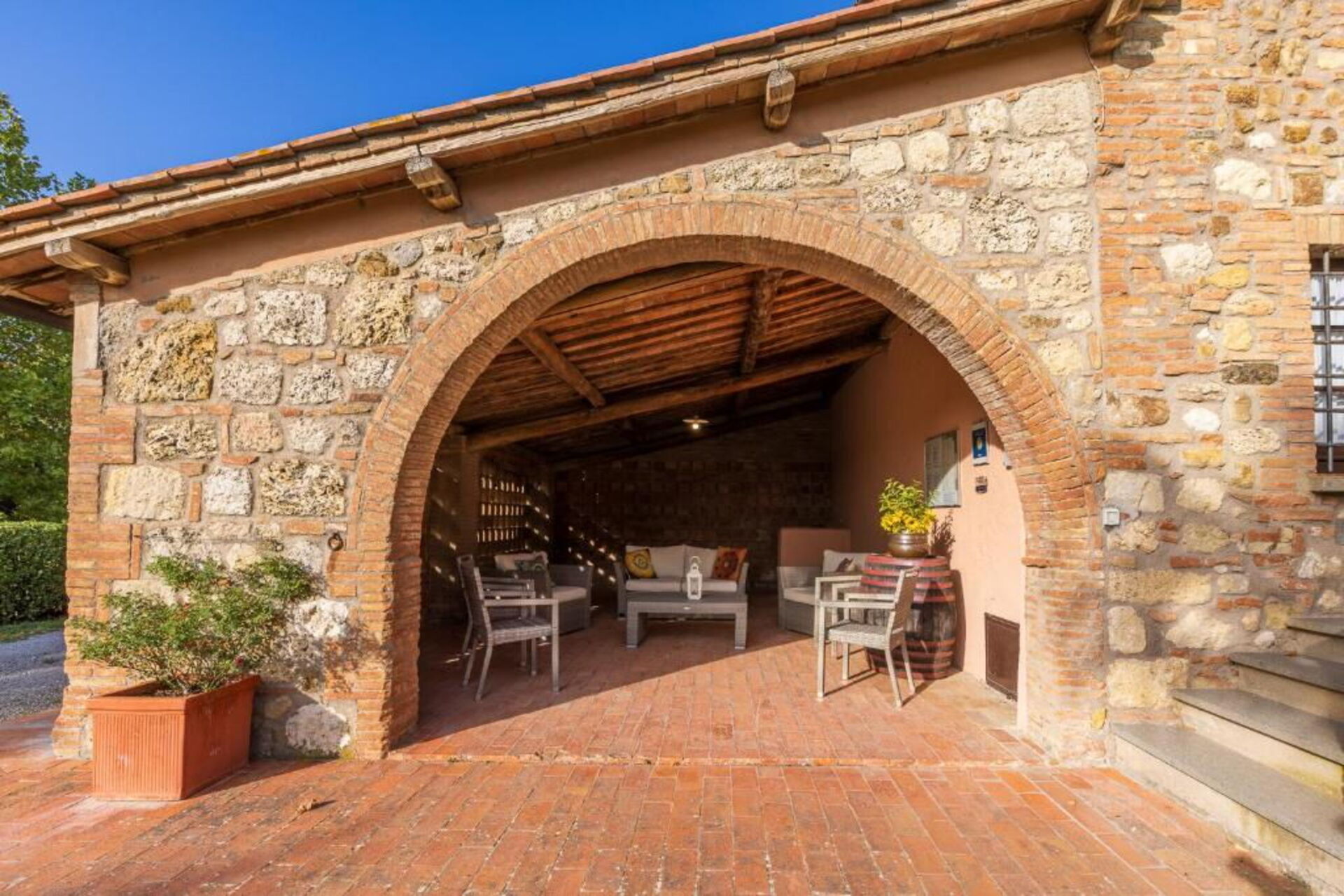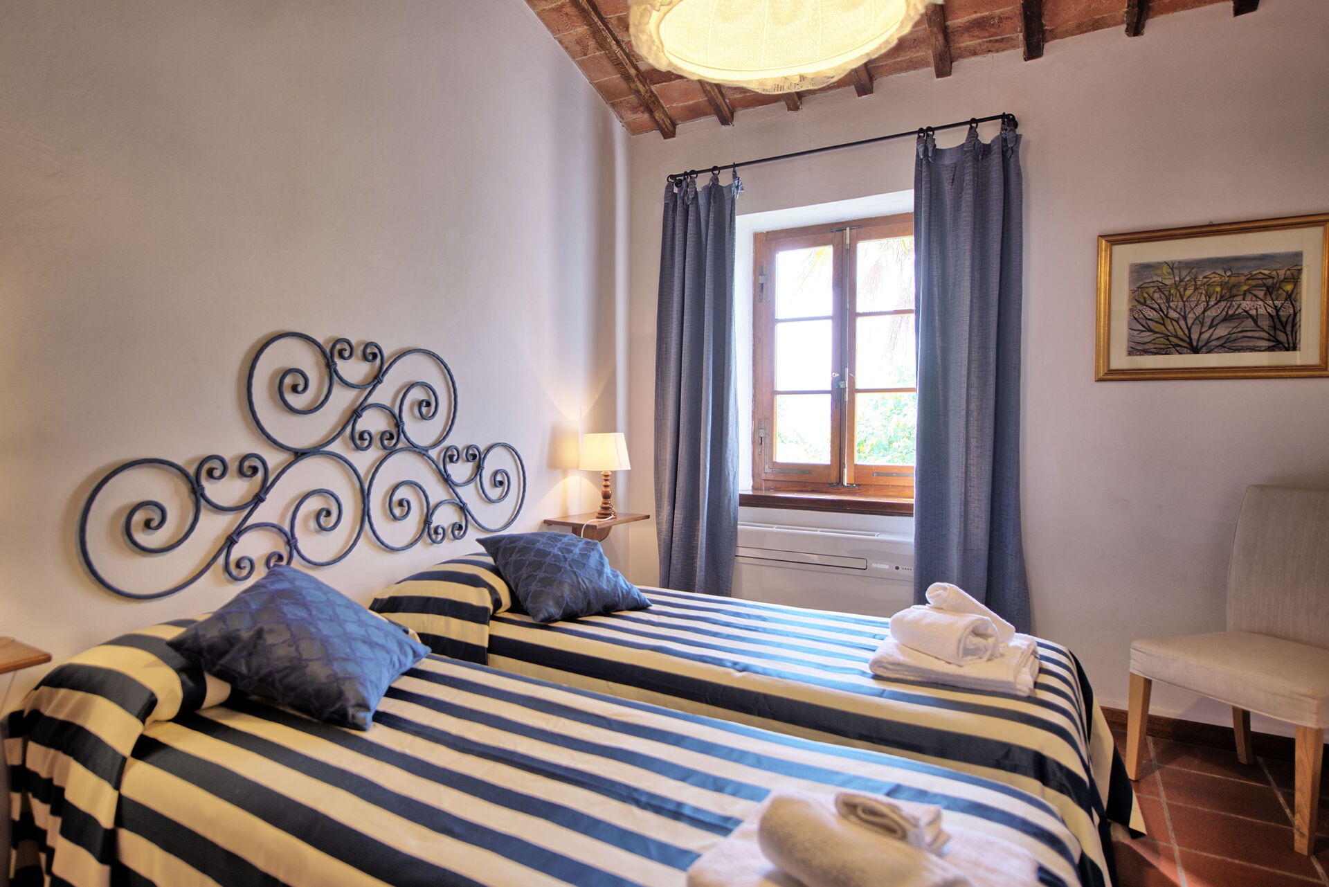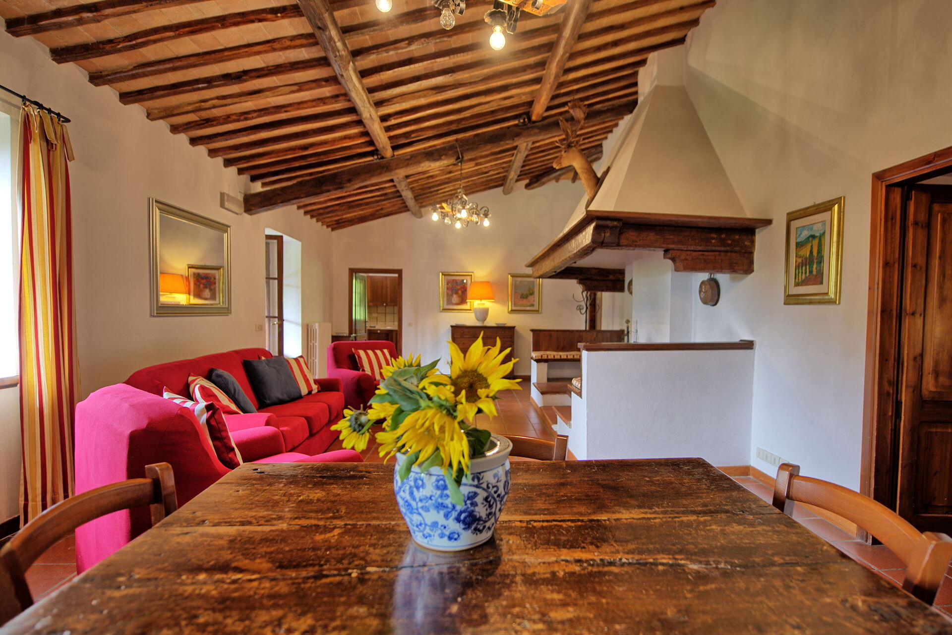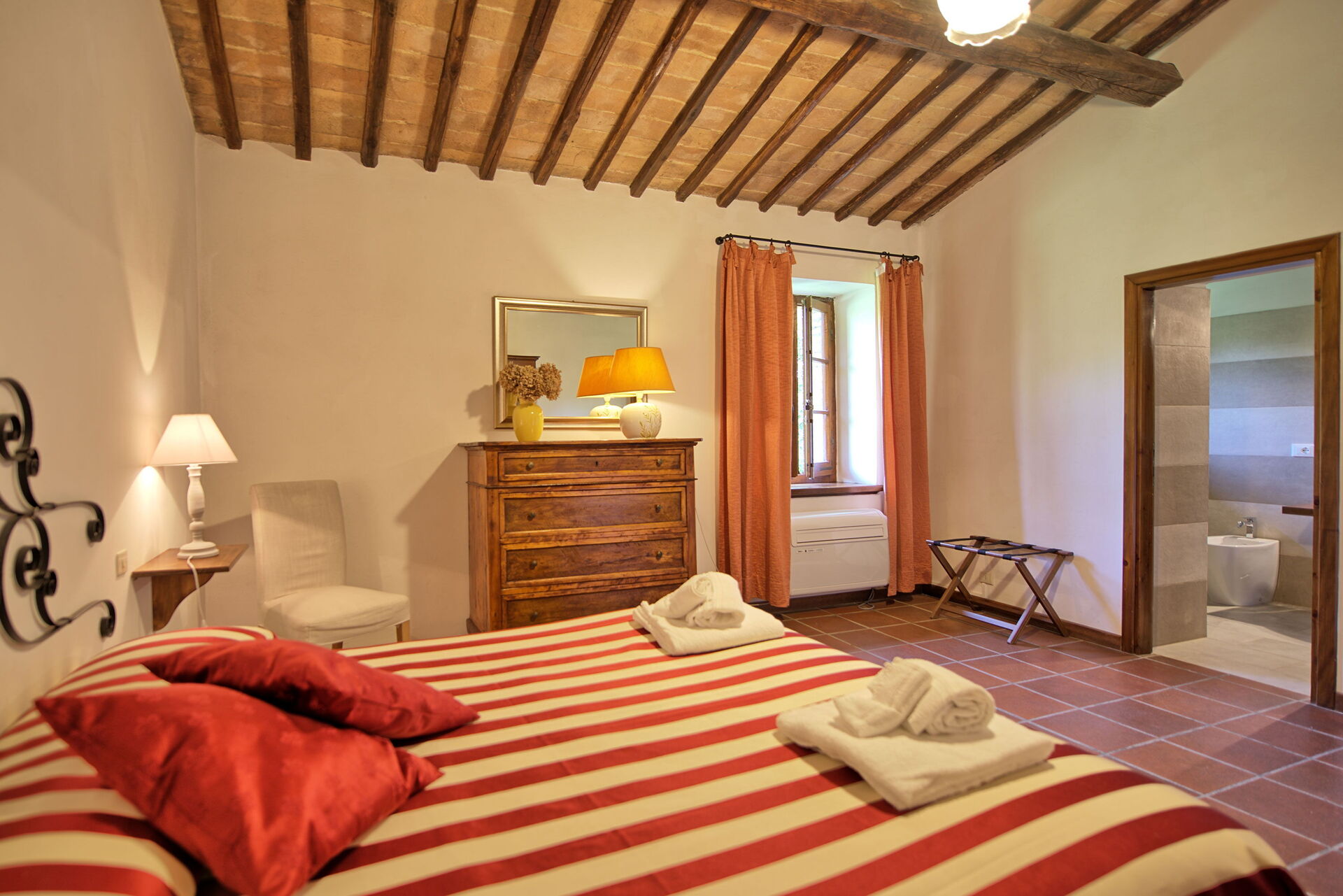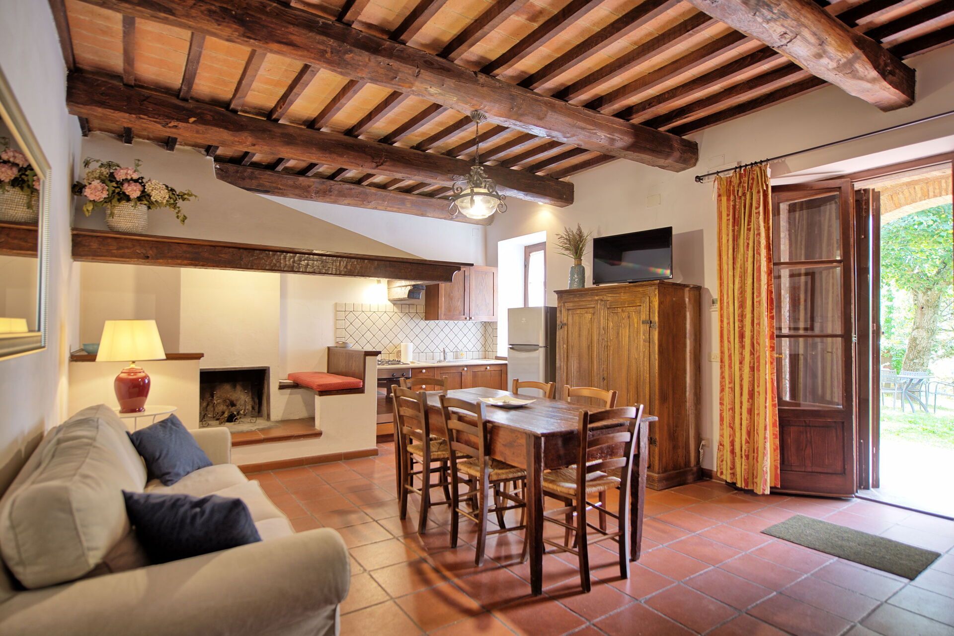 The stone house offers splendid 360° views of the Tuscan countryside. It has been painstakingly renovated, preserving original details like large fireplaces, terra cotta floors and wooden-beamed ceilings.