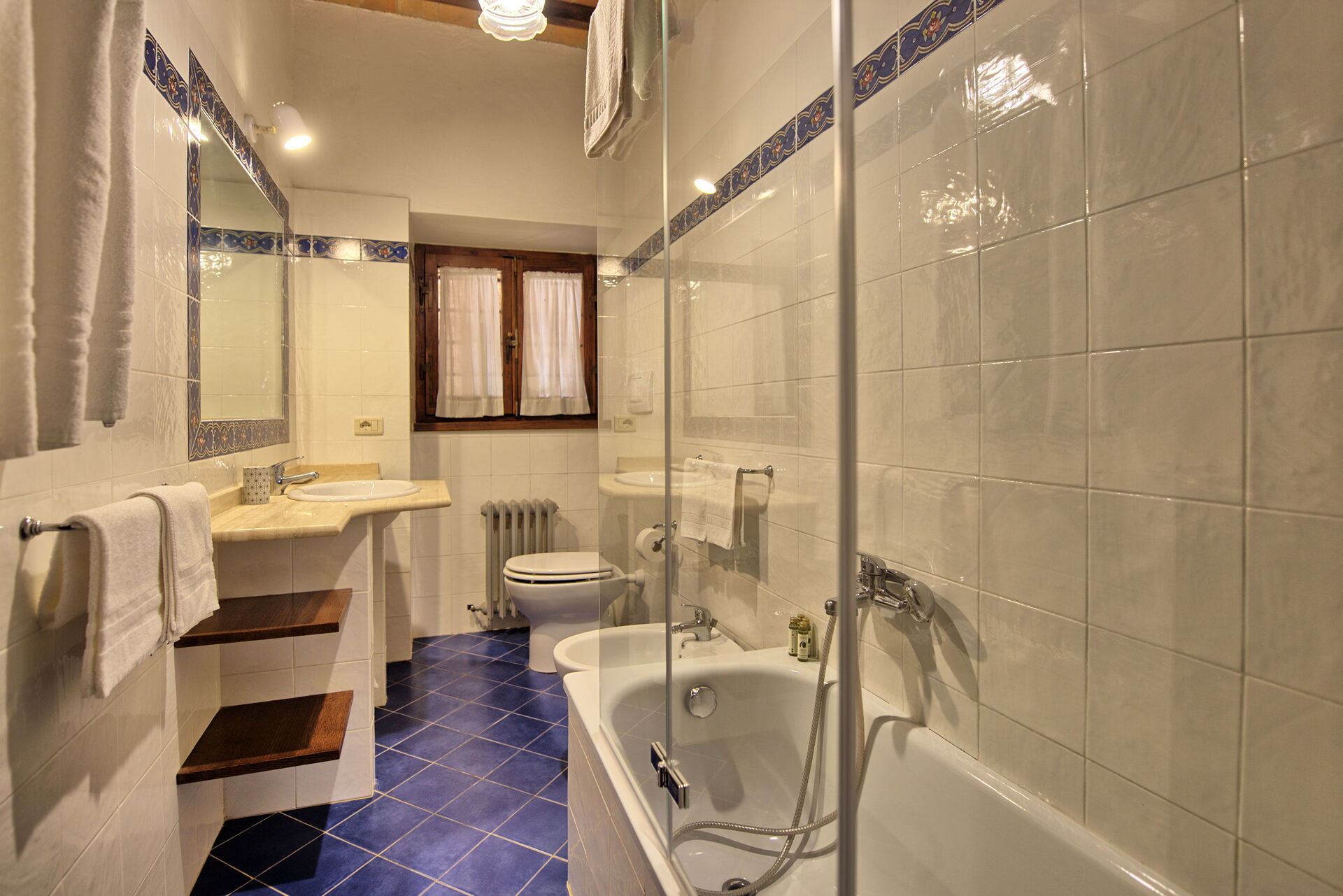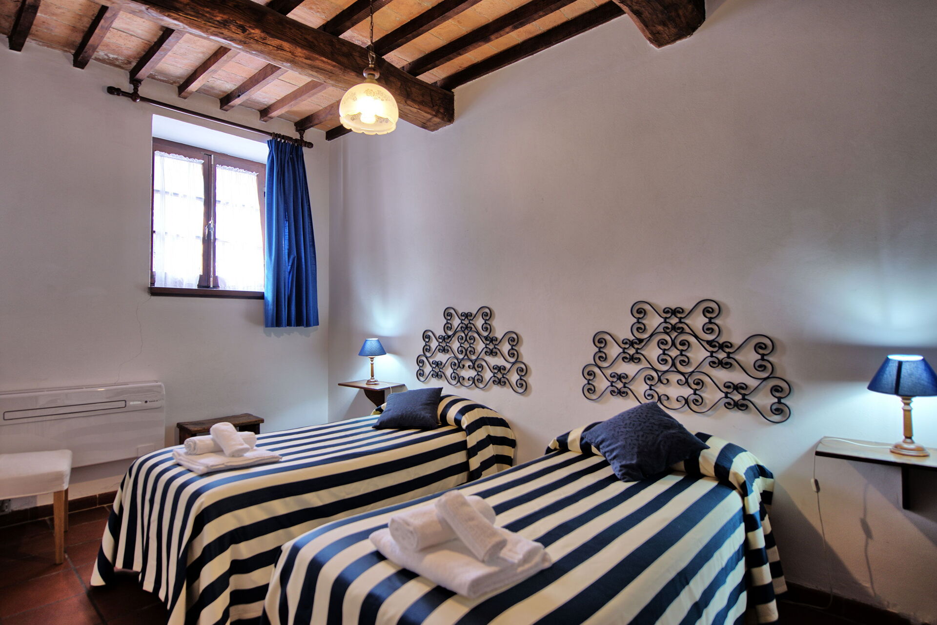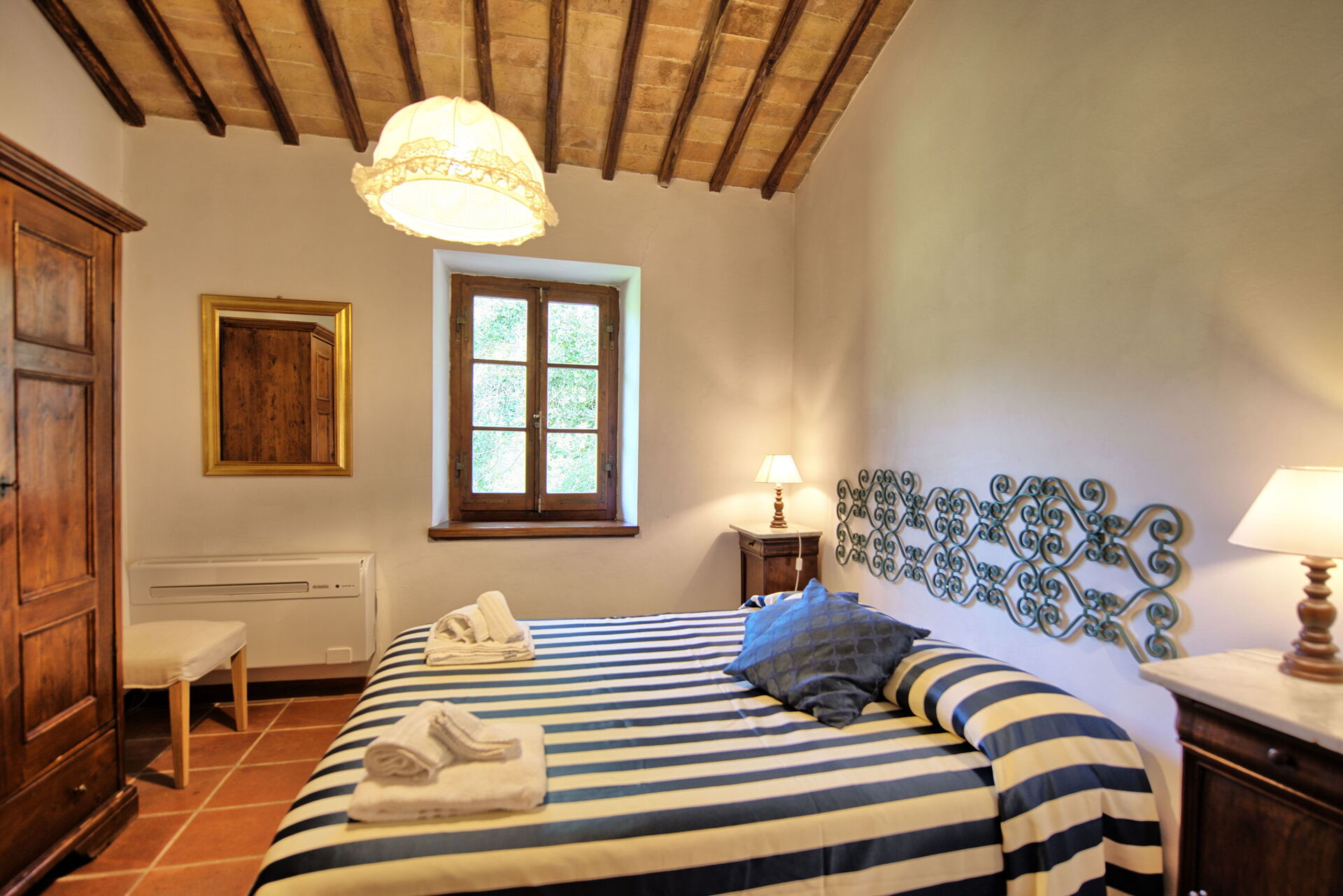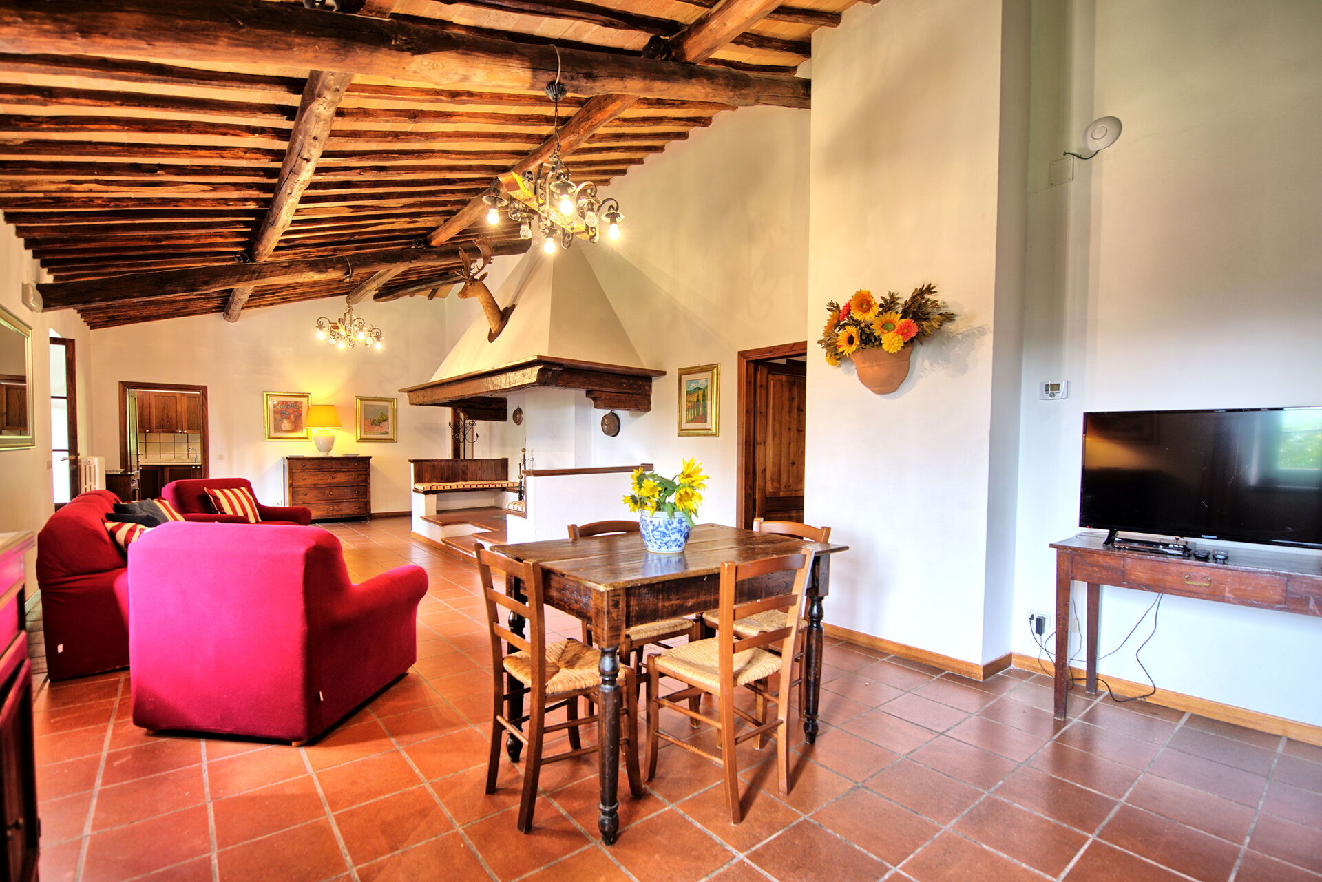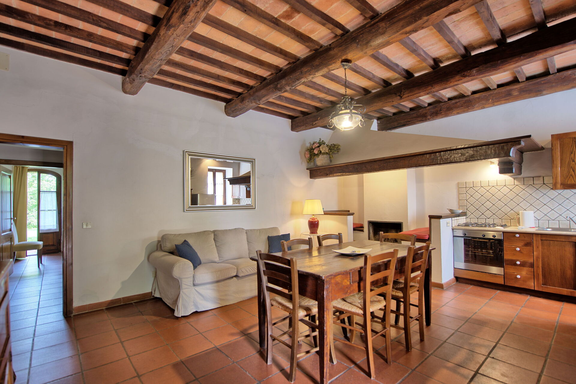 The stone house offers splendid 360° views of the Tuscan countryside. It has been painstakingly renovated, preserving original details like large fireplaces, terra cotta floors and wooden-beamed ceilings.