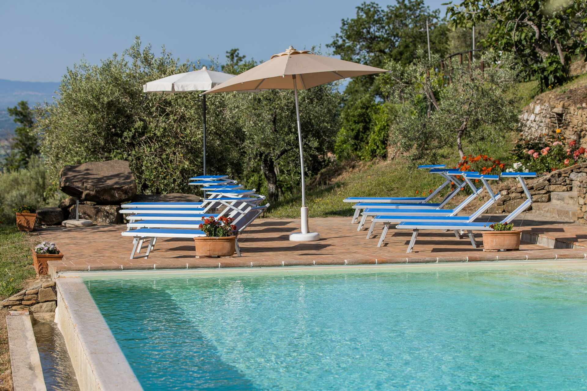This stunning vacation farmhouse rental is nestled in the hills among farm fields, woods and olive groves. It has a lovely garden lush with plants and flowers, tended by the owners themselves. The beautiful private pool and sunbathing area with sun loungers are perfect for relaxing under the Tuscan sun and enjoying the panoramic views. A large area furnished with a barbecue, wood burning oven, table and chairs is at guests’ disposal for savoring outdoor meals in the peaceful Tuscan countryside, while admiring the beautiful, world famous hills.