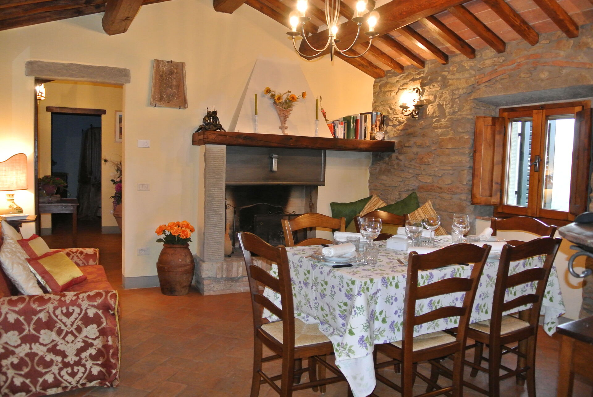 The property dates back to the beginning of the 1400s, and has been completely renovated while keeping the original architecture intact. It is a typical rustic style Tuscan farmhouse (exposed wooden beams, terra cotta floors, use of wood and local stone). Inside, this beautiful vacation house rental offers air conditioning, Wifi internet, appliances, and common areas.