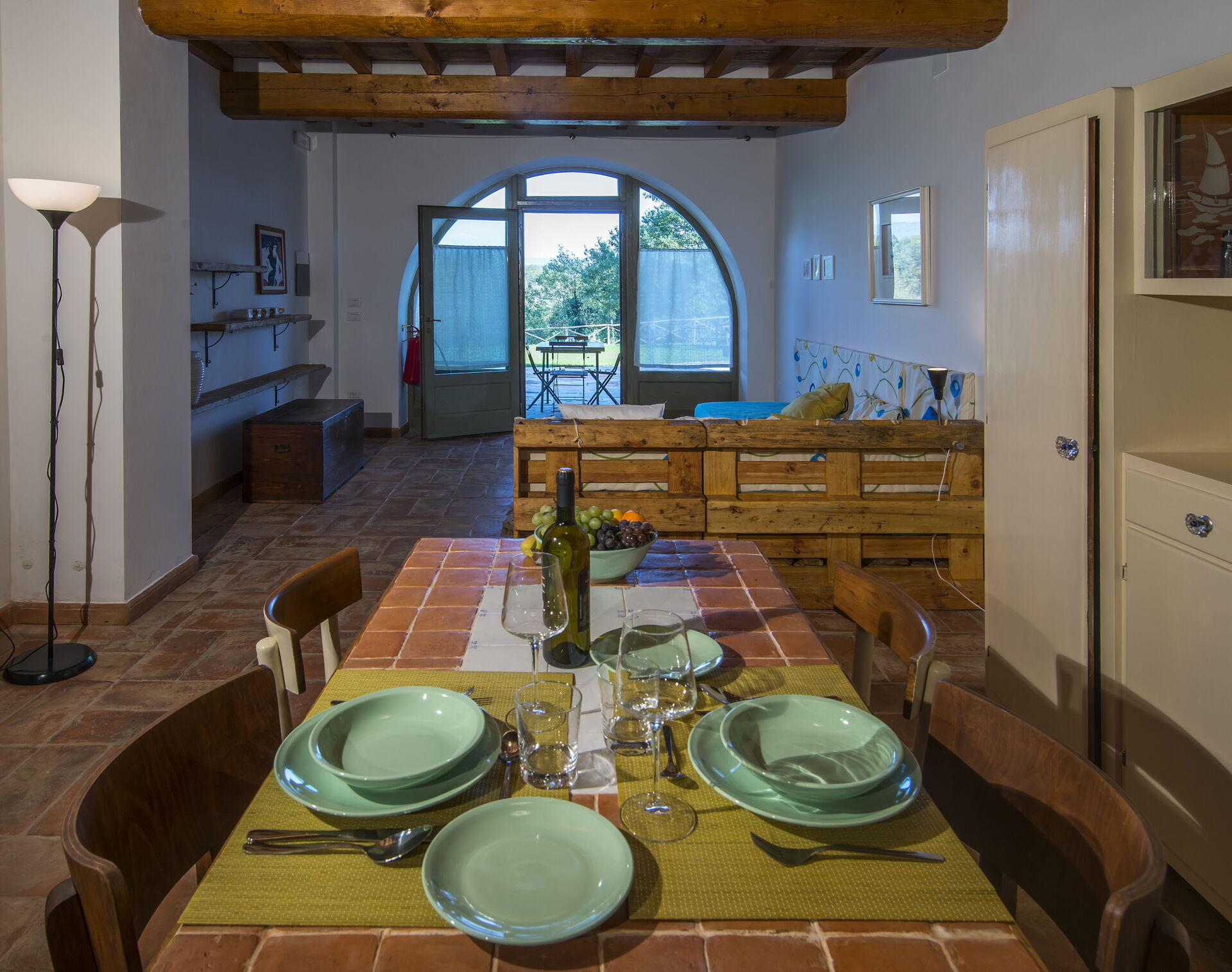 Private, furnished outdoor space with table and chairs.