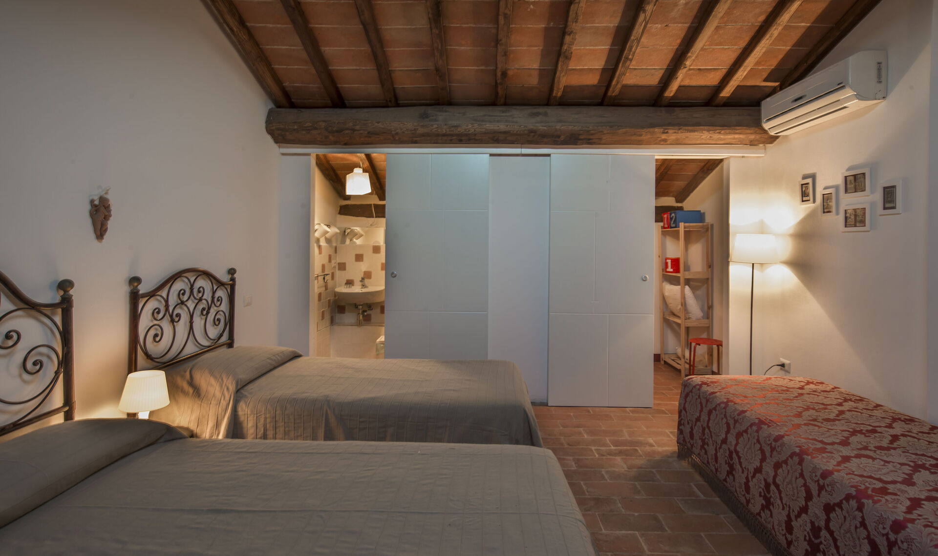 First floor: spacious living area with a living room (with an extra double sofa bed available upon request) and access to a loft with a double bed (convertible to 2 single beds upon request), a single bed and a bathroom with shower; dining area with kitchen (dishwasher, oven, refrigerator, induction cooktop, microwave, coffee maker, fan), double bedroom, bathroom with shower.