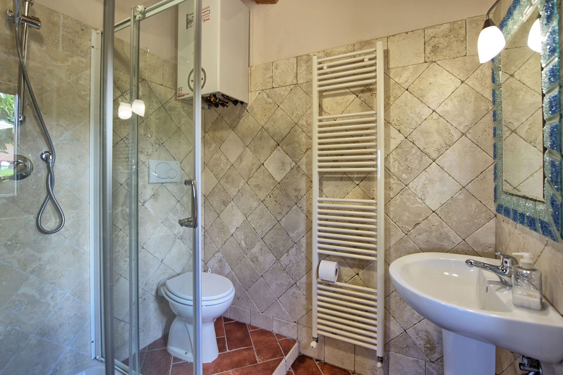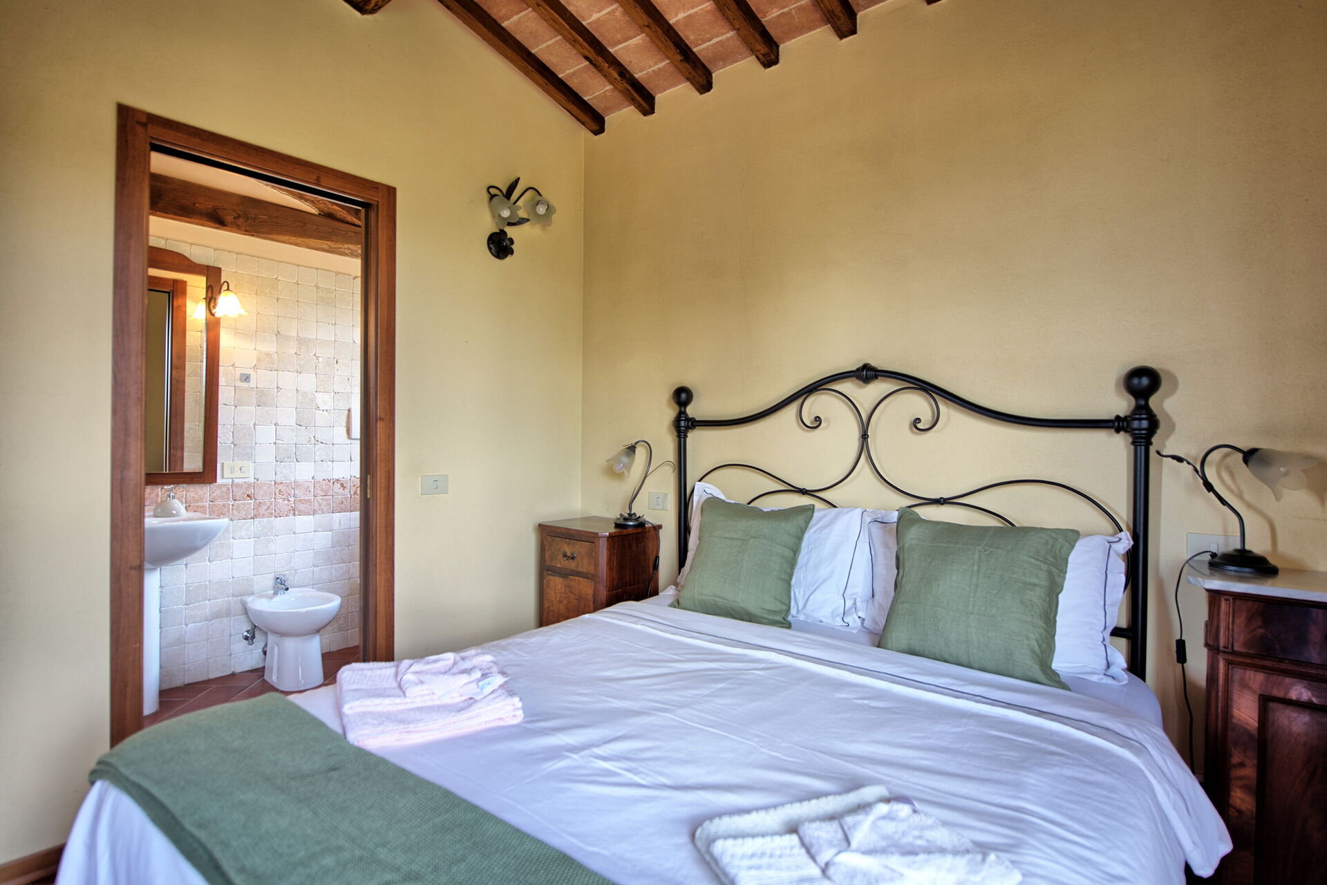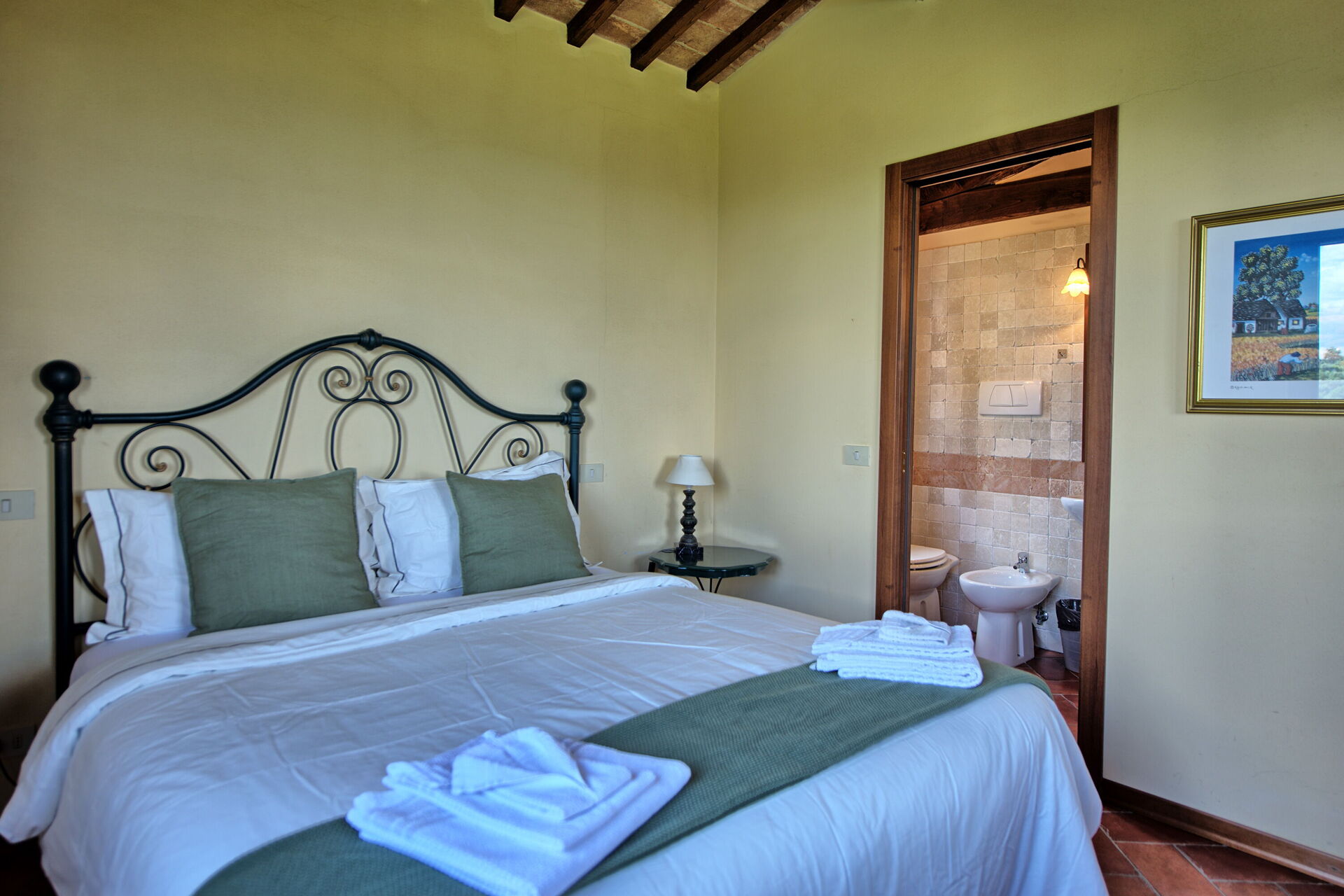 Ground floor: queen bedroom with ensuite bathroom with shower, twin bedroom with two large single beds with ensuite bath with shower. Both bedrooms have spectacular views of the beautiful Valdichiana valley and the town of Lucignano.