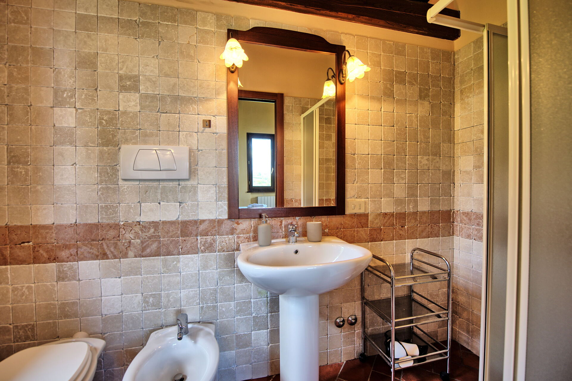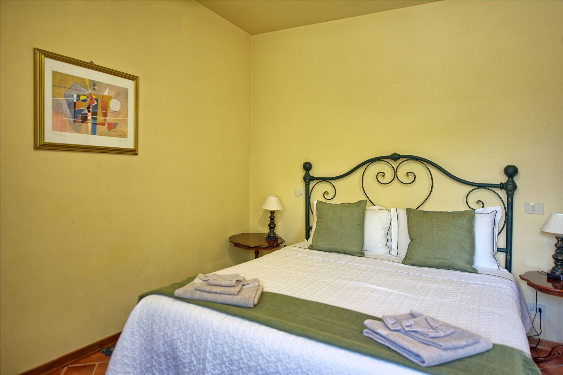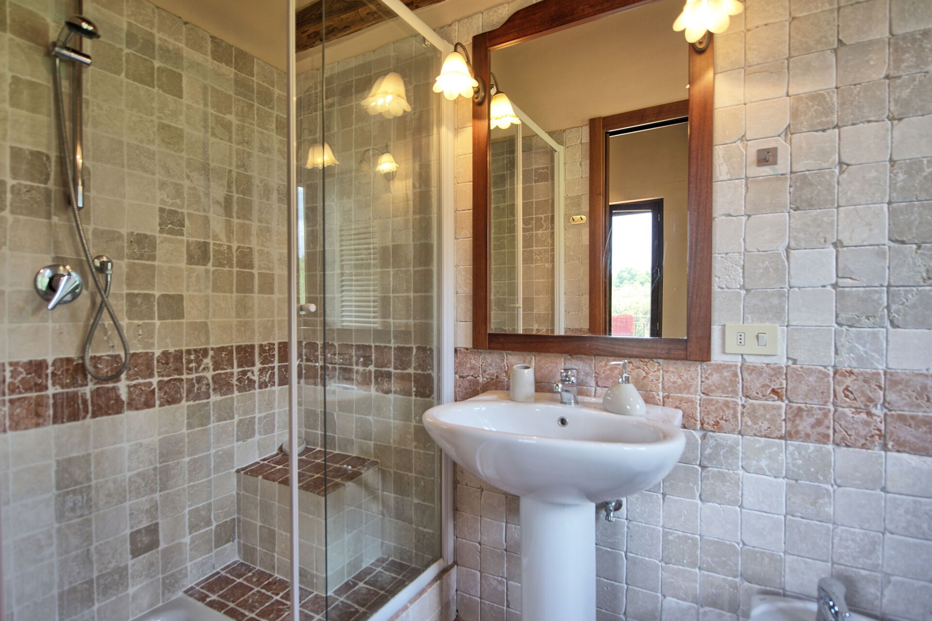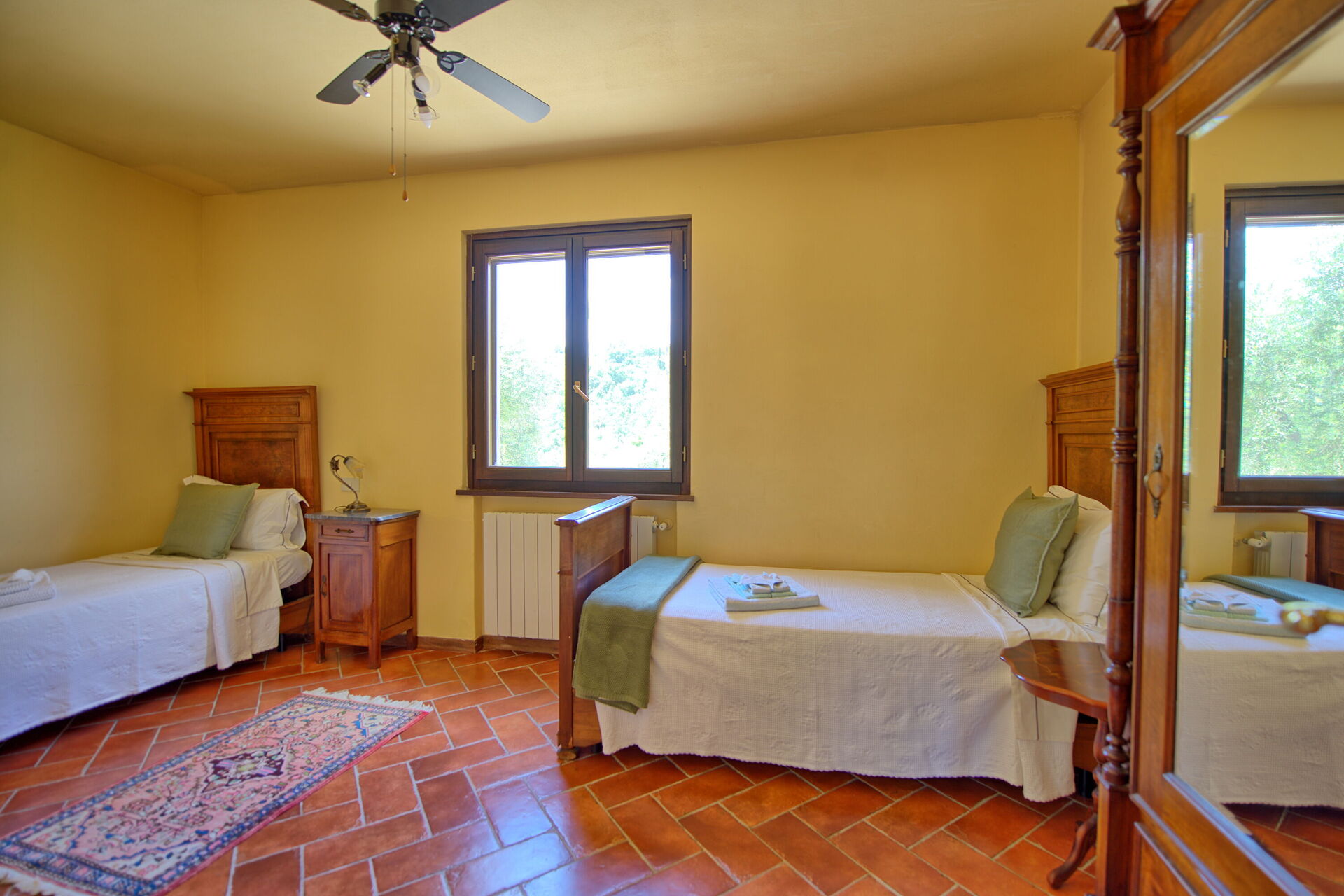 Ground floor: queen bedroom with ensuite bathroom with shower, twin bedroom with two large single beds with ensuite bath with shower. Both bedrooms have spectacular views of the beautiful Valdichiana valley and the town of Lucignano.