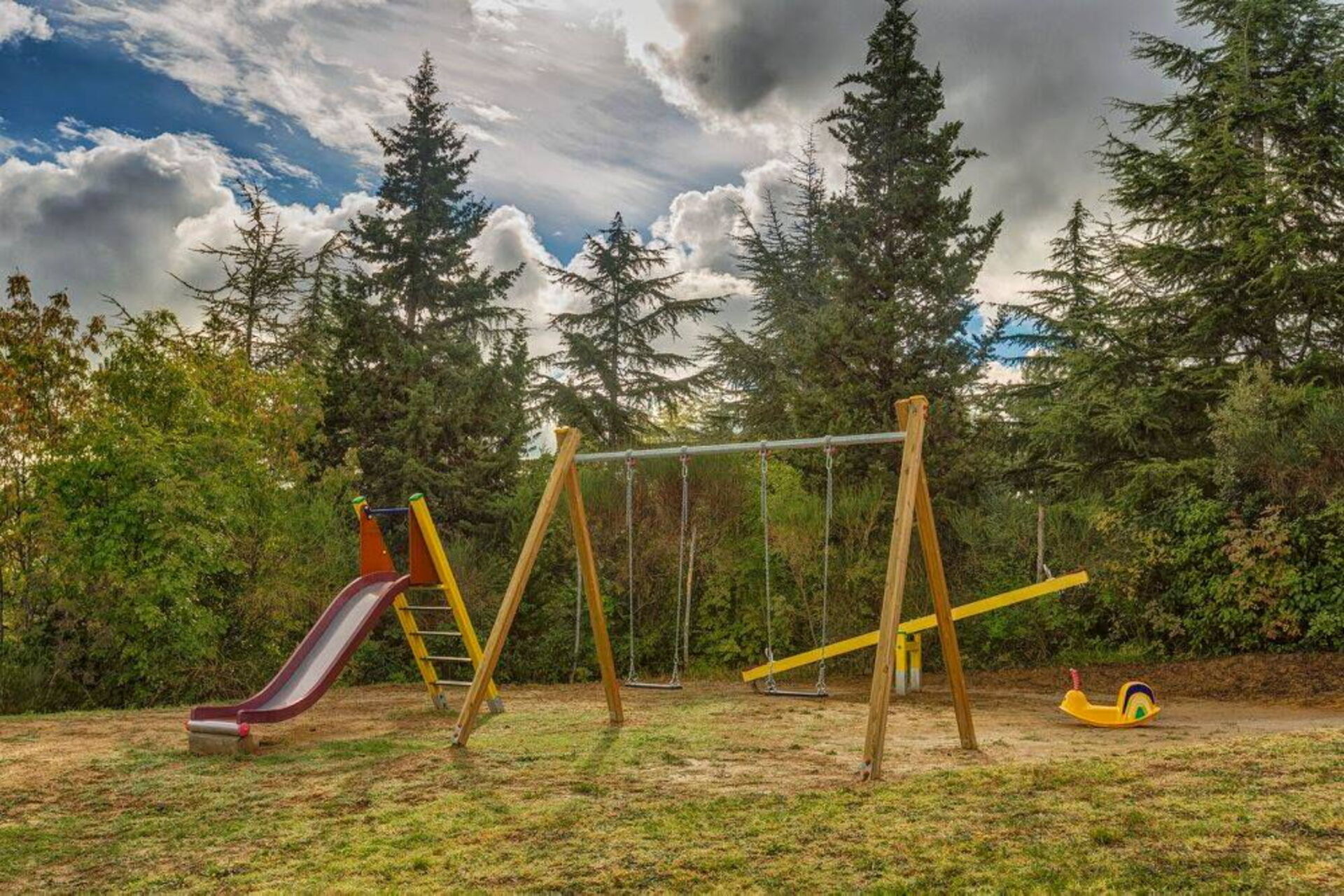 Each of the Tuscan-style apartments has a private outdoor space with a dining area. The expansive property sits in a peaceful location with gorgeous scenic views of the surrounding hills. If you are looking for a place in Tuscany with panoramic views, Leccino and its 5 apartments won’t let you down. There are large outdoor areas with walking paths, a gated pool, a children’s play area, and a scenic terrace in the shade of a large oak tree with spectacular views of the hills, mountains, villages, woods and farm fields.