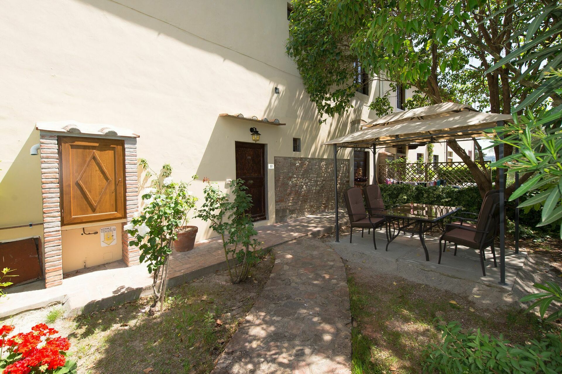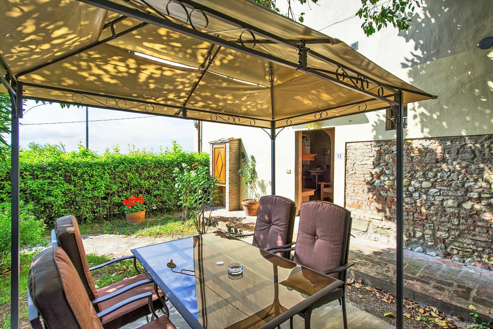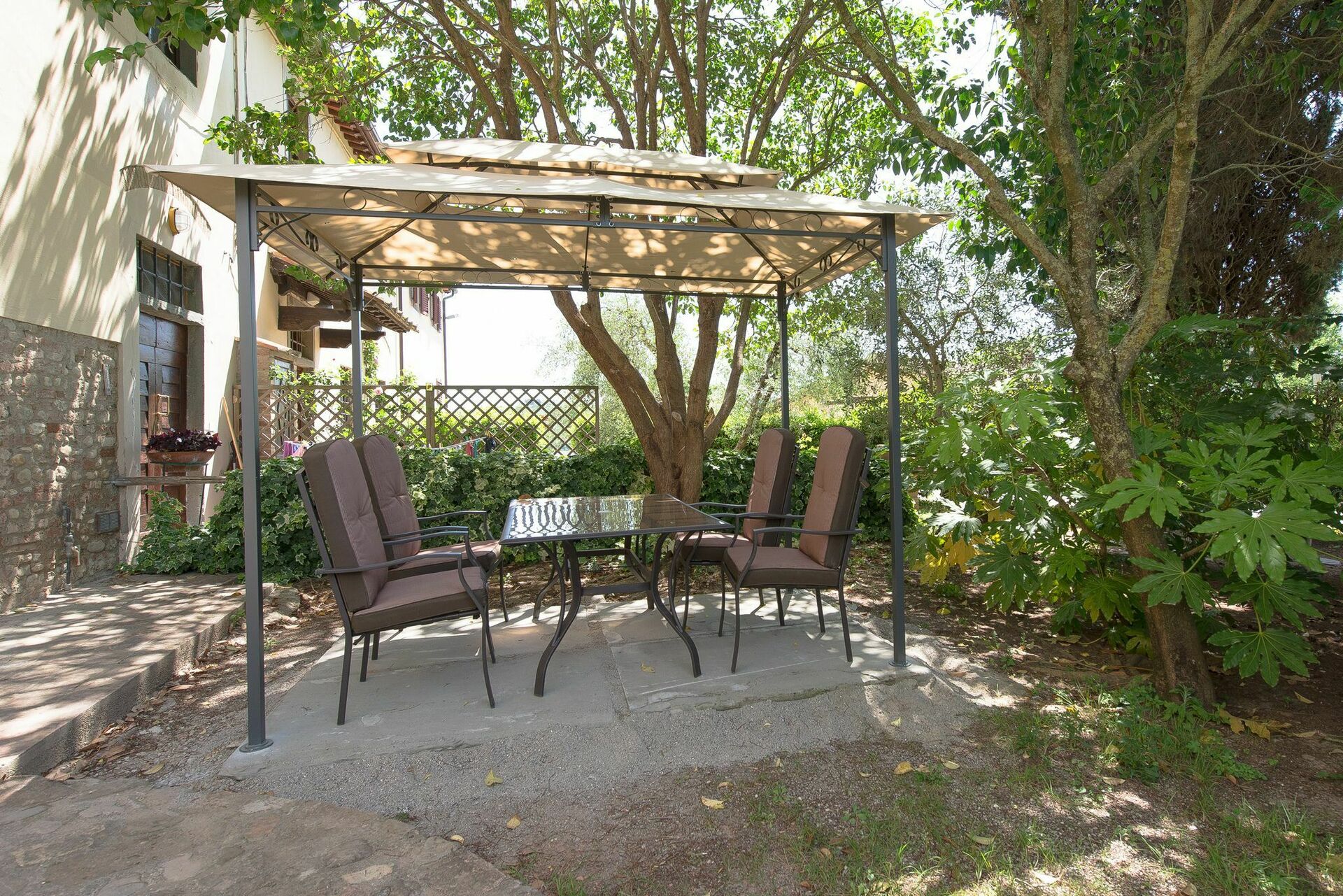 Personal, furnished outdoor area with gazebo, table and chairs.