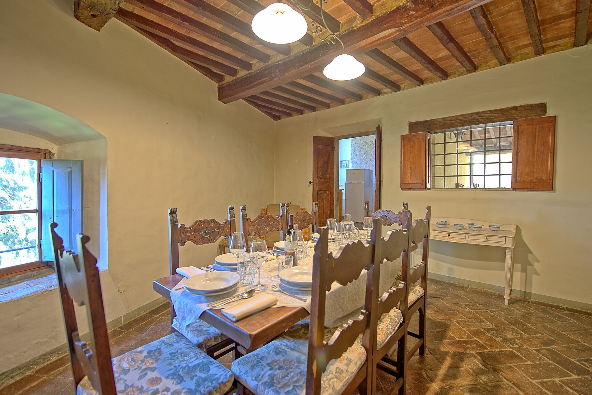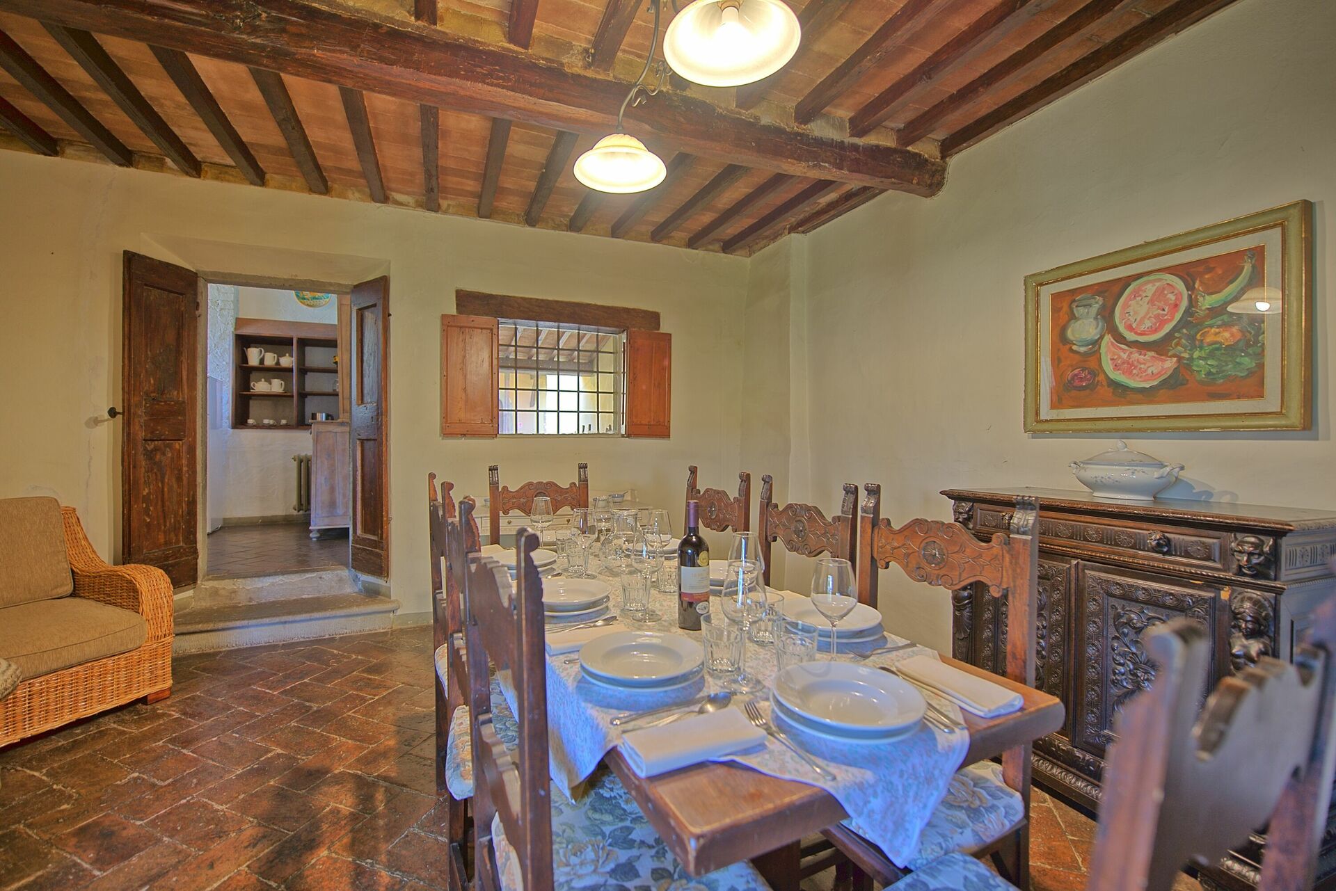 Some steps higher: dining-room with access to the kitchen and to a nice terrace furnished for outdoor meals looking over one of the courtyards of the castle.