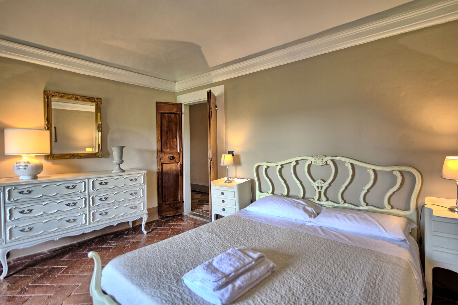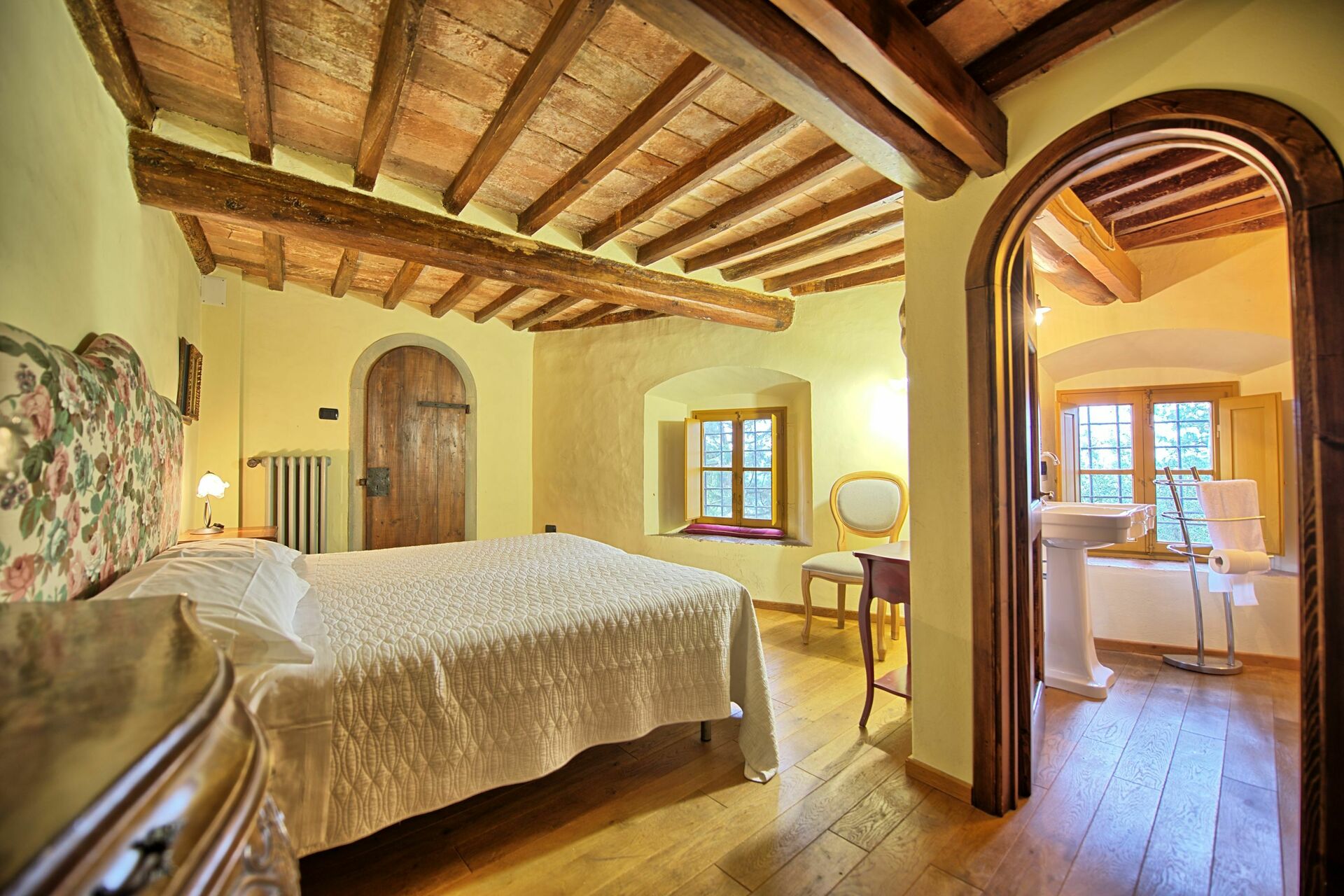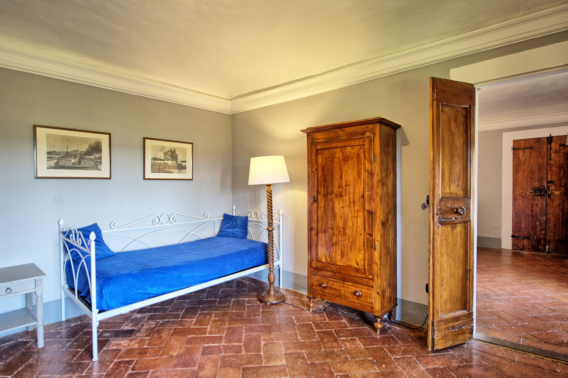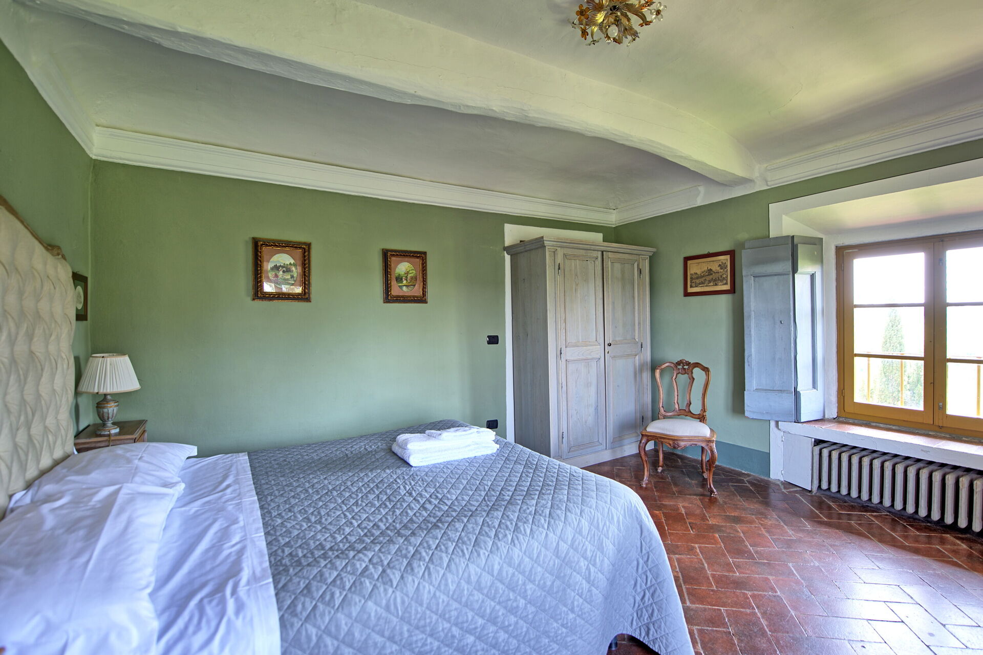 Ground floor: large entrance once used as “sale d’armes”, spacious and bright living-room with beautiful frescoed ceilings, fireplace (non working) with frescoes of Pucci dating back to 1700 ad access, through 6 big French windows, to the charming Italian garden, bathroom with shower.