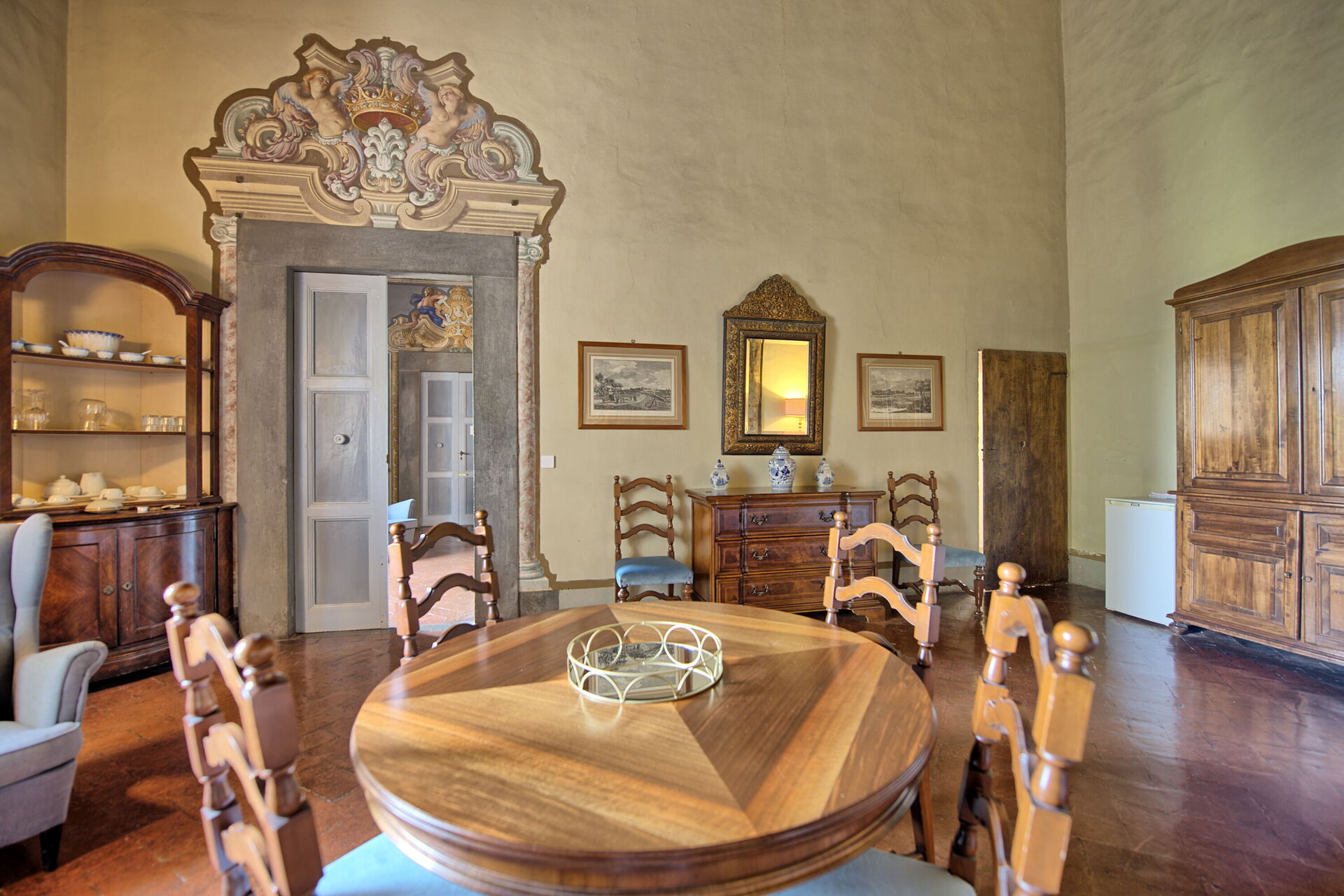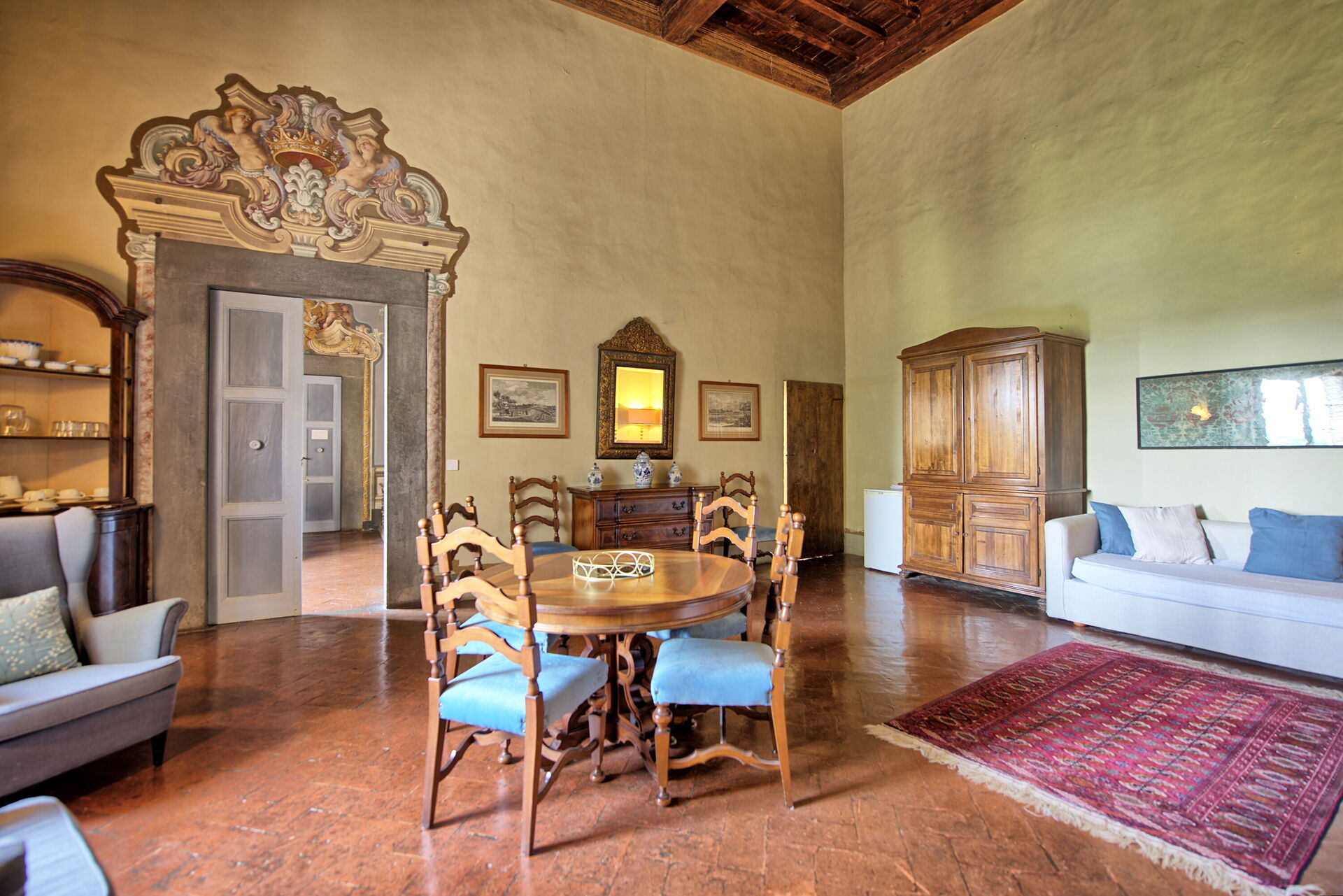 Ground floor: large living-room with beautiful ancient tapestry and dining area, kitchen corner and 2 sofa-beds, double bedroom with antique furniture and Venetian chandelier dating back to the 18th century (not working), bathroom with shower.