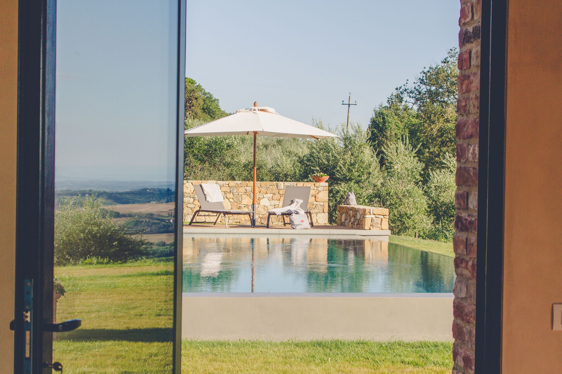 Outside on the grounds, guests can enjoy the large, well-tended garden, and a private pool with sweeping panoramic views, umbrellas and sun loungers: the perfect place to relax and cool off on sunny summer days with friends and family.