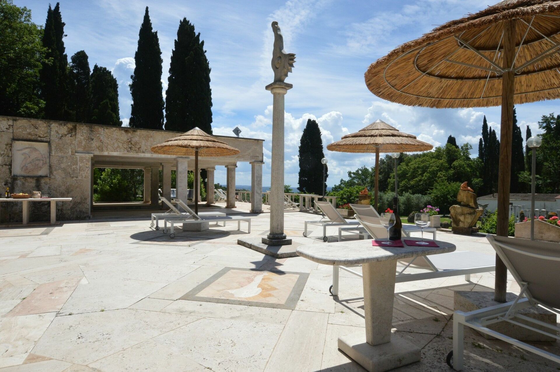 Guests have at their disposal large outdoor spaces, and 2 outdoor pools: one is covered by a lovely travertine roof and heated to 36° using natural geothermal heat. This heated pool makes swimming pleasant even during the cooler months!