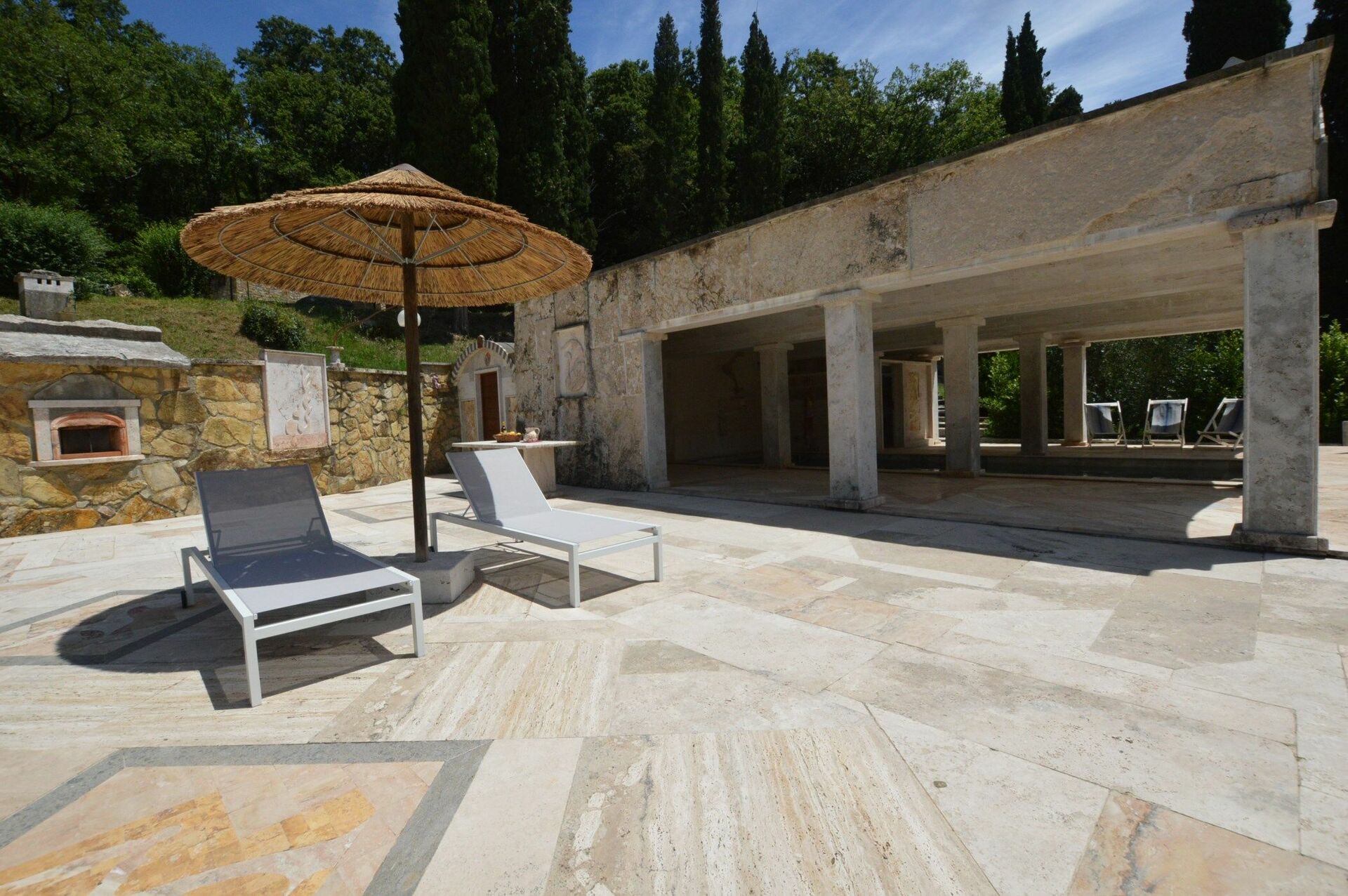 - large travertine sunbathing area with sun loungers and umbrellas, shower (hot water)
