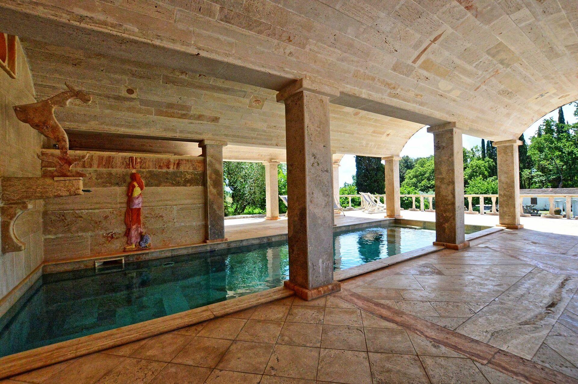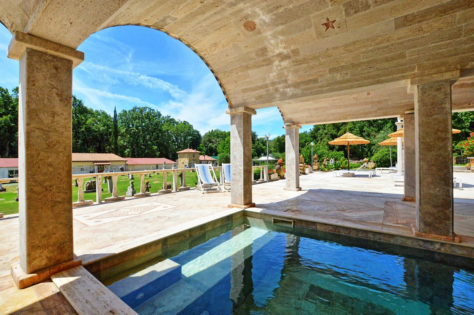 - pool with hot water (the water is 36° upon arrival) covered by a travertine vaulted ceiling (9 x 3 meters – depth 1,4 meters – open and available all year)