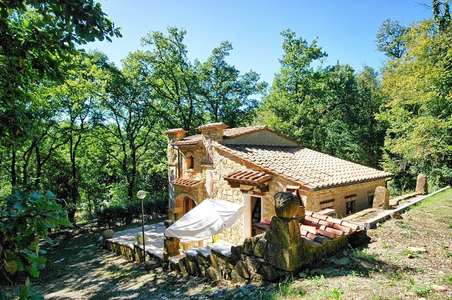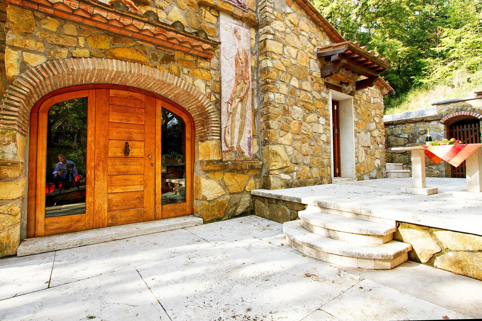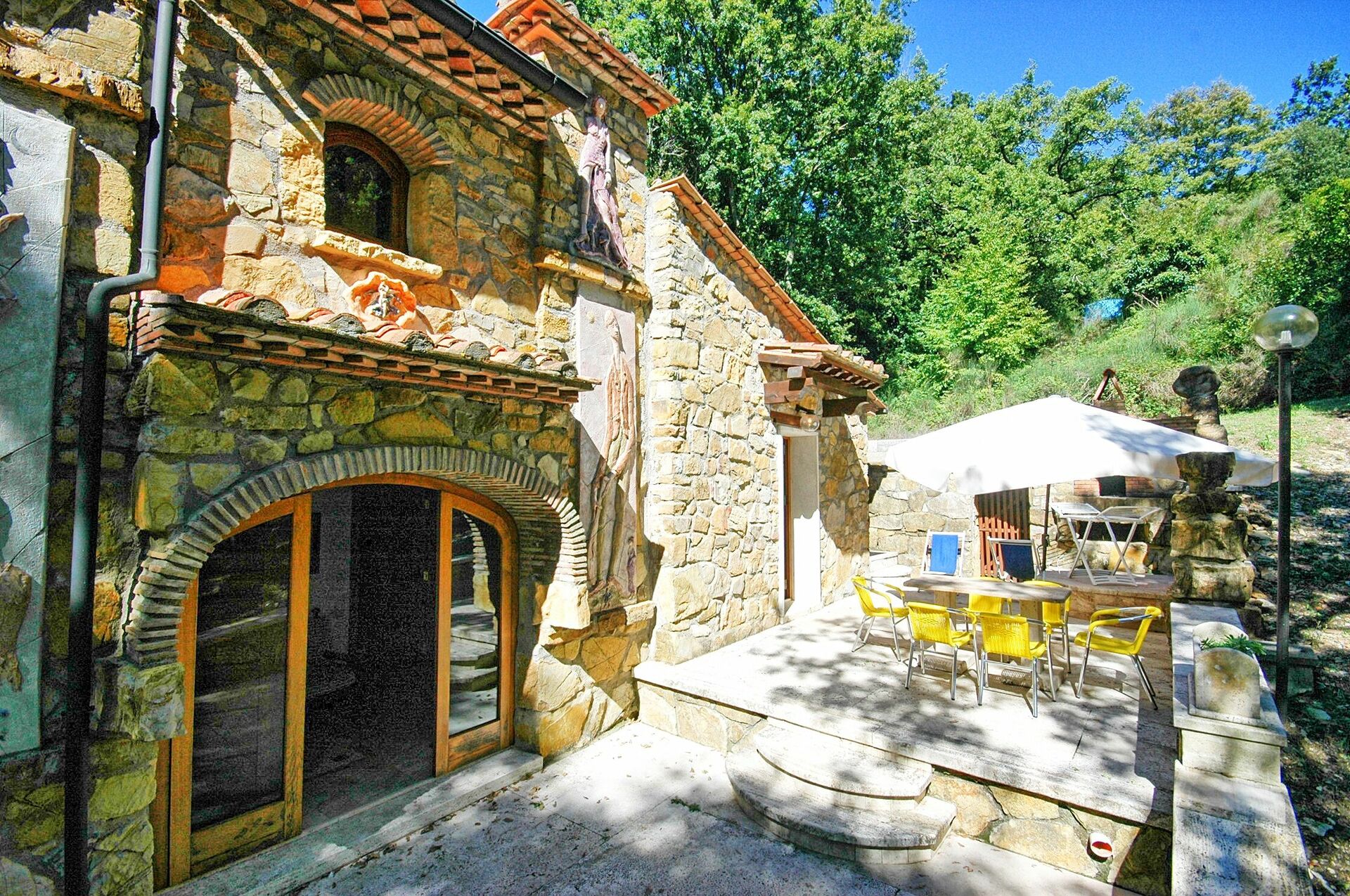 Private furnished terrace (30 square meters) with table, chairs, deckchairs and bread oven/barbecue.
