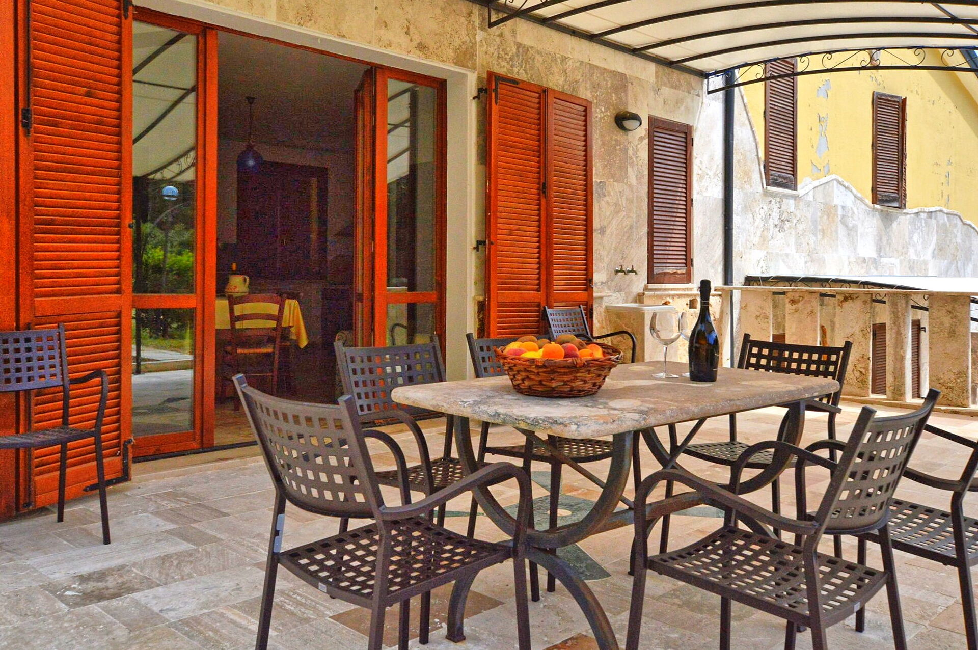 Ground floor: roomy living-room with double sofa-bed and dining area giving on to a large, partially shaded terrace, open kitchenette, bathroom with shower.