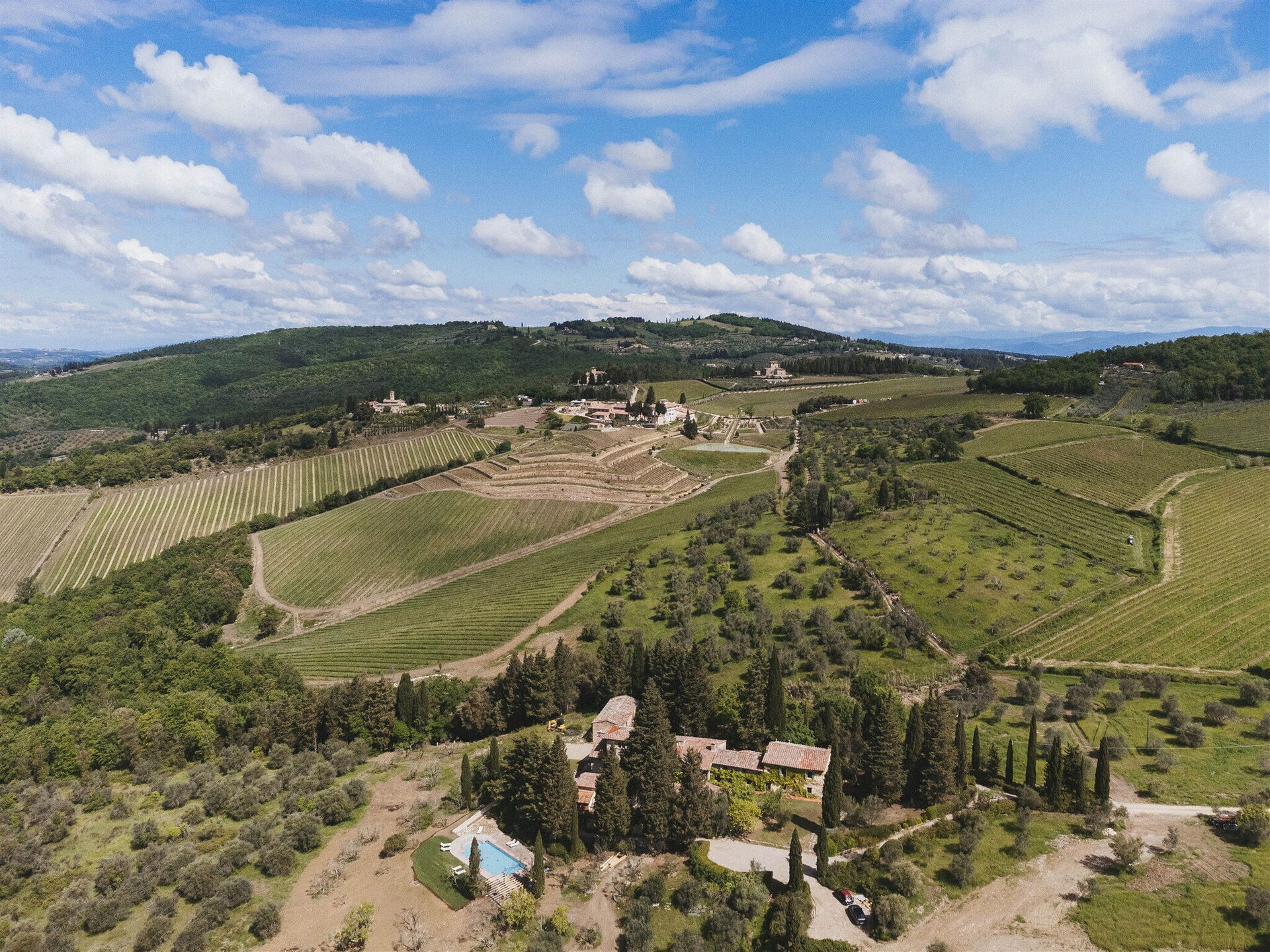 Complex of 6 comfortable vacation apartments in the hills of Panzano in Chianti, halfway between Florence and Siena in the heart of Chianti Classico, Tuscany.