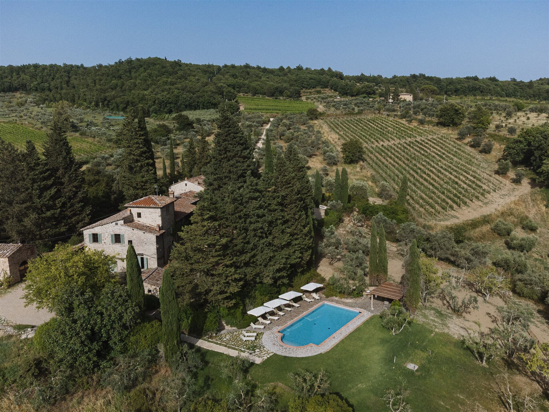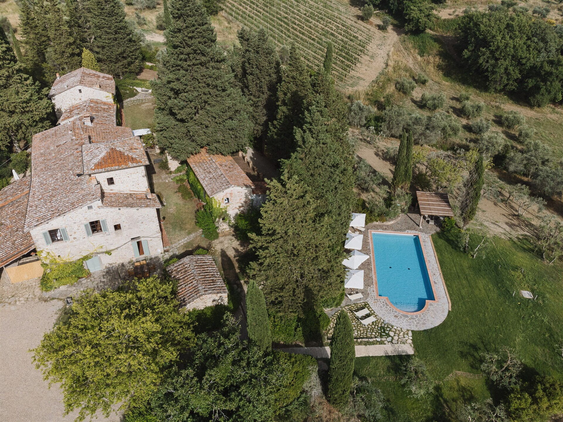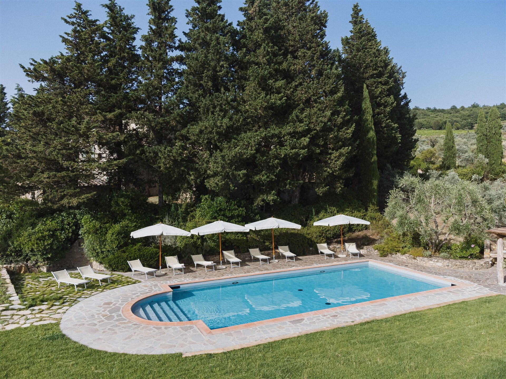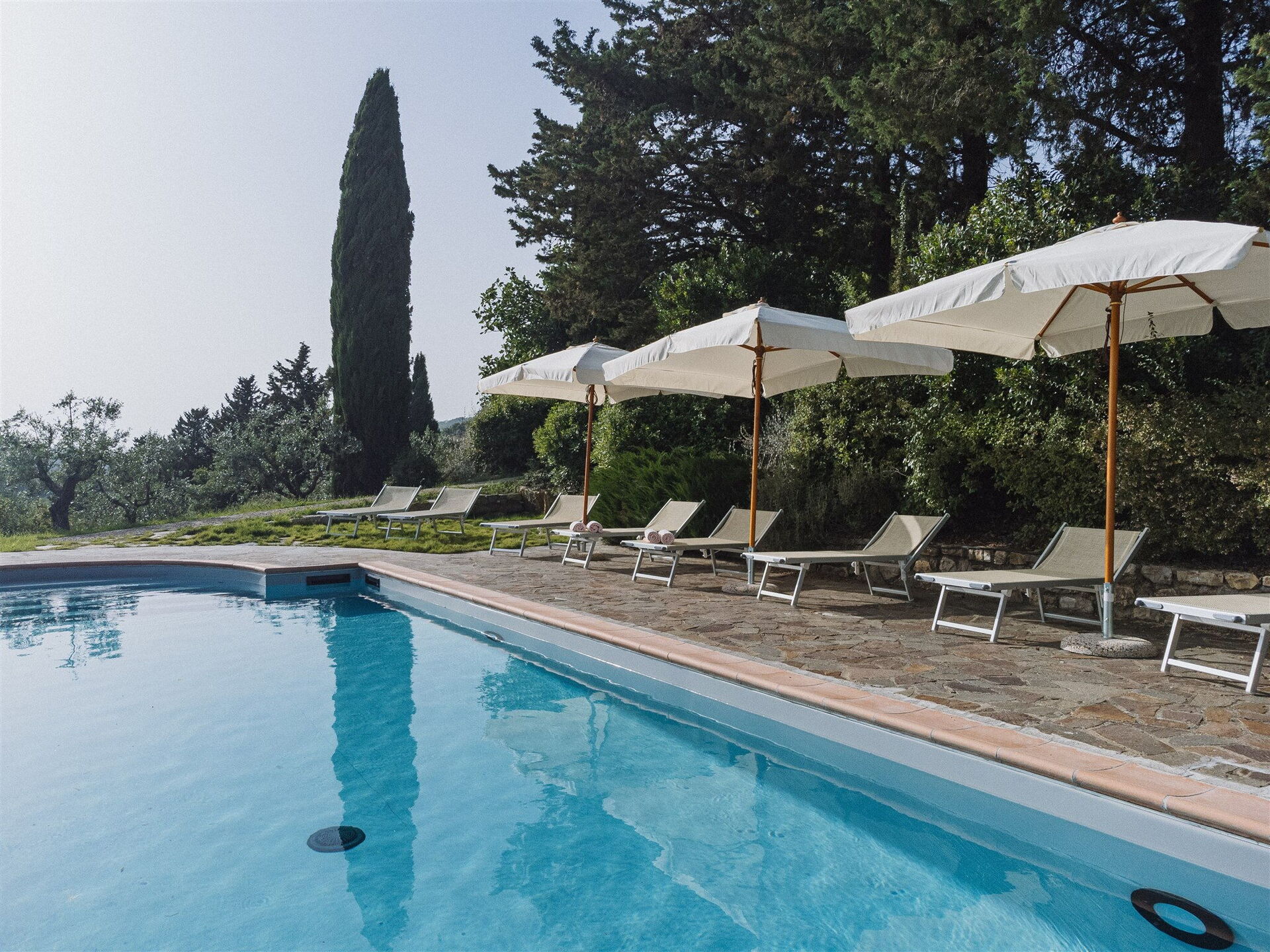 The ample grounds include a lovely pool with splendid panoramic views that is shared by all of the property guests; the pool looks out over the splendid vineyards of Chianti Classico, world famous for beautiful landscapes and the exceptional wines of its many farms and wineries.