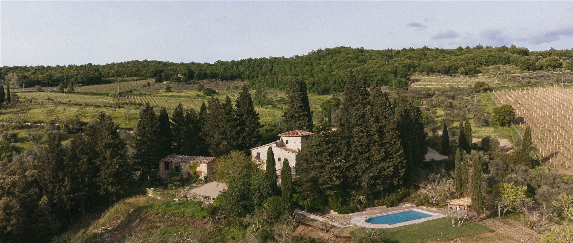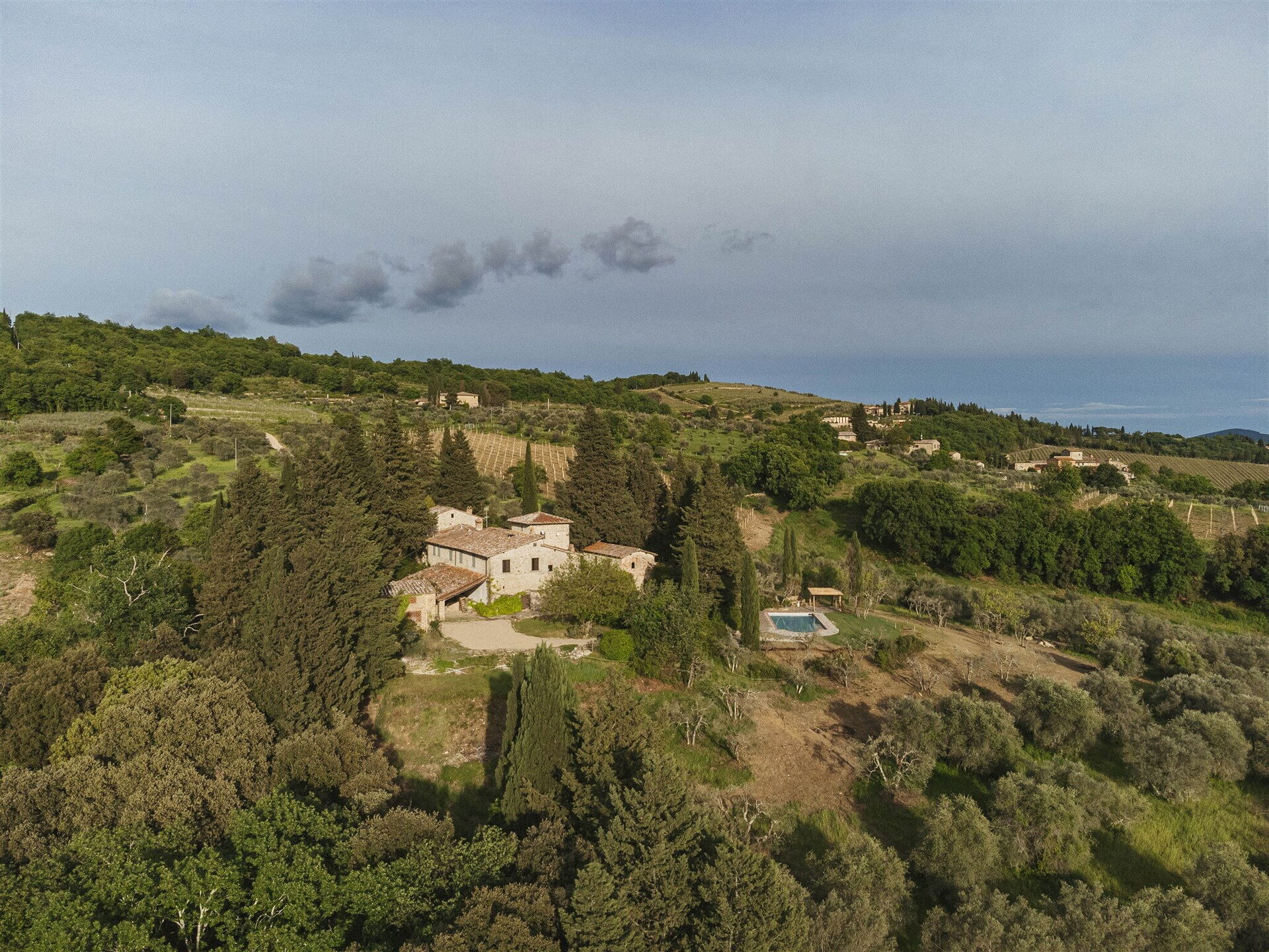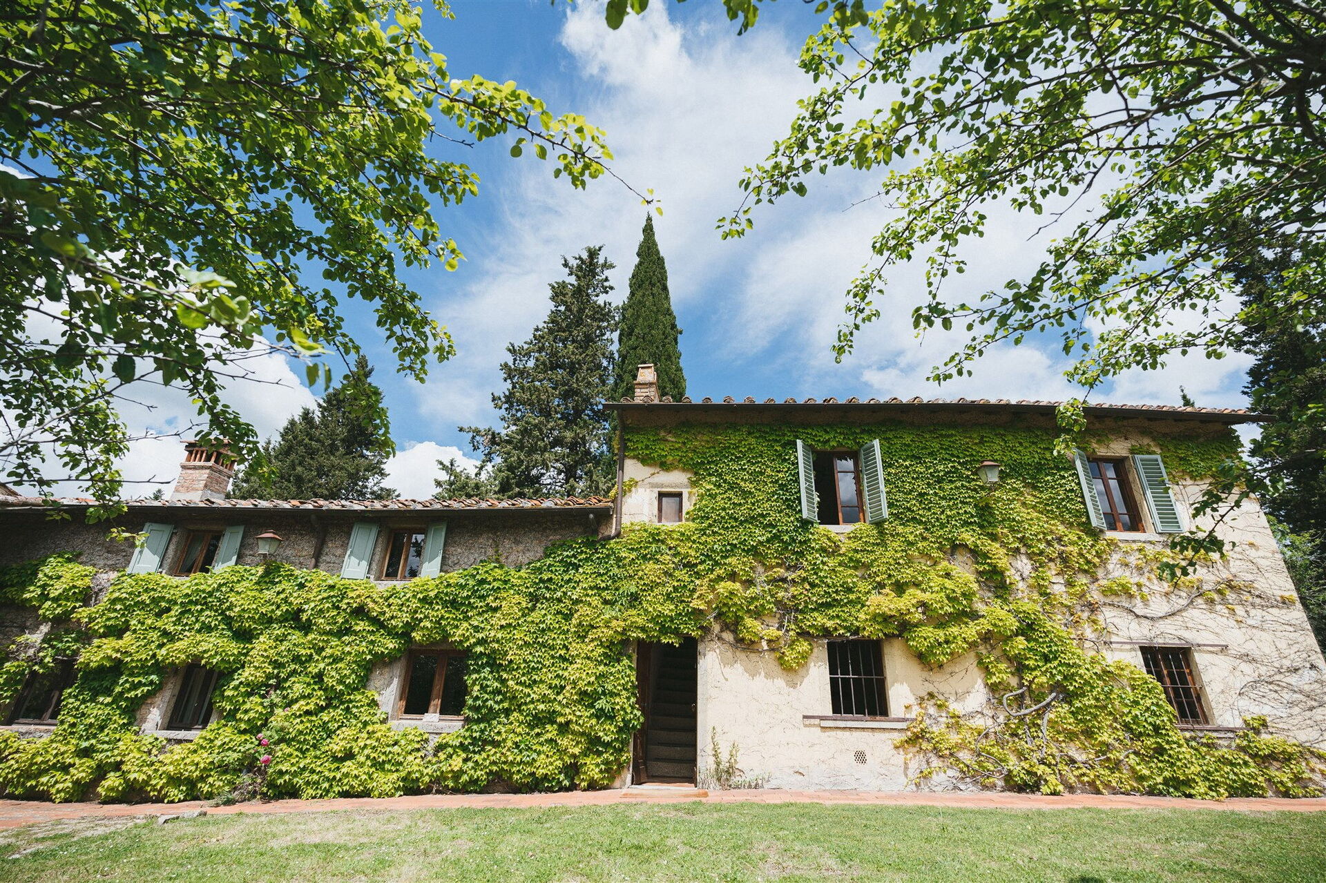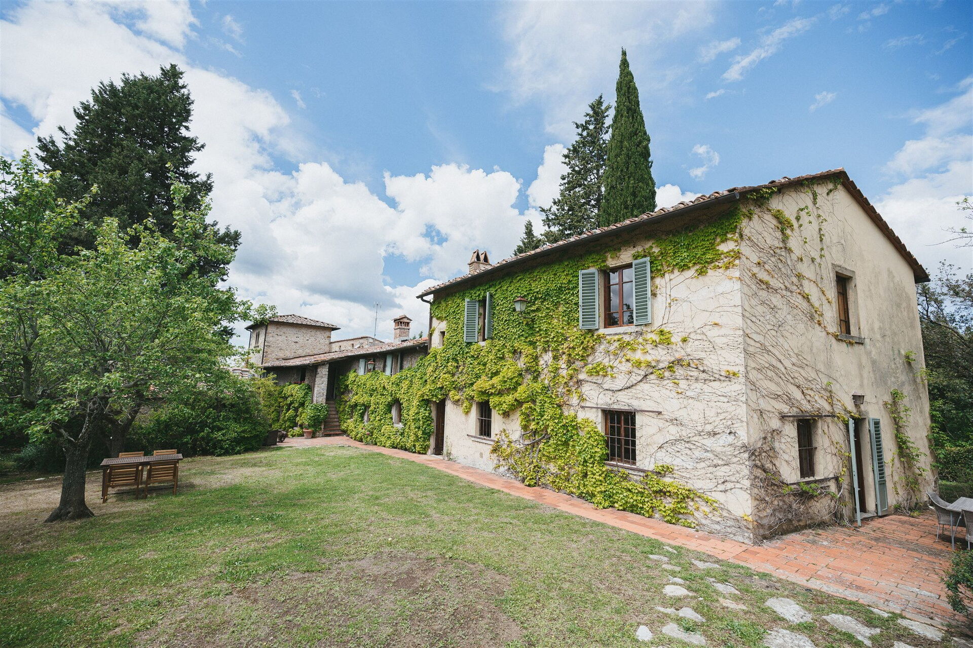 The ample grounds include a lovely pool with splendid panoramic views that is shared by all of the property guests; the pool looks out over the splendid vineyards of Chianti Classico, world famous for beautiful landscapes and the exceptional wines of its many farms and wineries.