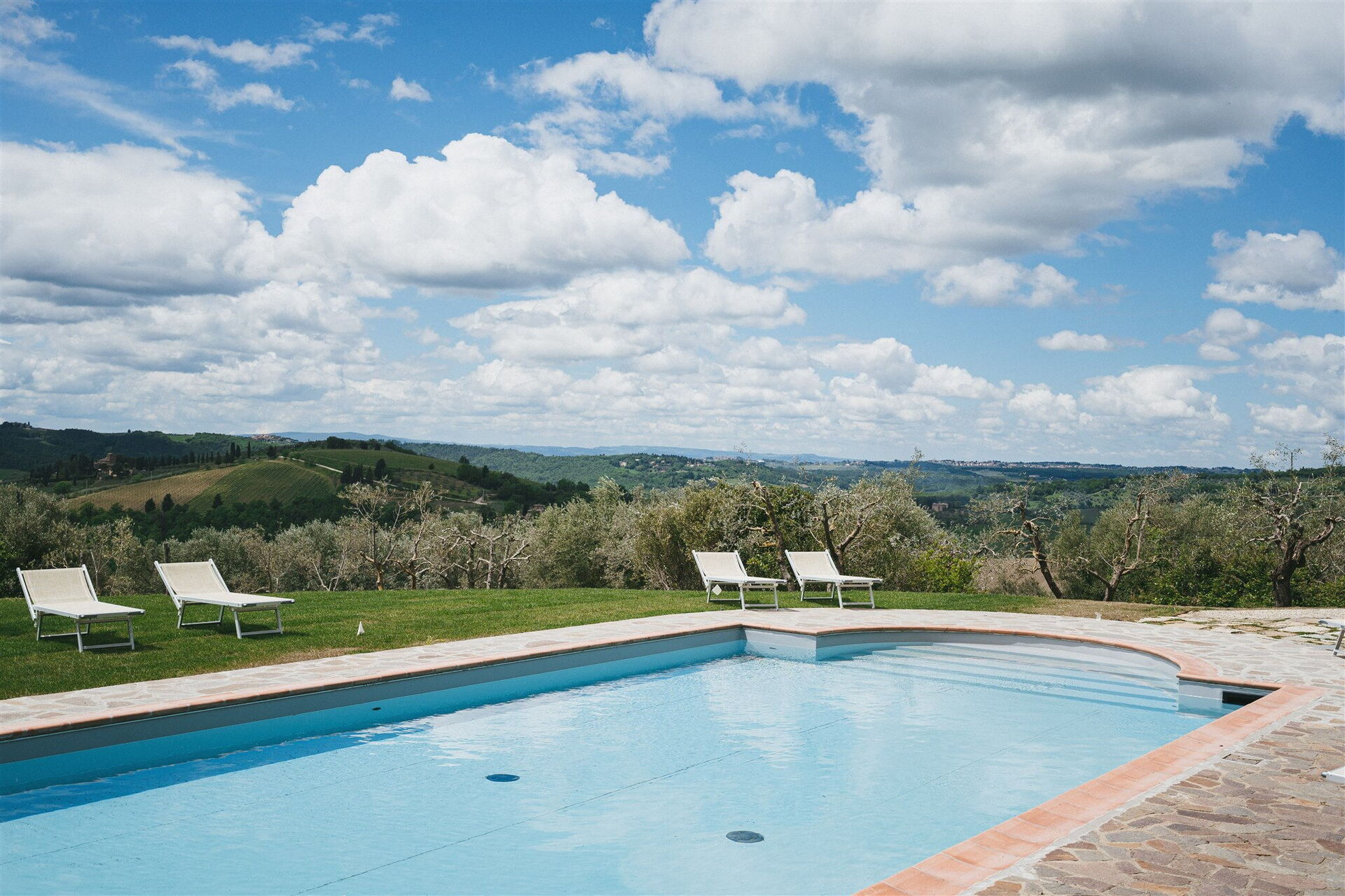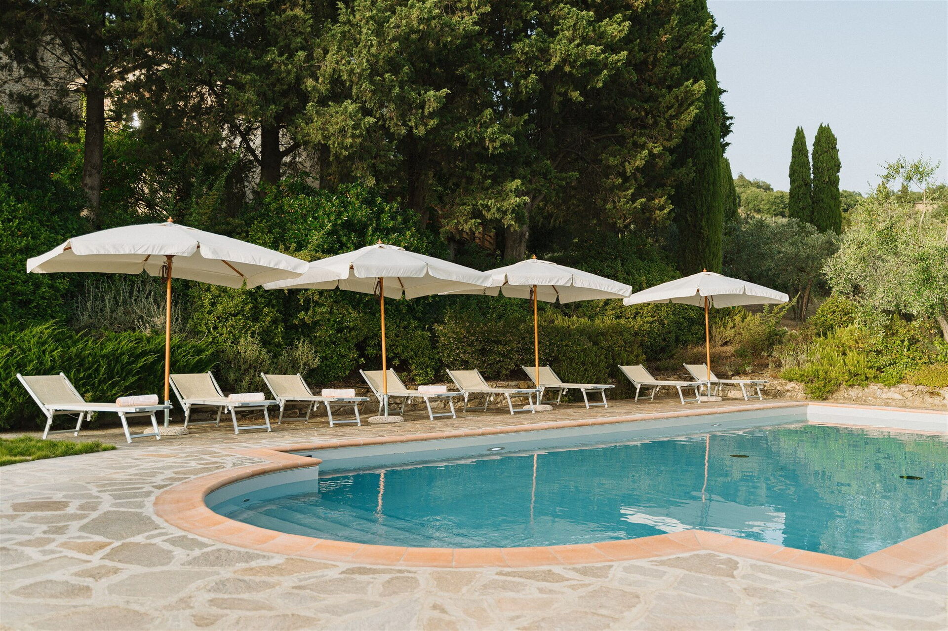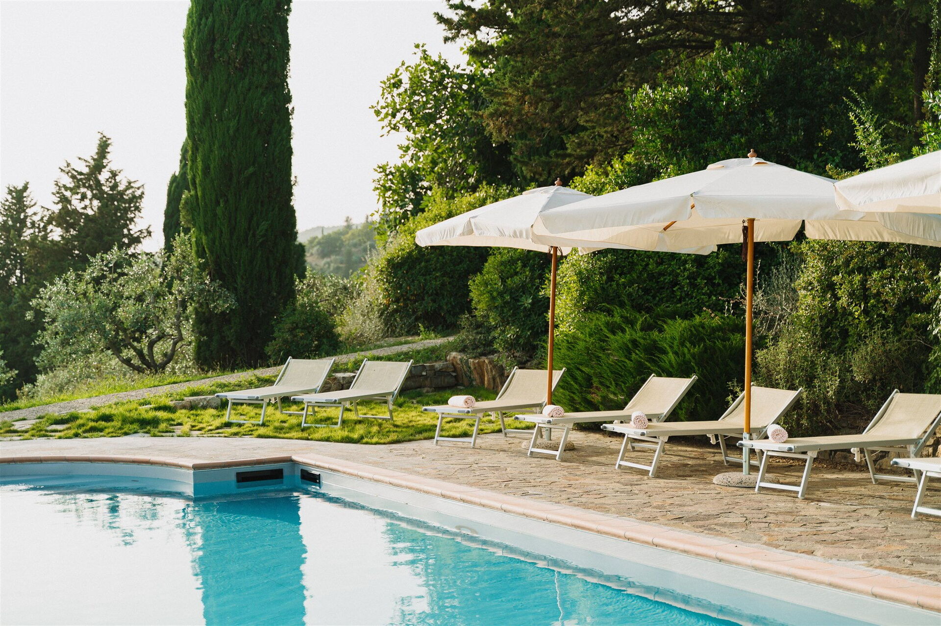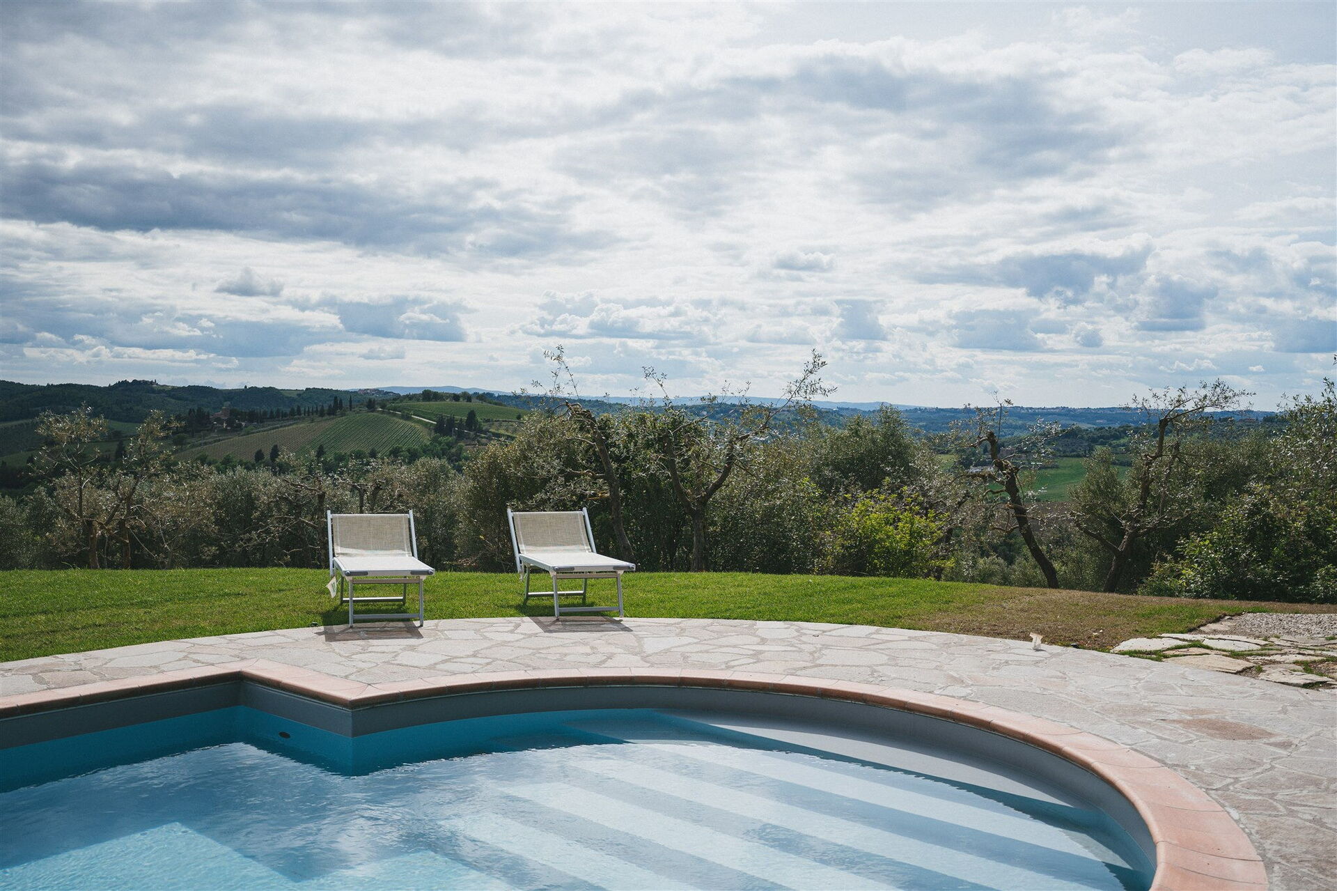 The ample grounds include a lovely pool with splendid panoramic views that is shared by all of the property guests; the pool looks out over the splendid vineyards of Chianti Classico, world famous for beautiful landscapes and the exceptional wines of its many farms and wineries.